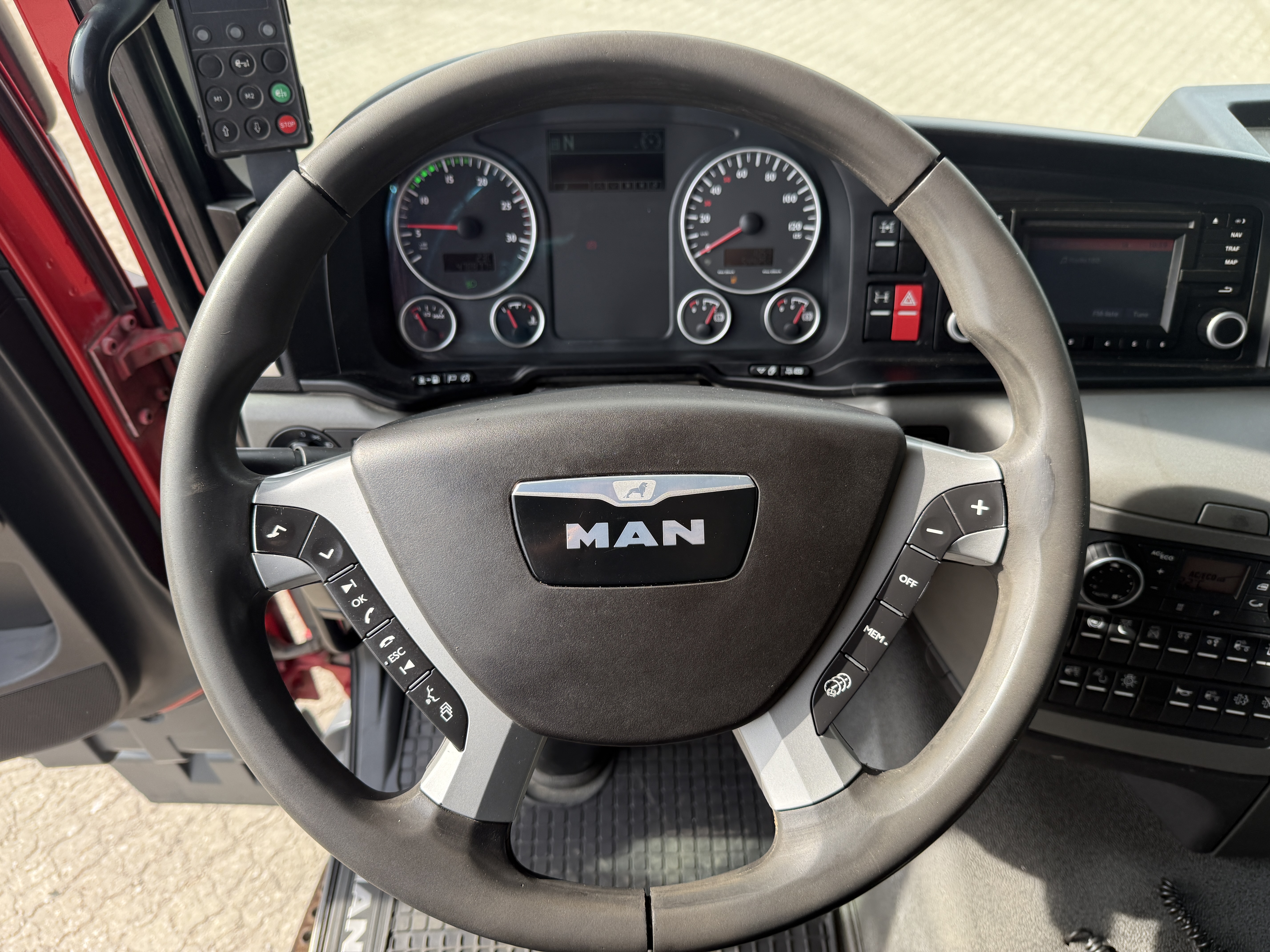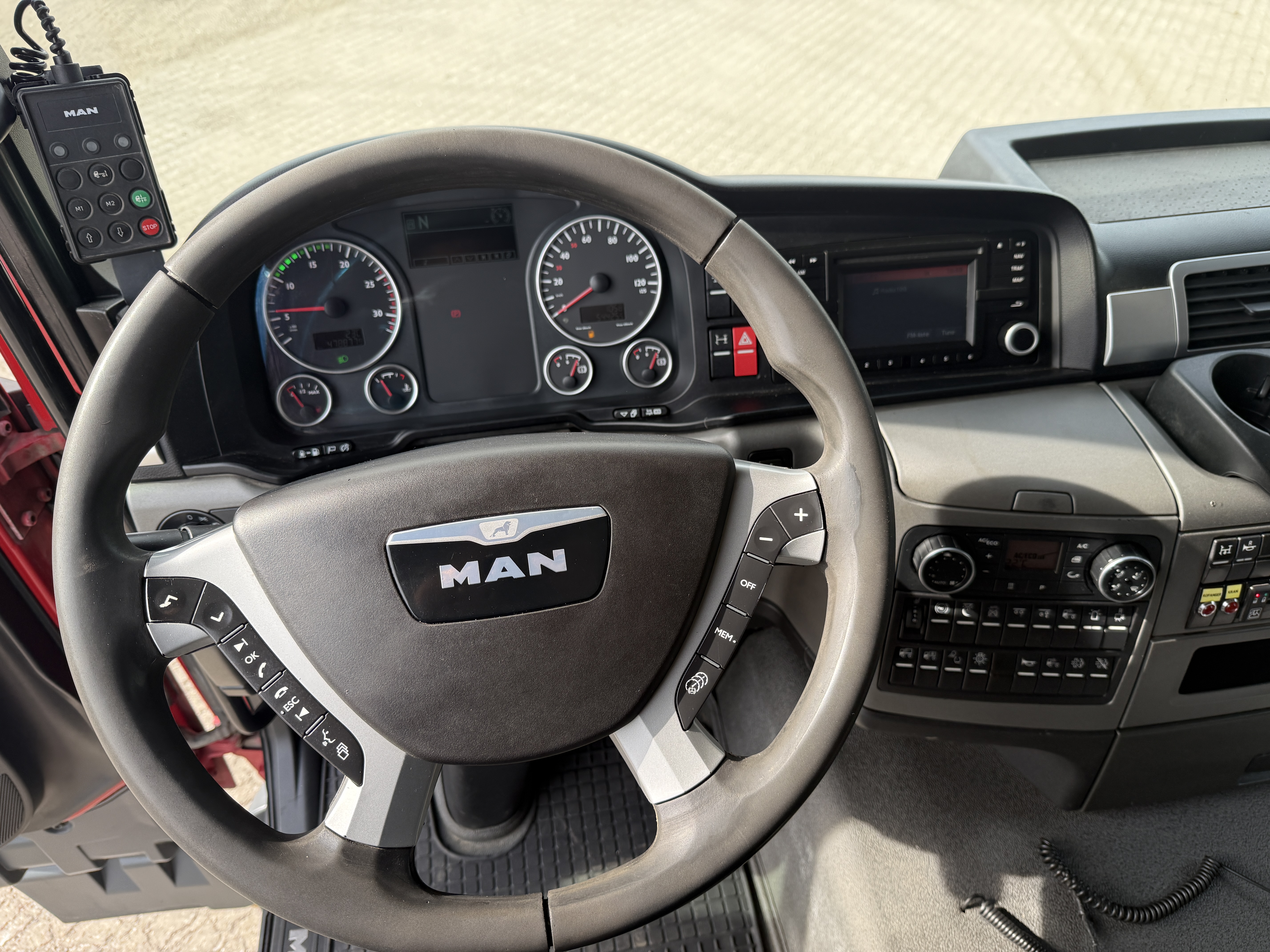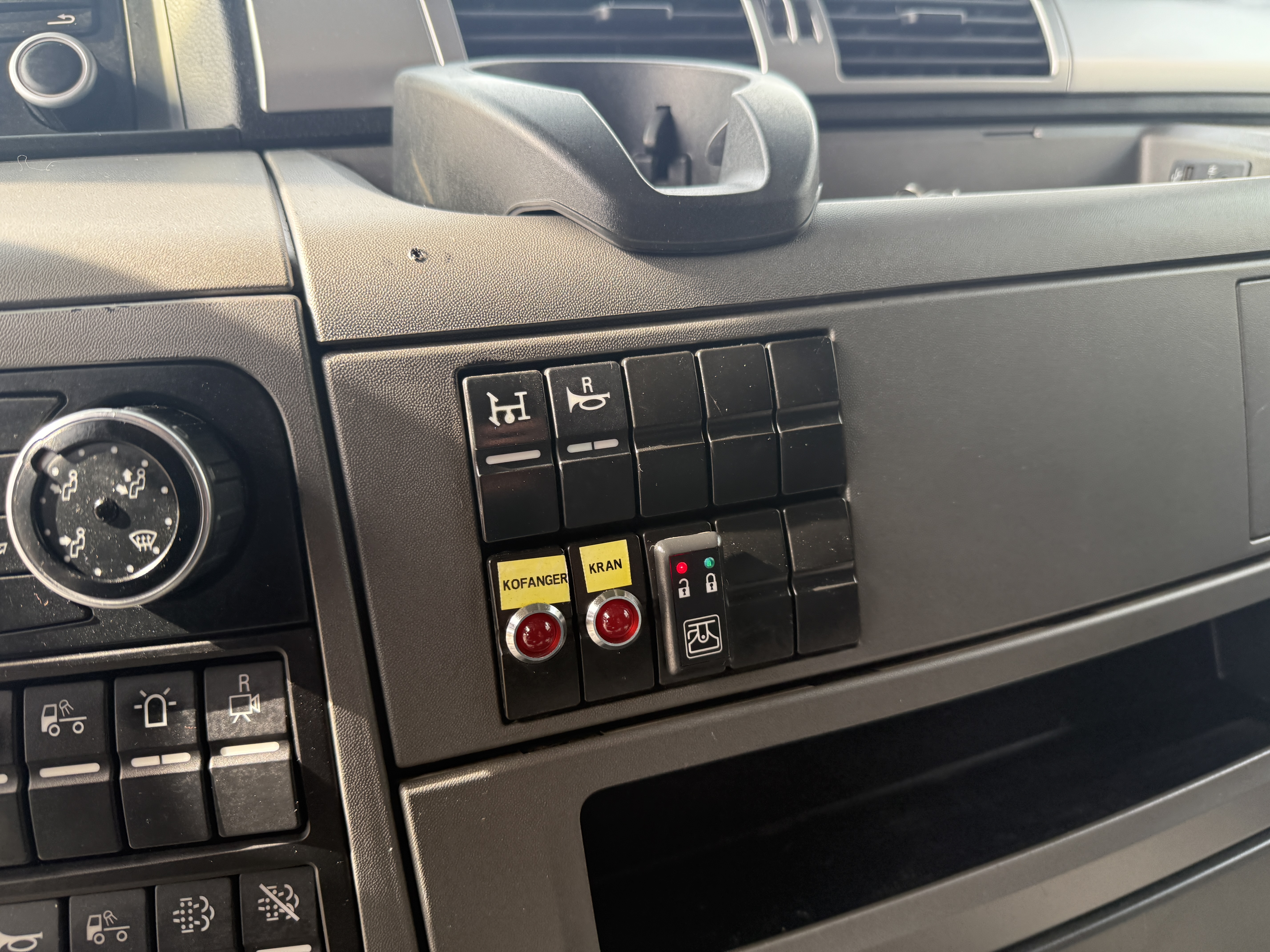 Førerhuset er udstyret med navigation, bakkamera, arbejdslys, slingerlamper, rotorlys, fartpilot, sædevarme, automatisk klimaanlæg, aircondition, radio og walkie.