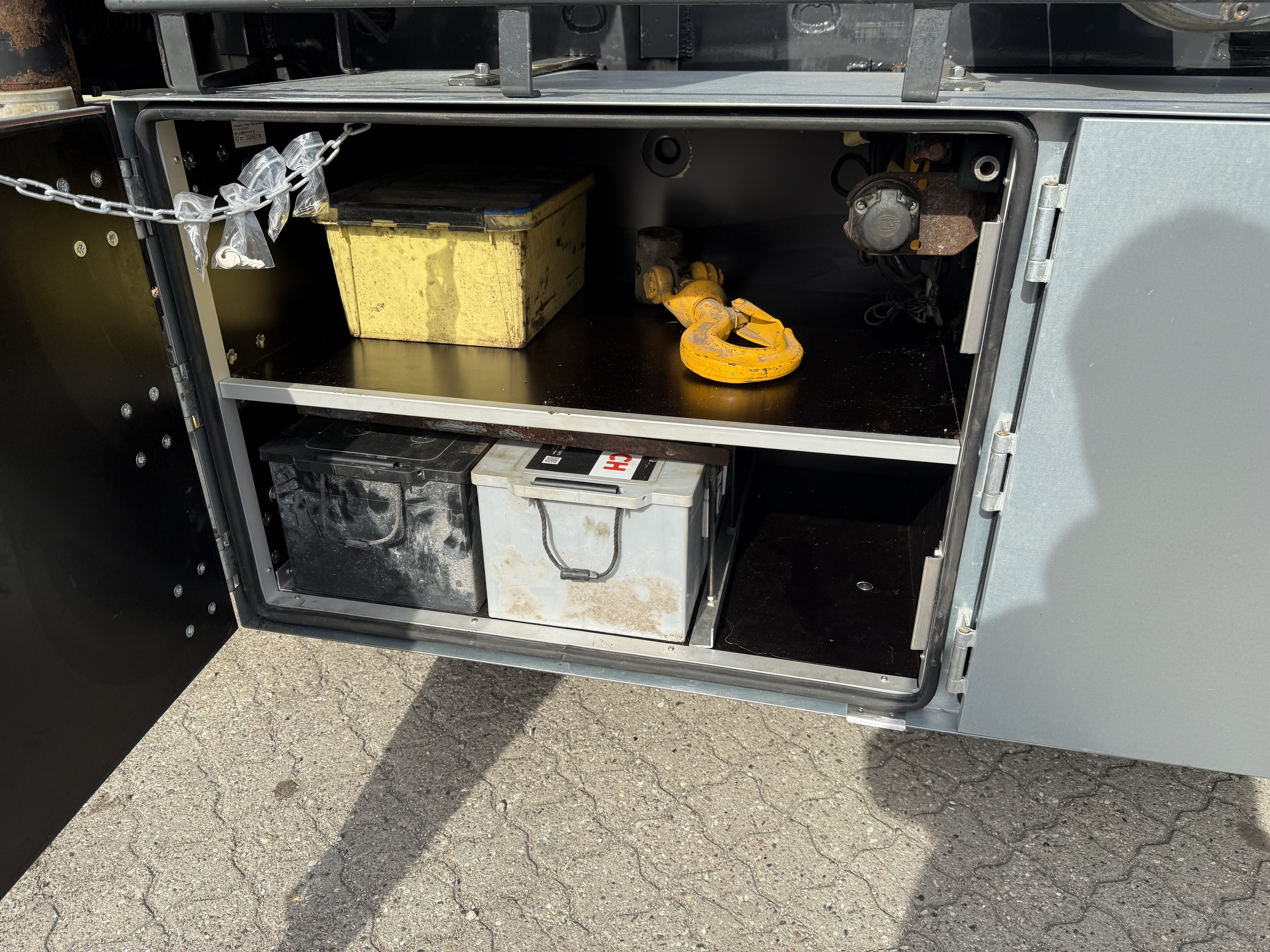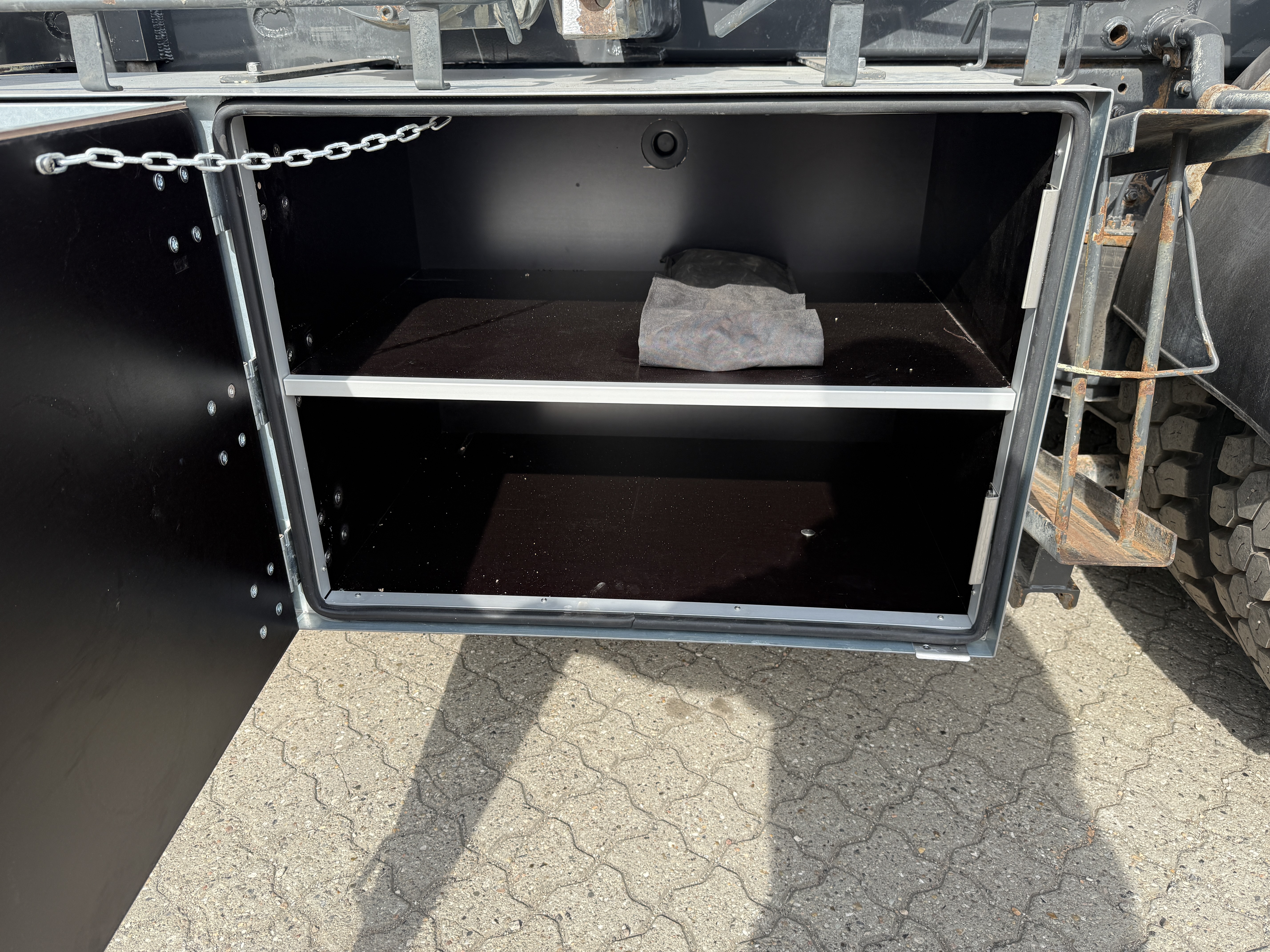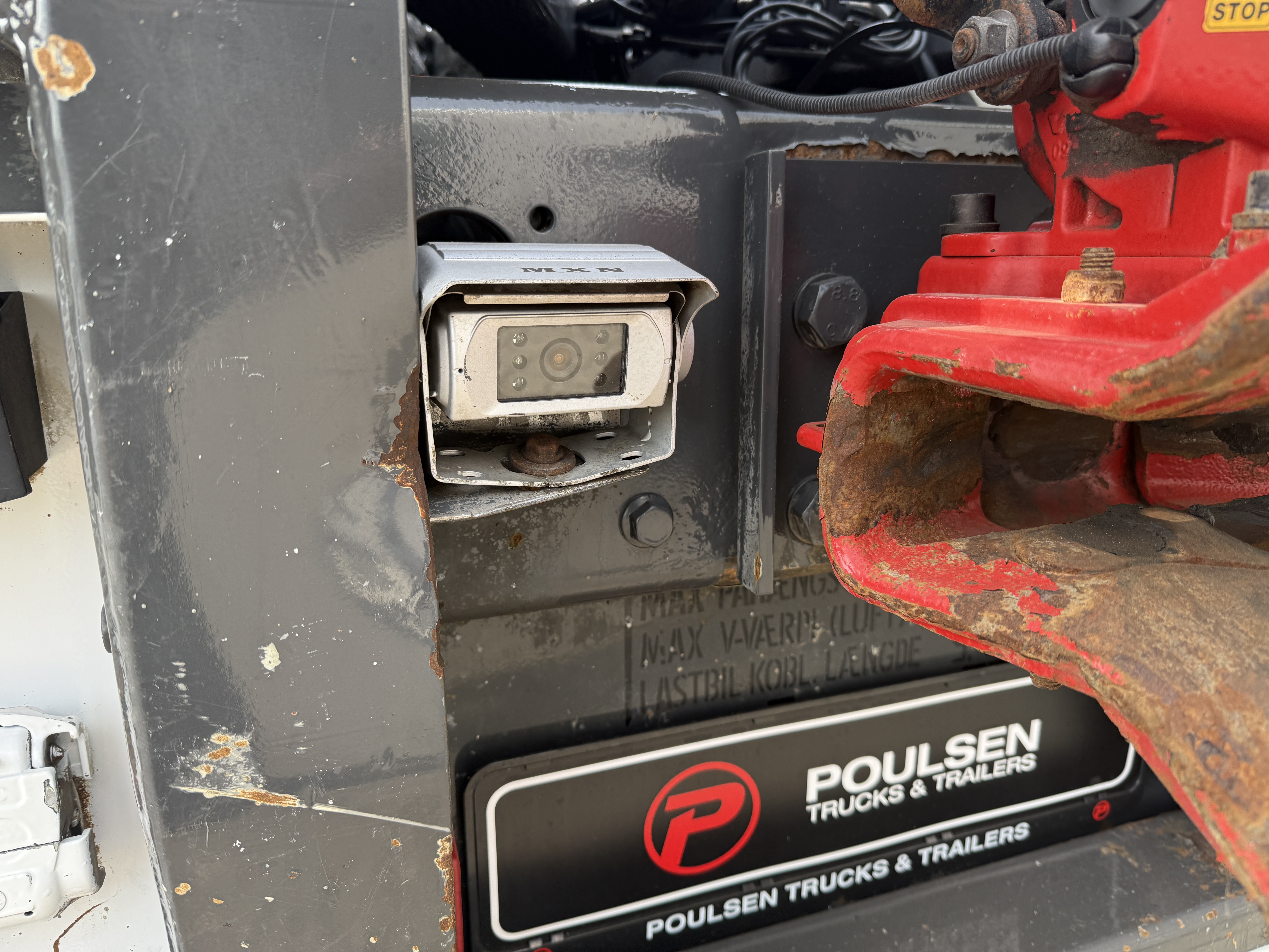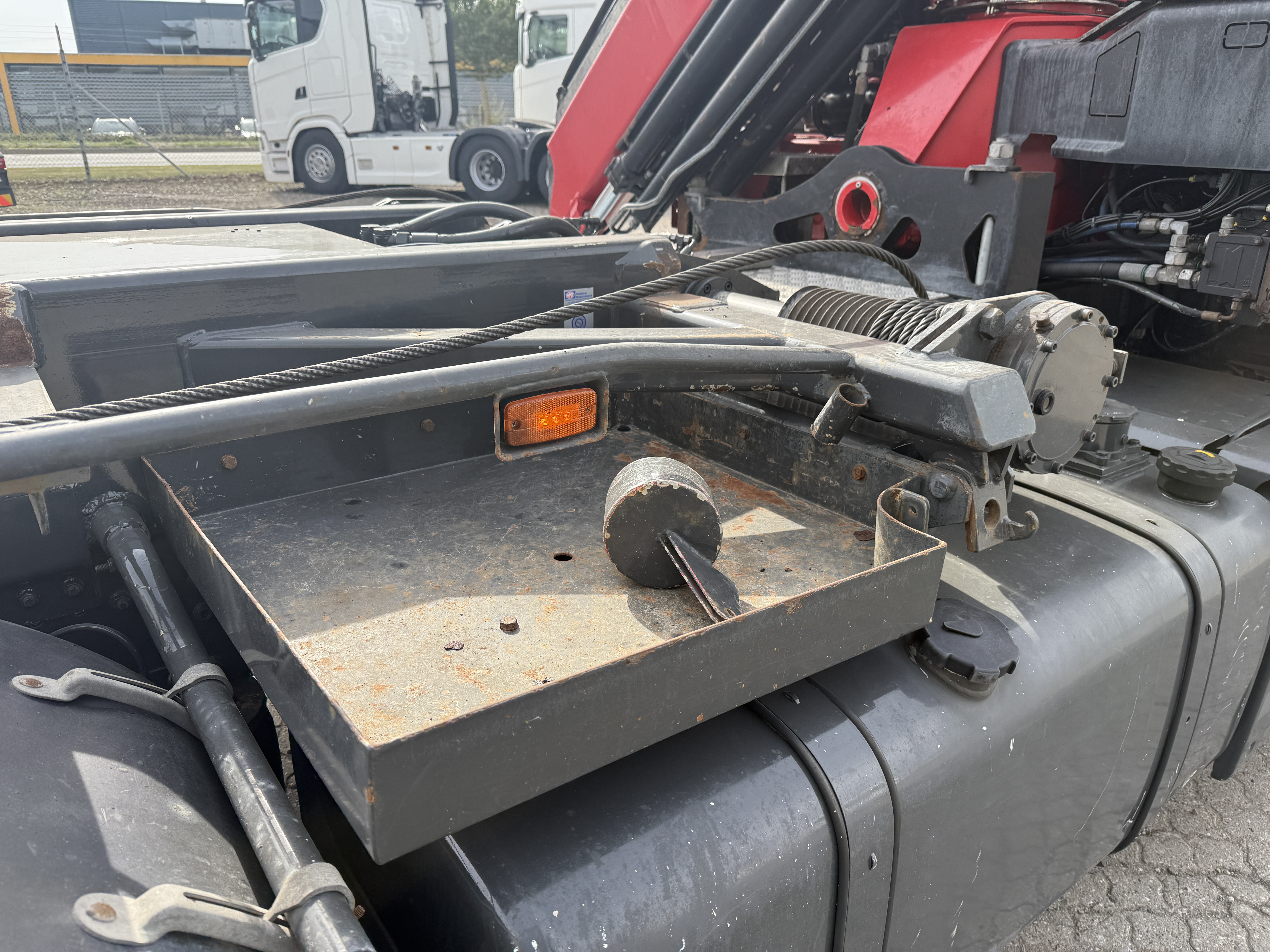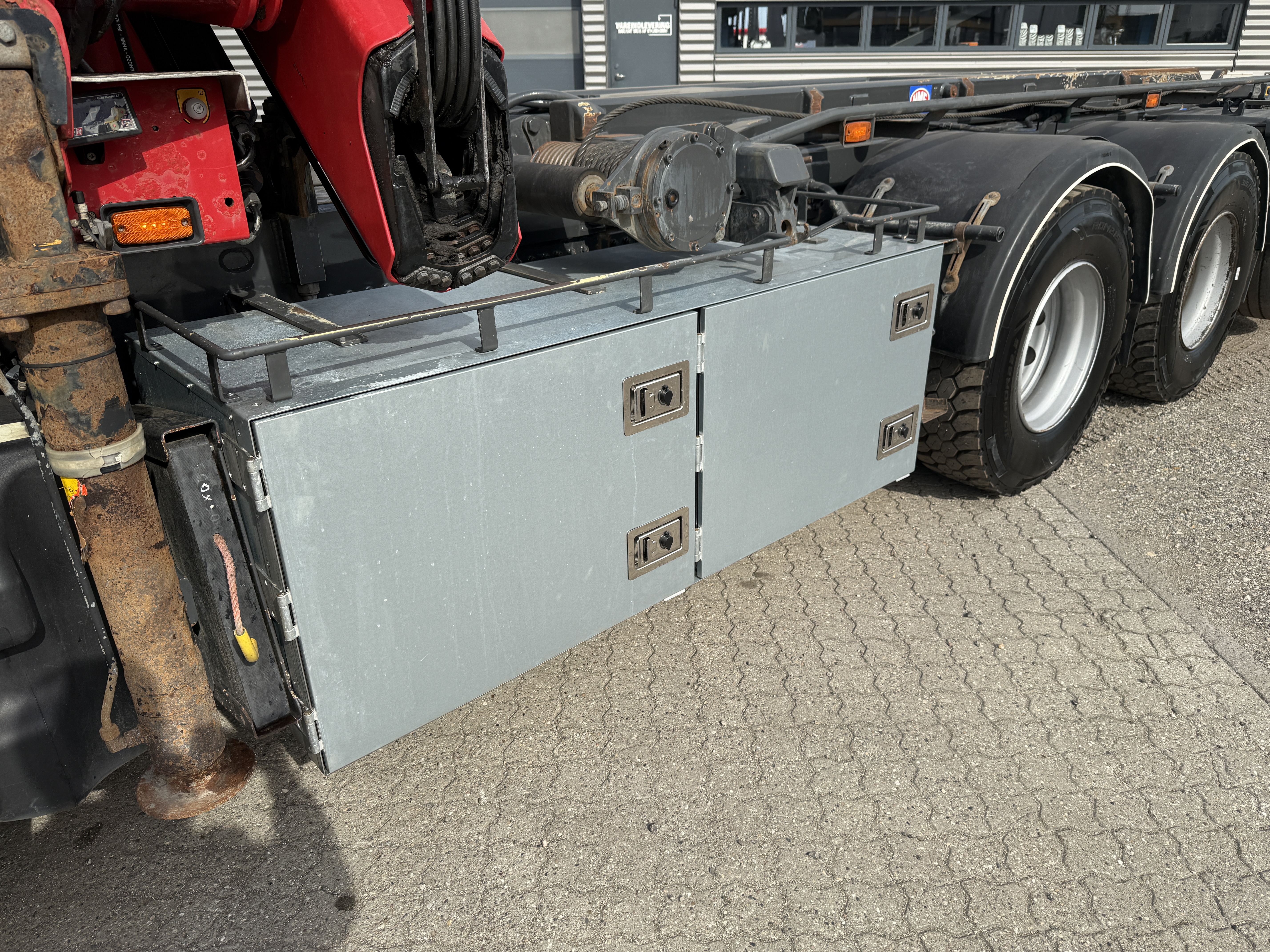 HMF 2620-K5 kran, monteret med rotor og Scanreco styring, Af opbygning kan nævnes, at der er 5700 mm fra front til stop, og at lastbilen kan køre med kasser i størrelsen 6500 til 7000 mm. monteret med ny Box Nordic værktøjskasse