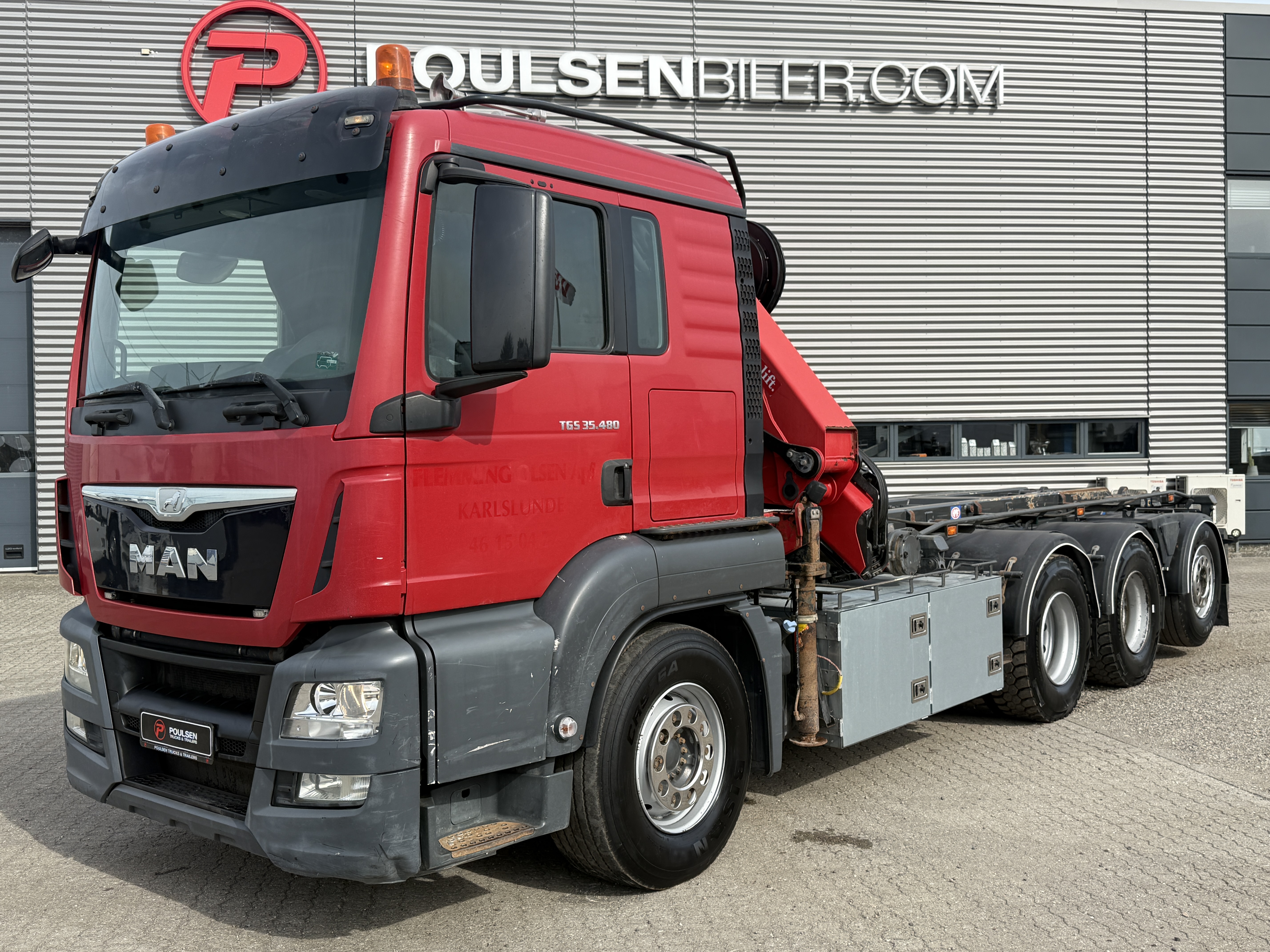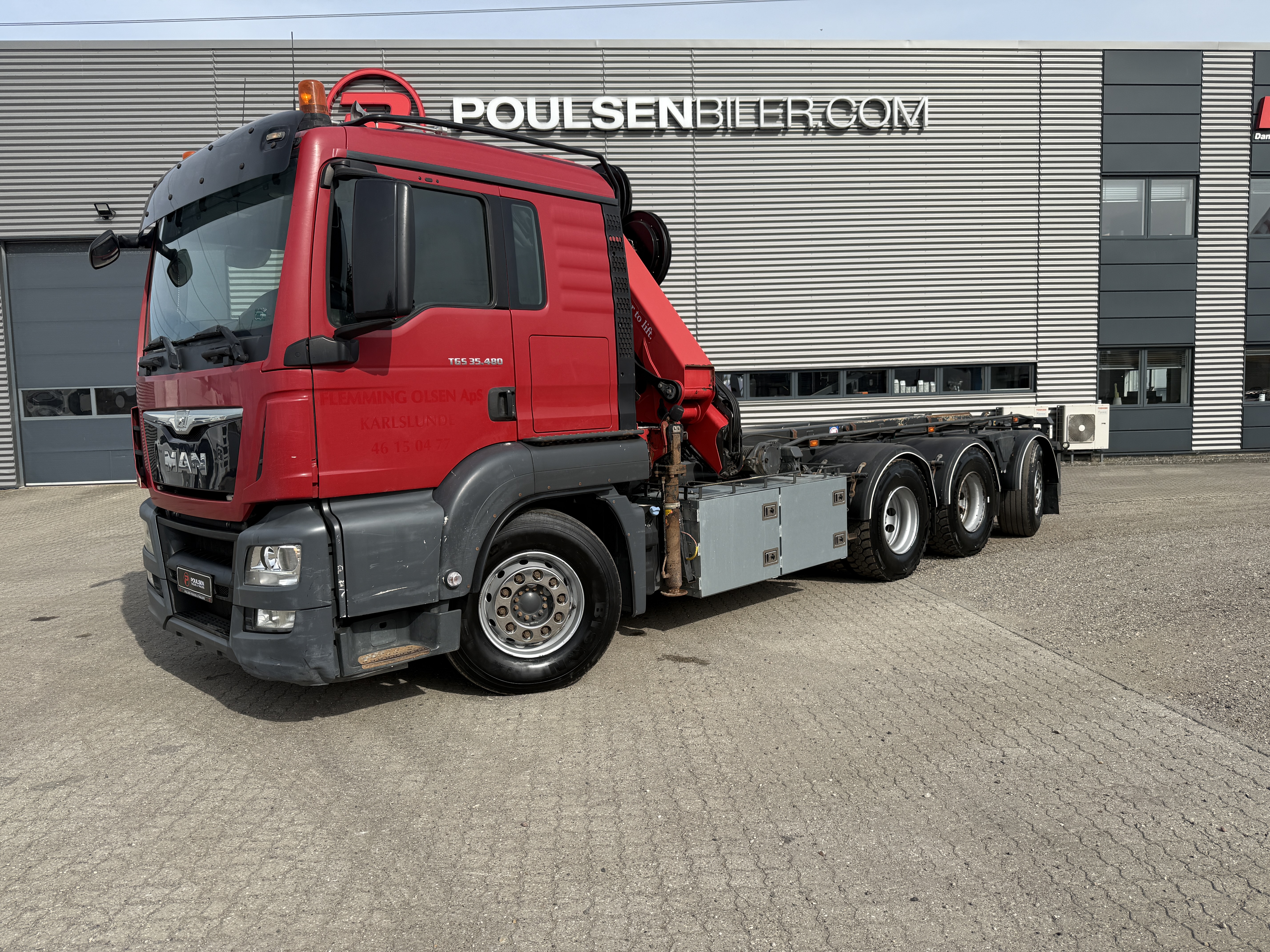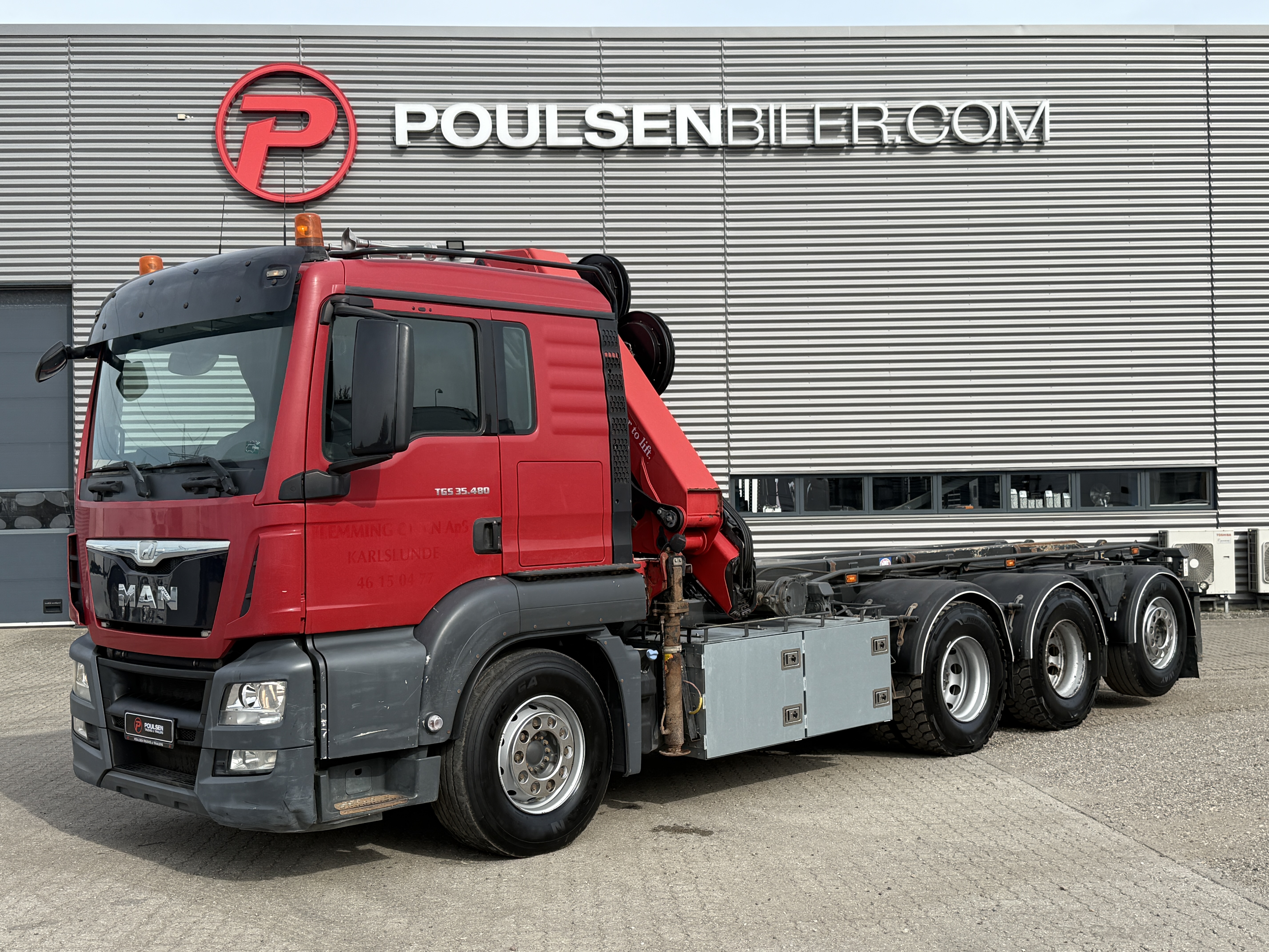 MAN TGS 35-480 8x4*4 fra april 2015 med HMF 2620-K5 kran og HMF wirehejs har kørt 479.000 km. Lastbilen er veludstyret og bygget til alsidige opgaver. Den er blandt andet forsynet med et VBG luftbetjent træk, hydraulisk udskudskofanger på 400 mm samt fjernbetjening til hejset. yderligere funktioner hører både luftudtag til automatbagsmæk og olieudtag til pendelside.