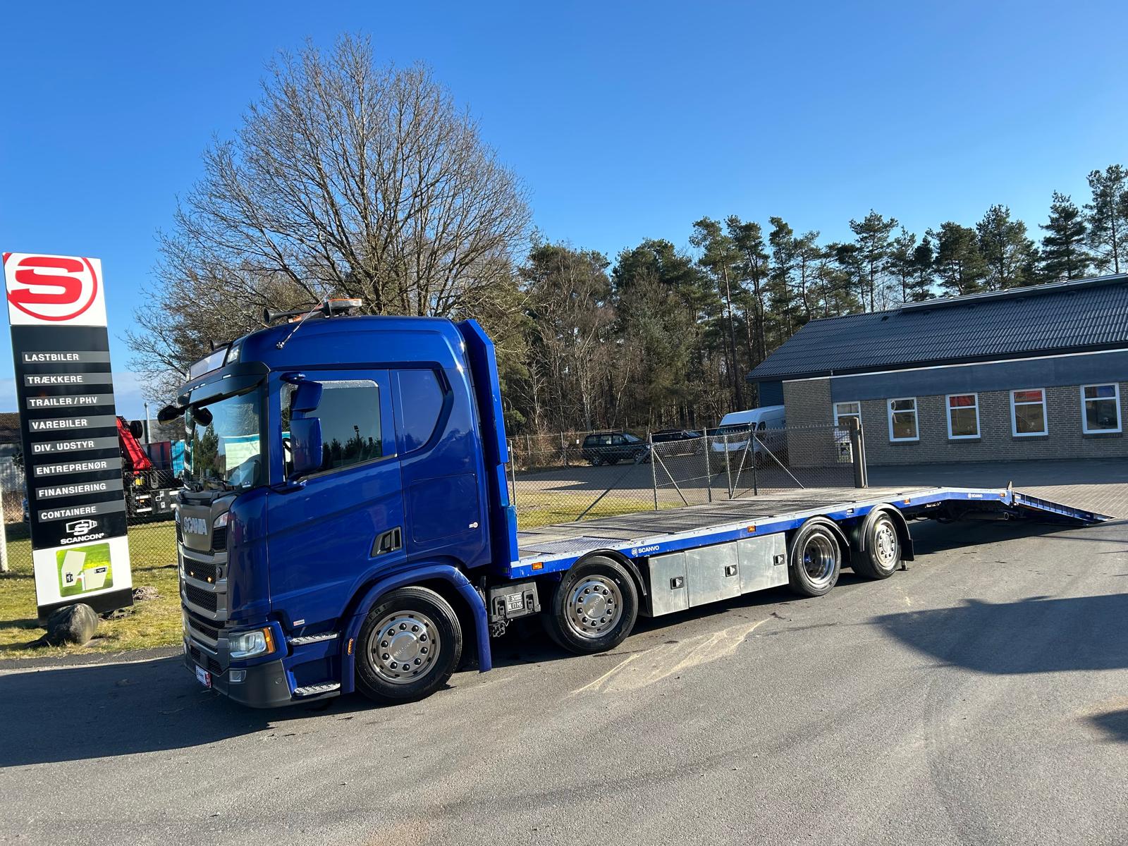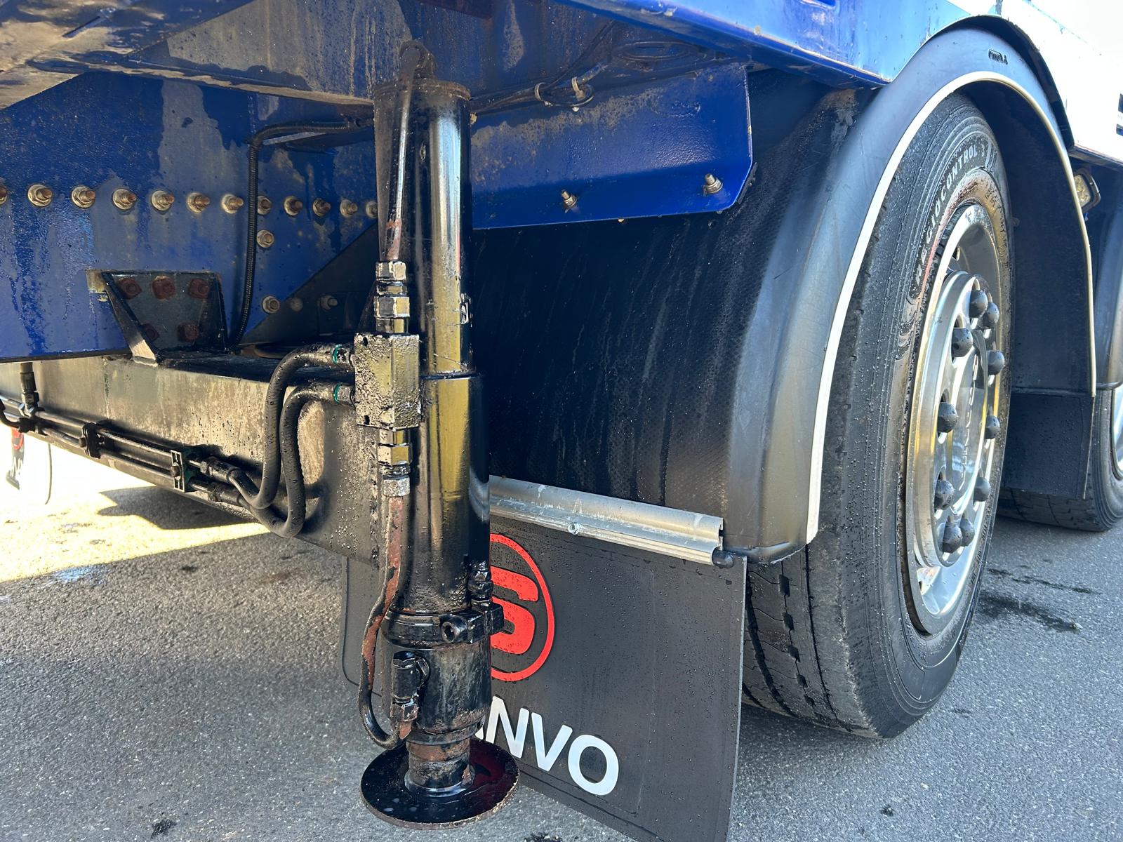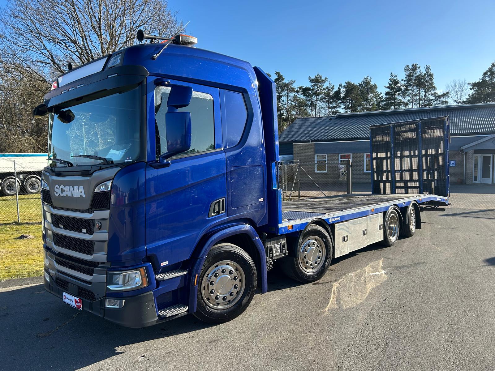 Denne Scania R500 8x2*6 er opbygget med et solidt knæklad og byder på en række funktioner. Lastbilen er udstyret med fjernbetjent spil, en heldækkende hydraulisk rampe samt fjernbetjening til rampen, hvilket gør læsning og losning både nemt og sikkert. Bagtil er der hydrauliske støtteben.