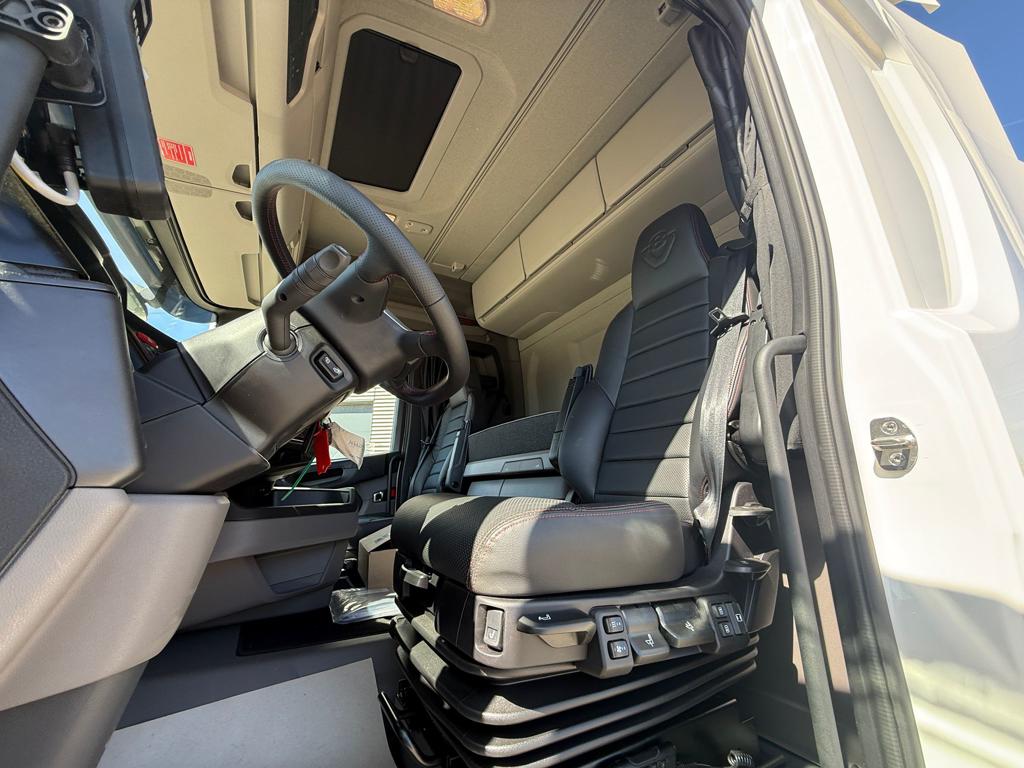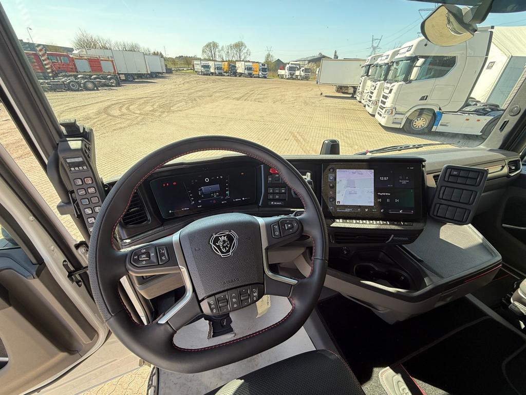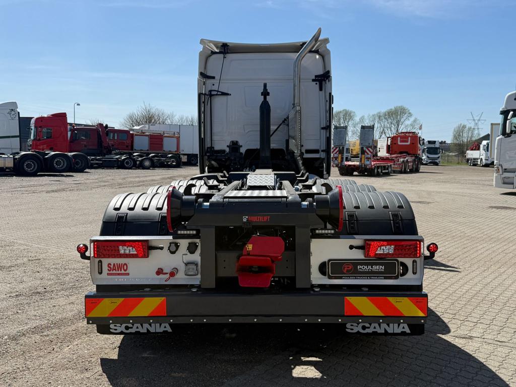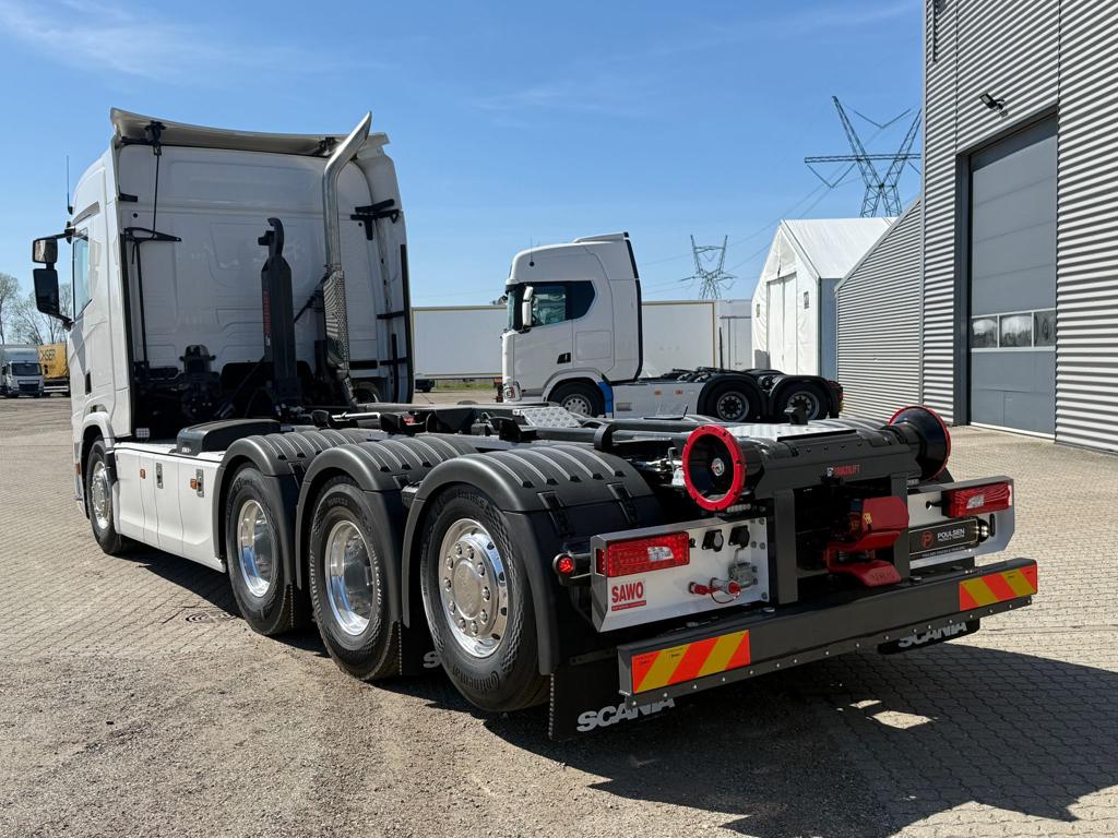 Ny Scania R590 8x4/4 tridem forvogn med HIAB 24 tons kroghejs, netop opbygget af SAWO A/S. Opbygningen omfatter et HIAB ULT24XL61 kroghejs med en løftekapacitet på 24 tons og en hejselængde på 6100 mm. Køretøjet er udstyret med hydraulisk udskudskofanger med 600 mm udskud og kan håndtere containere med en maksimal udvendig længde på 7300 mm. Der er monteret duo‑matic luftudtag til automatisk bagsmæk samt tryk- og returkobling bagtil til anhænger eller kærre. Trækket er et VBG 795V med 57 mm luftbetjent træk monteret i 700 mm højde. Derudover er bilen udstyret med originale sideskørter, alukserede dørkplader mellem første og anden aksel samt et sideskab i venstre side med udtræksskuffer. Opbygningen er afsluttet med fire arbejdslys monteret på opbygningen samt blitzlamper integreret i de bageste lygtehuse.