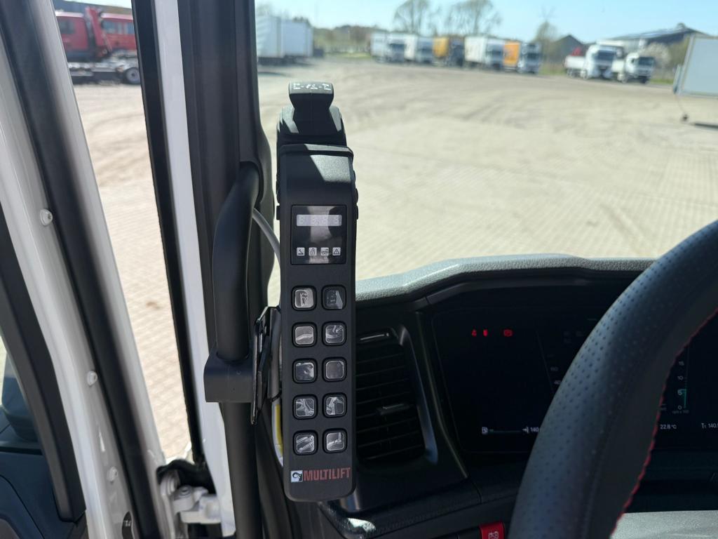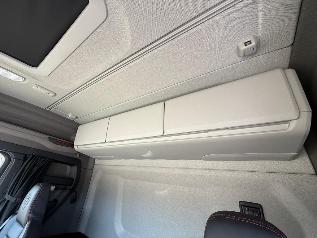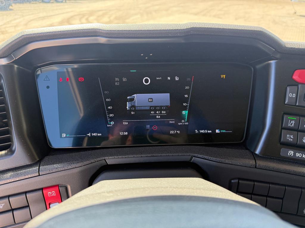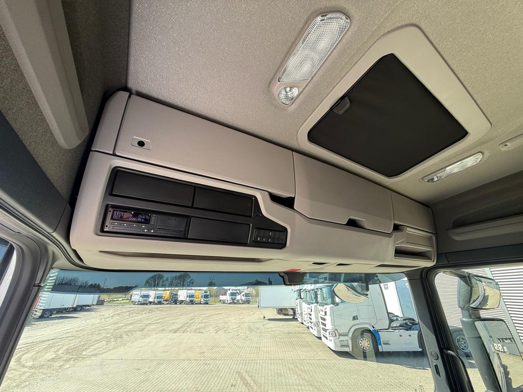 Ny Scania R590 8x4/4 tridem forvogn med HIAB 24 tons kroghejs, netop opbygget af SAWO A/S. Opbygningen omfatter et HIAB ULT24XL61 kroghejs med en løftekapacitet på 24 tons og en hejselængde på 6100 mm. Køretøjet er udstyret med hydraulisk udskudskofanger med 600 mm udskud og kan håndtere containere med en maksimal udvendig længde på 7300 mm. Der er monteret duo‑matic luftudtag til automatisk bagsmæk samt tryk- og returkobling bagtil til anhænger eller kærre. Trækket er et VBG 795V med 57 mm luftbetjent træk monteret i 700 mm højde. Derudover er bilen udstyret med originale sideskørter, alukserede dørkplader mellem første og anden aksel samt et sideskab i venstre side med udtræksskuffer. Opbygningen er afsluttet med fire arbejdslys monteret på opbygningen samt blitzlamper integreret i de bageste lygtehuse.