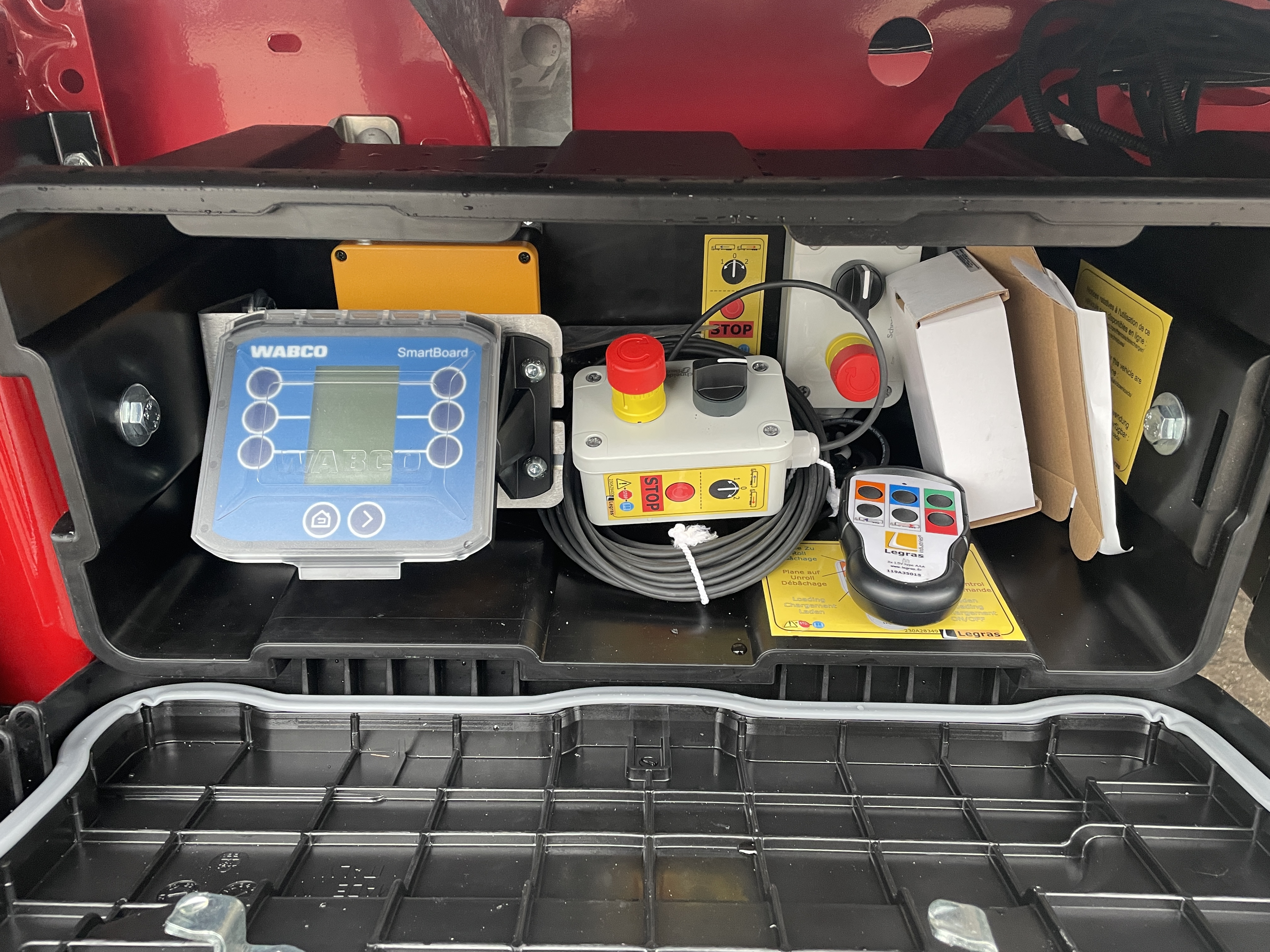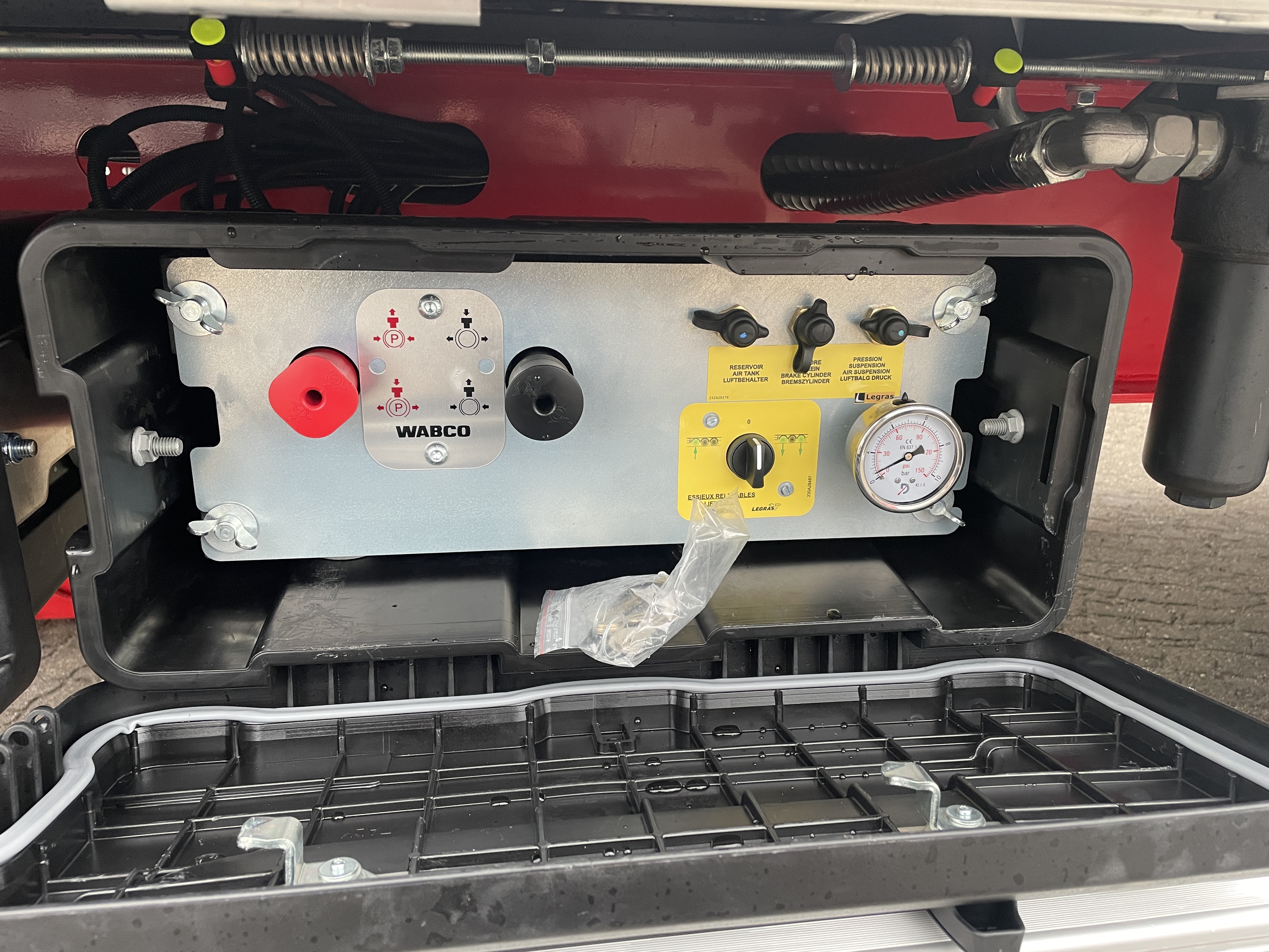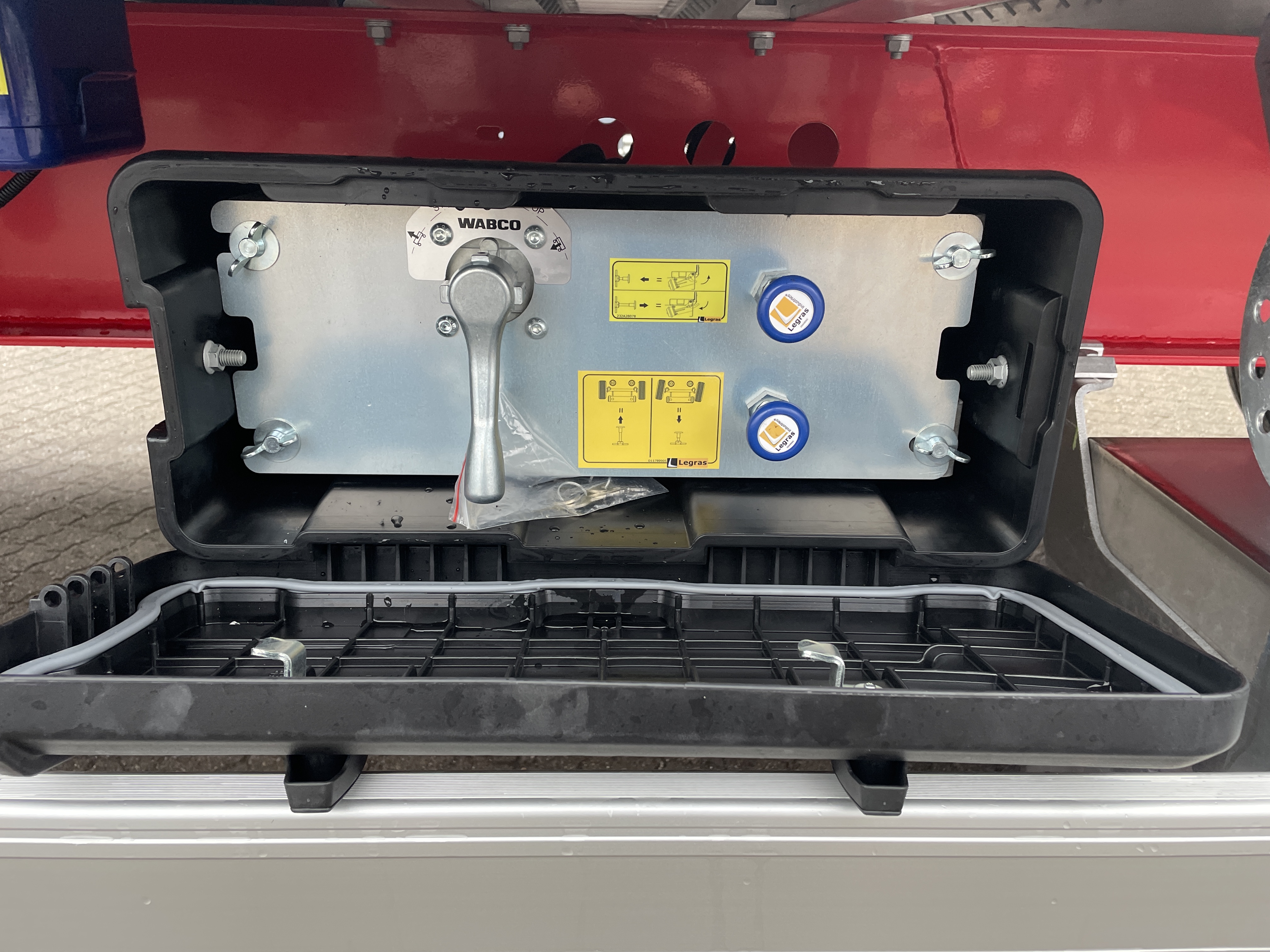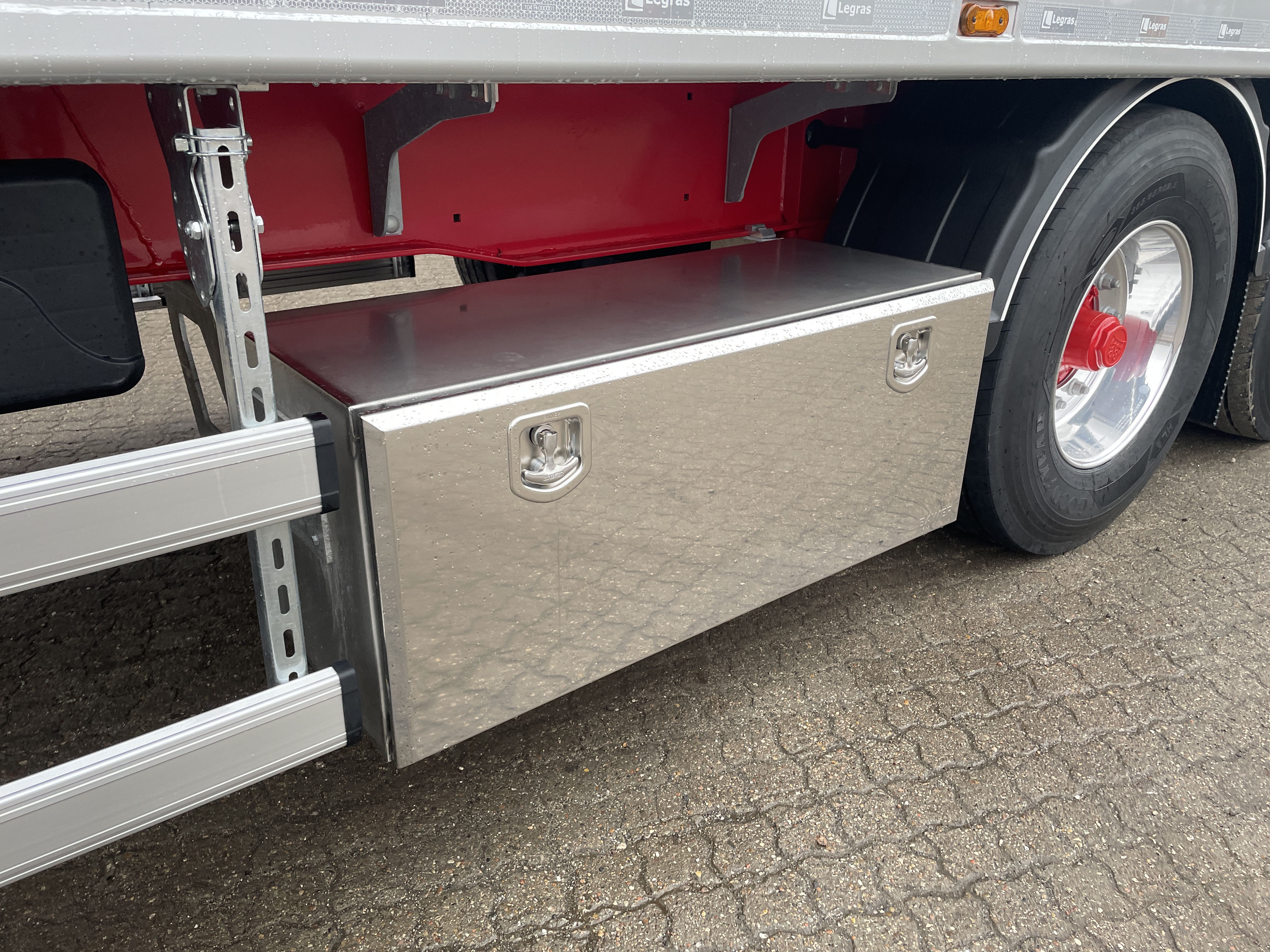 Alle betjeningsventiler er elegant integreret i værktøjskasserne, hvor der også findes en el-samleboks for nem adgang til elektriske installationer. Den store rustfri værktøjskasse giver rigelig opbevaringsplads, og traileren leveres med kost-/skovbeslag, reservehjulsophæng og en løs alu-stige for nem adgang.