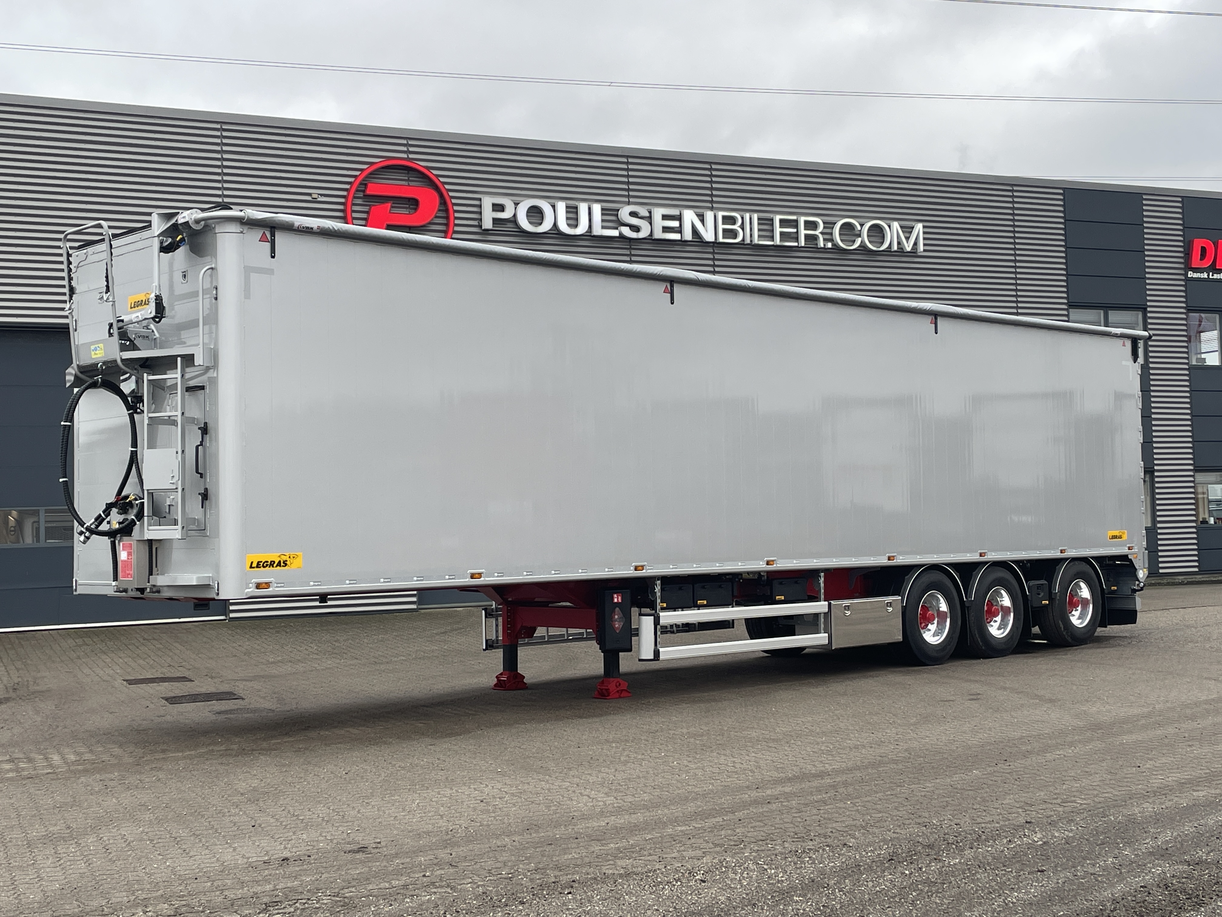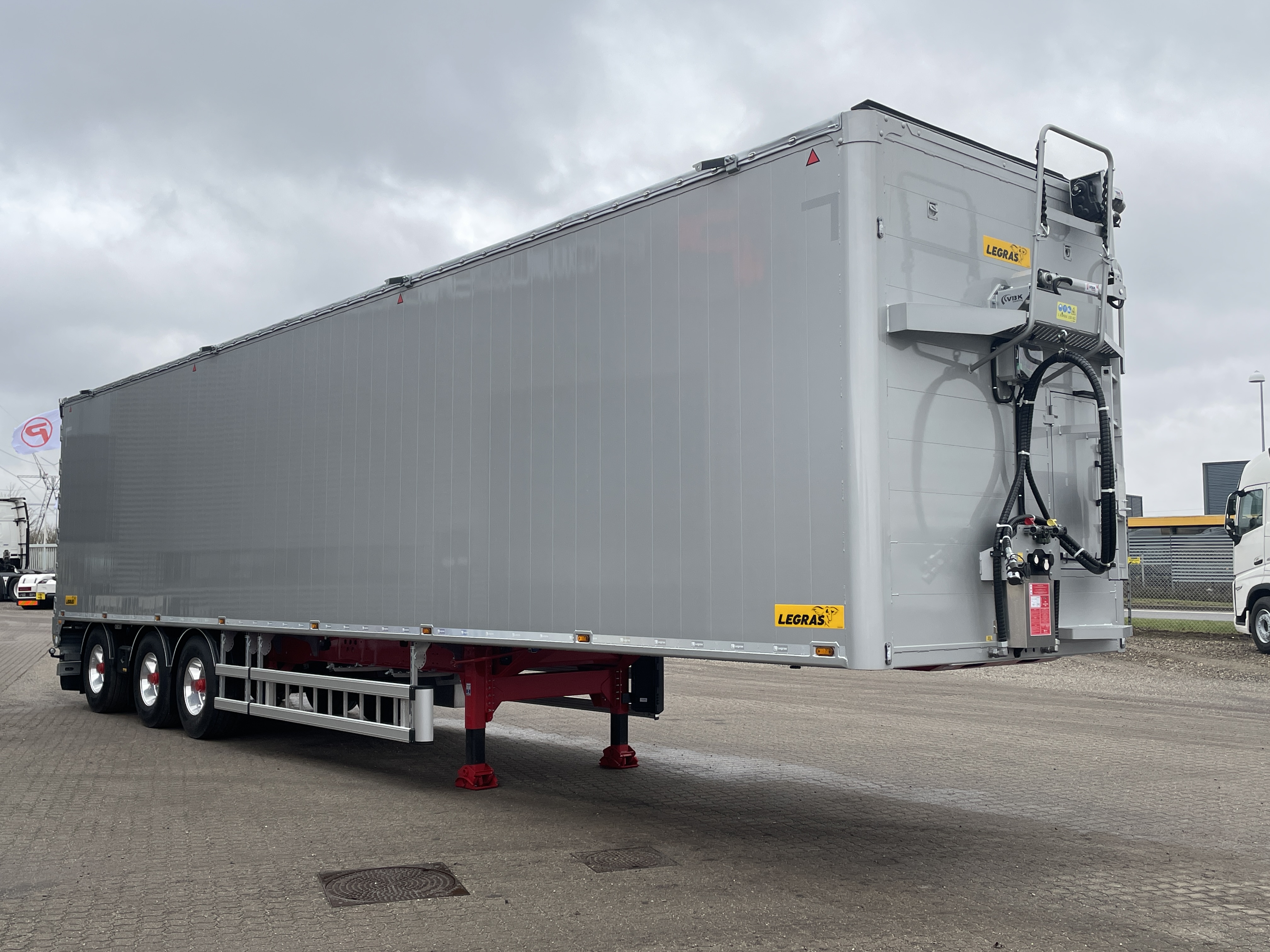 Vi har hermed fornøjelsen af, at tilbyde denne nye LEGRAS 91,8m3 walkingfloor trailer, en kvalitetsbevidst og robust løsning til transportopgaver, der kræver pålidelighed og effektivitet. Traileren er udstyret med en VBK automatpresenning, der sikrer nem og hurtig afdækning, samt BPW aksler med tromlebremser for optimal bremsepræstation. For yderligere fleksibilitet, er aksel 1 udstyret med liftaksel, mens aksel 3 er medstyrende, hvilket forbedrer manøvreringsevnen betydeligt.
