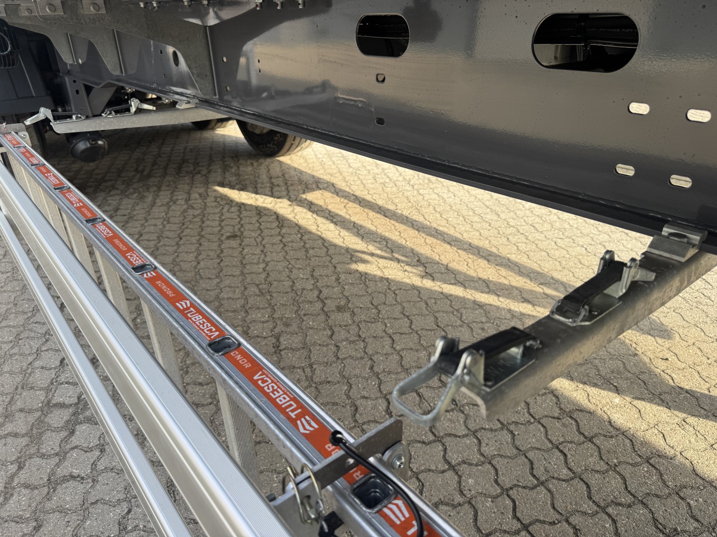 Alufælgene er af typen Alcoa DuraBright, og der er TPMS dæktryksovervågning via EBS. Gulvet er kraftig slidstærk kvalitet, med en tykkelse på 13mm, og bagenden er beskyttet med en rustfri slidplade.