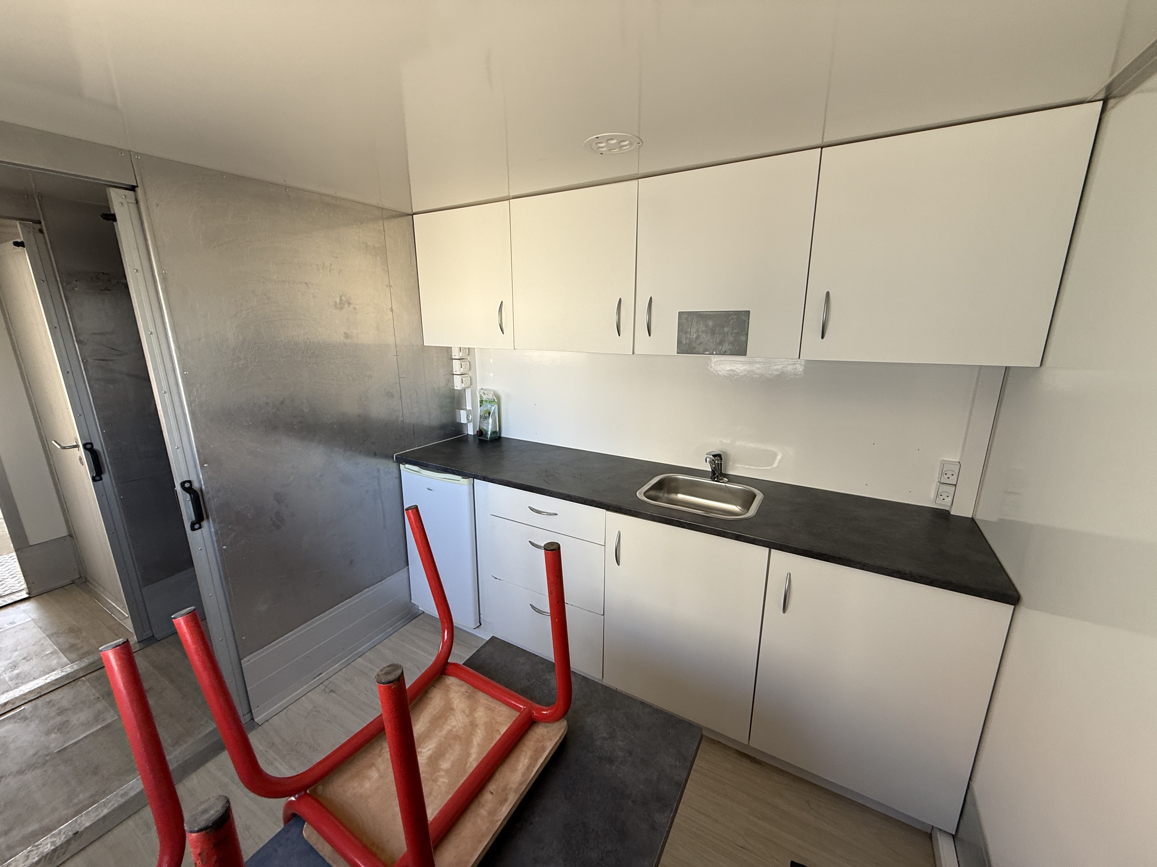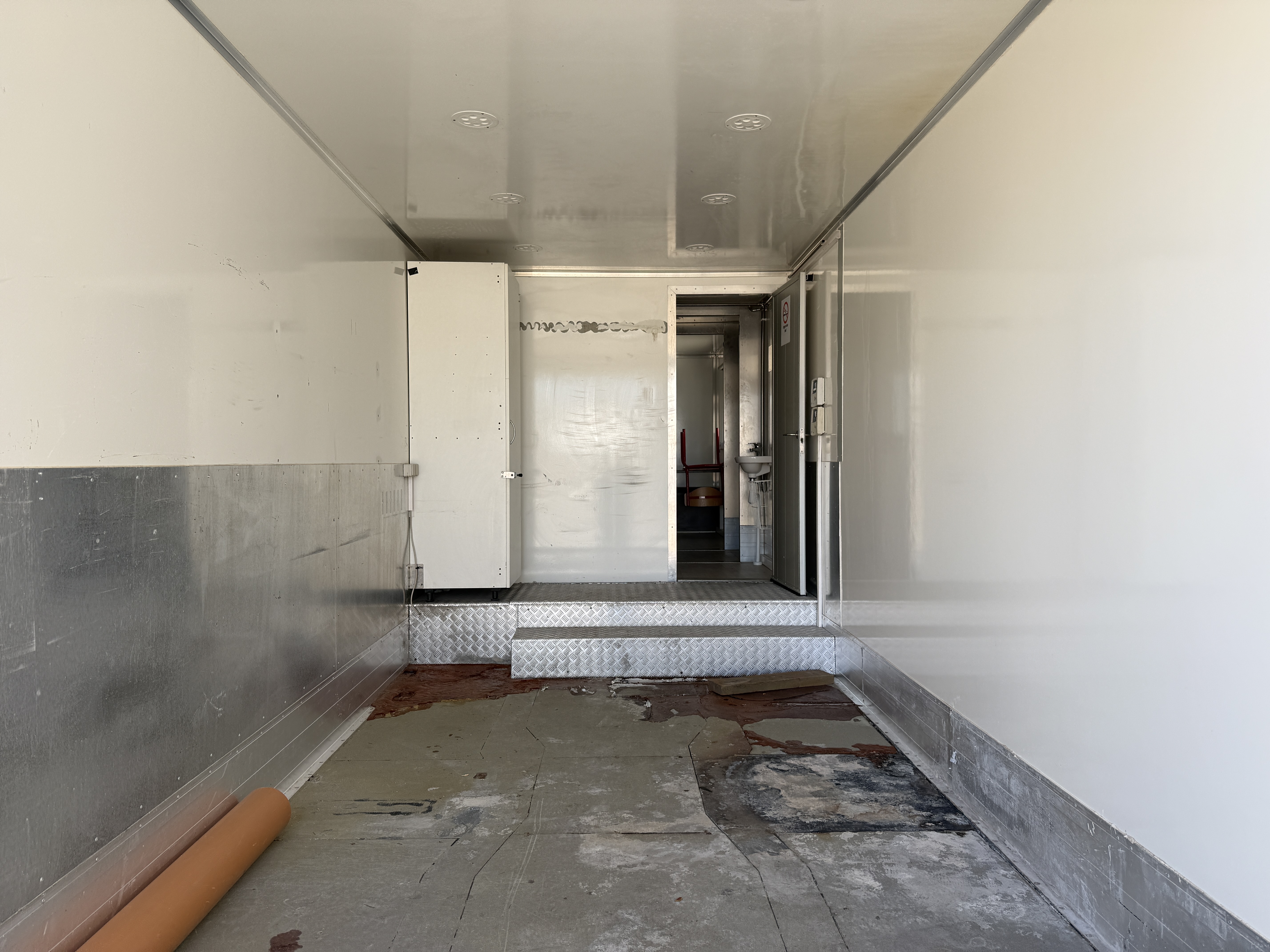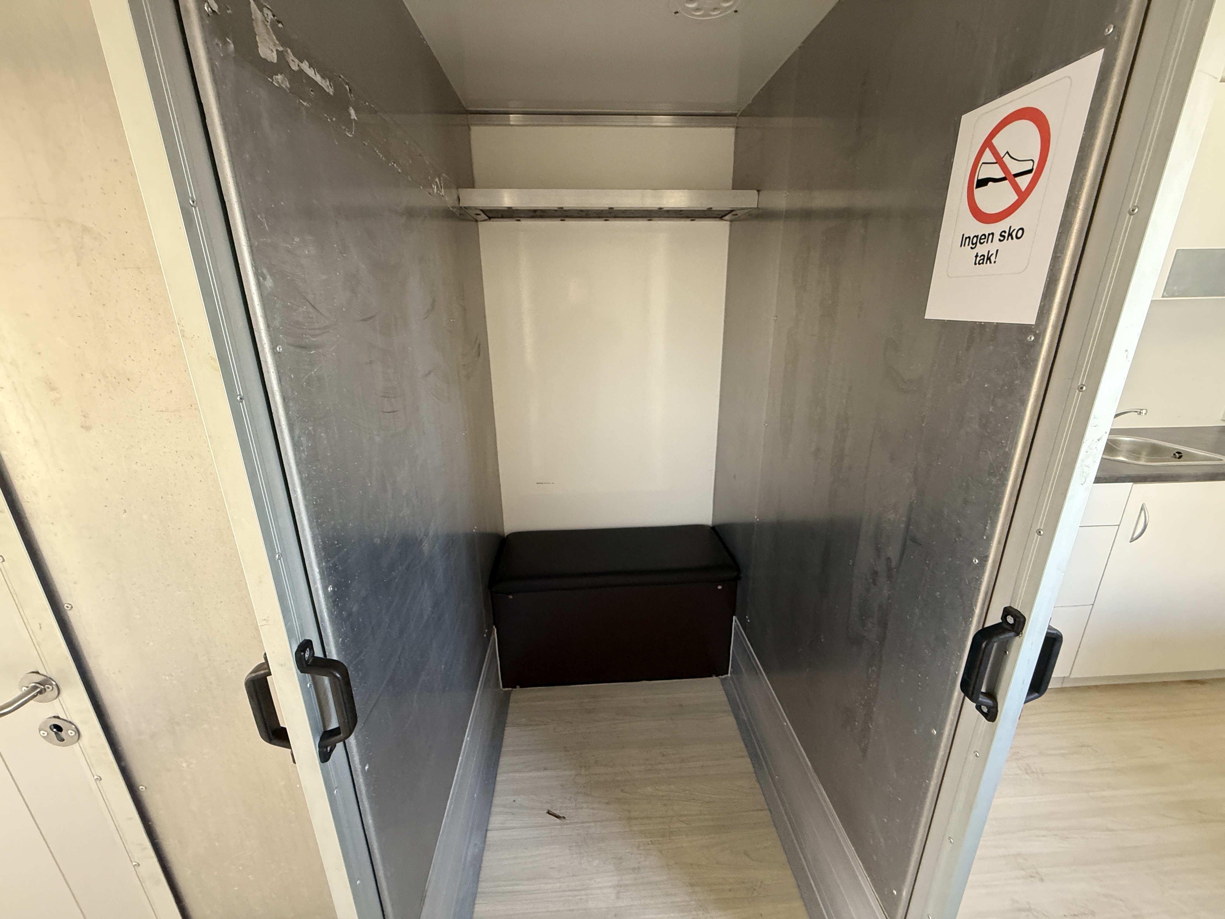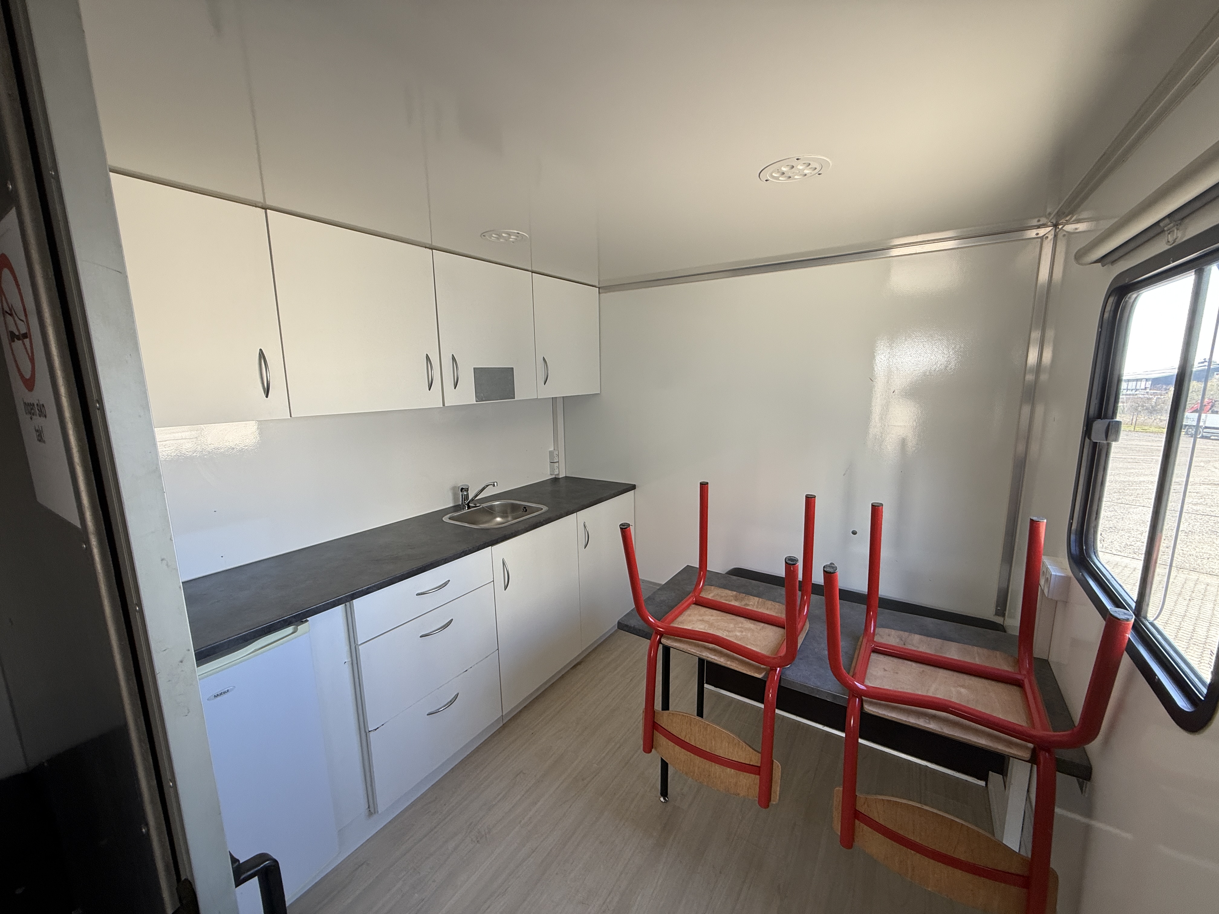 Opholdsdelen indeholder toilet med bruser samt et opholdsrum med tekøkken. Opholdsrummet måler L 2410 x B 2440 x H 2100 mm. Værkstedsdelen, har en højde på 2500 mm, bredde på 2430 mm, gulvlængde på 4150 mm og en samlet længde på 5300 mm.