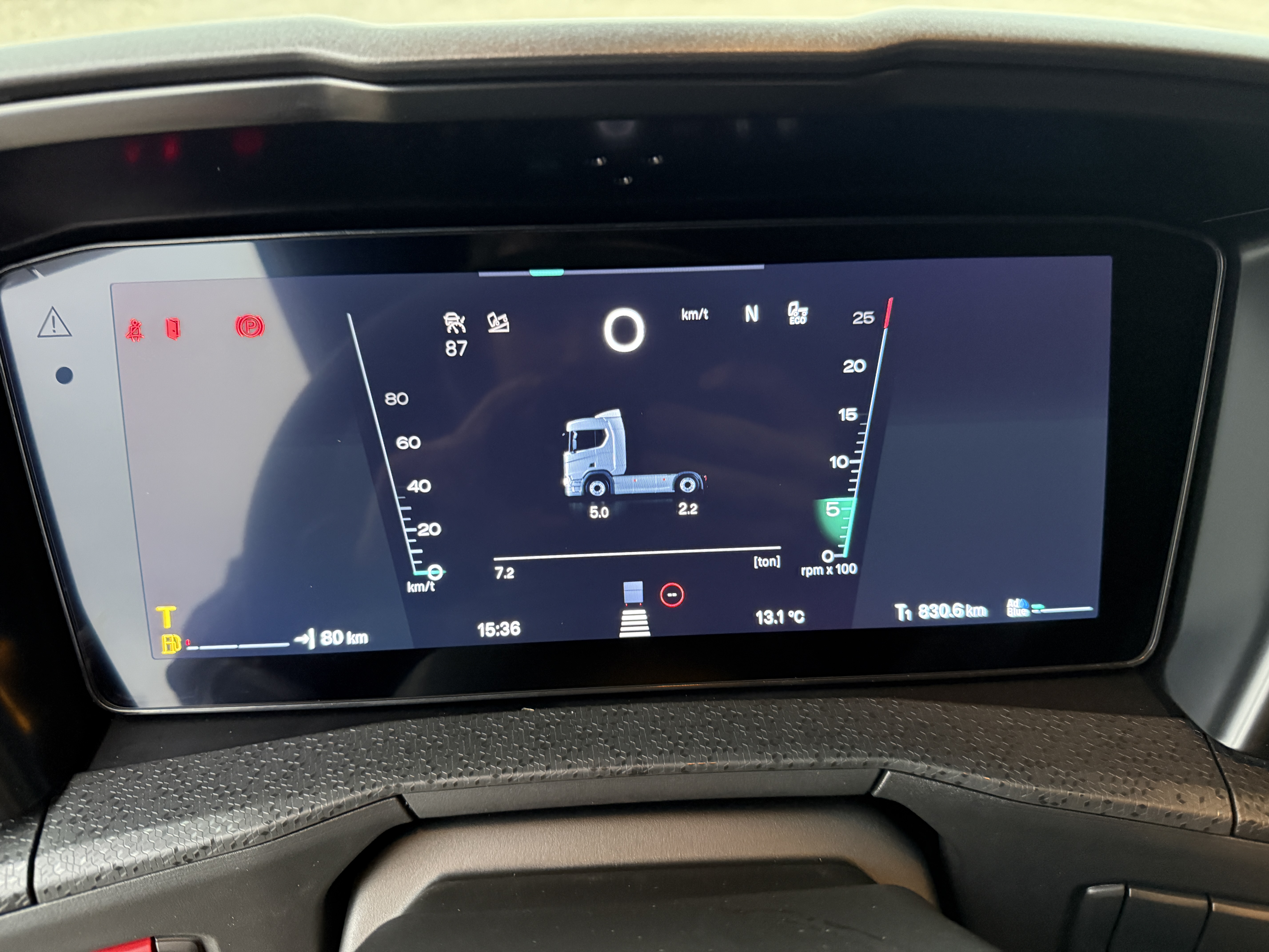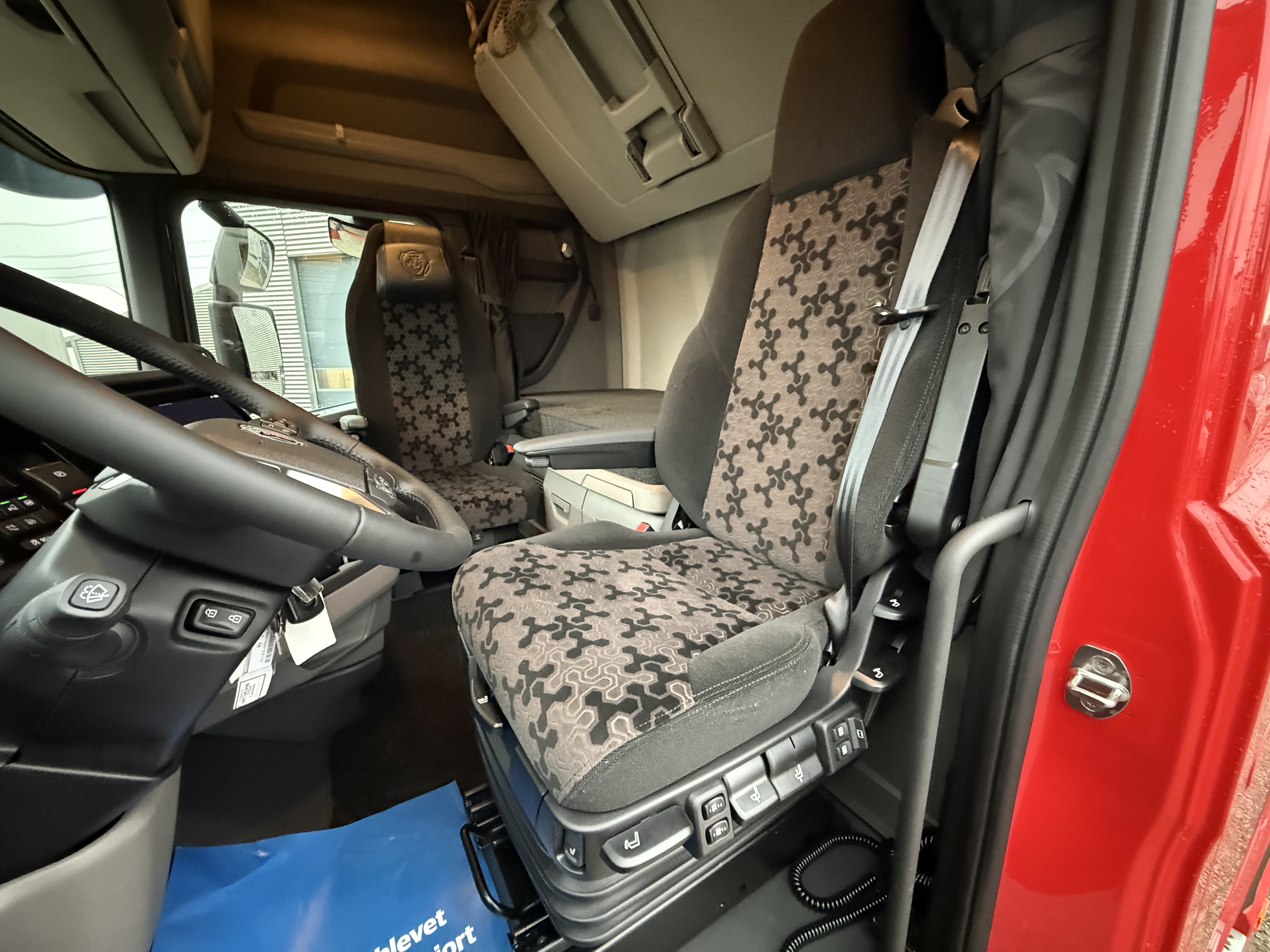 Kabinen er godt udstyret med navigation, Apple CarPlay, aircondition og Scania Air Cooler. Førersædet har både varme og ventilation, og der er installeret bakkamera, radio og walkie.