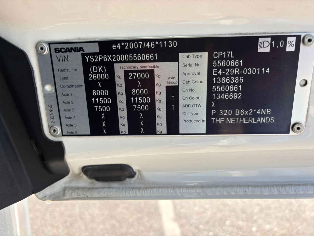 Nyttelast: 11.585 kg, Tilladt totalvægt: 26.000 kg, Brændstofstank: 400l, Akselafstand: 5.950 mm