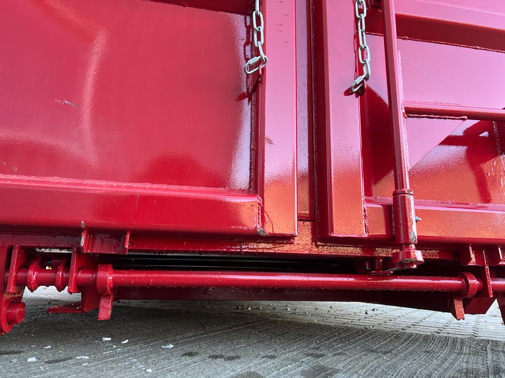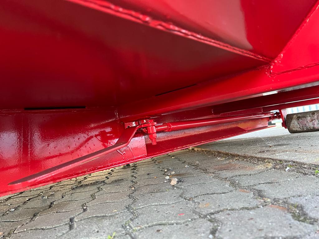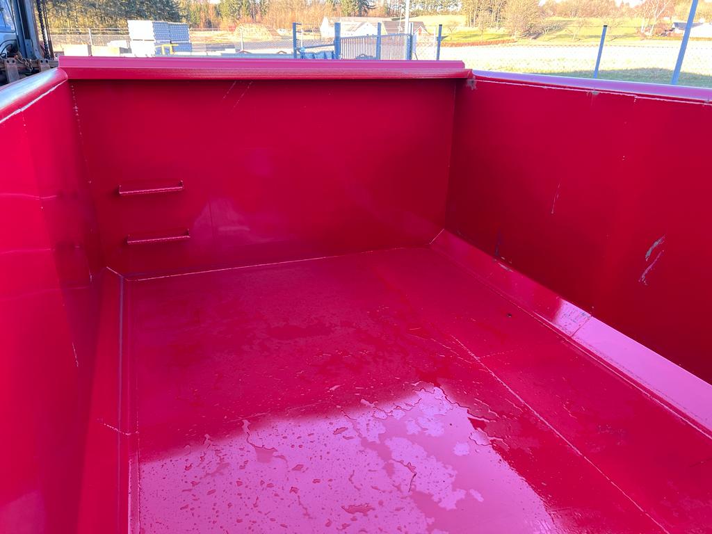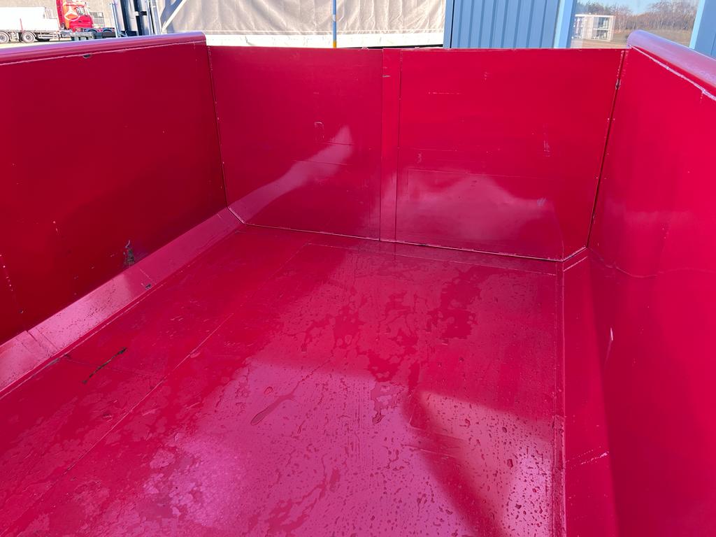 indv. mål: L:6200 mm x B:2350 mm x H:1300 mm - udvendig totallænge 6500 mm - 5 mm. bund og 3 mm. sider i S235 stål - Beslag til krog og wire - sidehængt bagdøre - lakeret i RAL 3001 signalrød - 750 mm. i vange afstand - surrings stang langs ydersiden - fodtrin på forsmæk