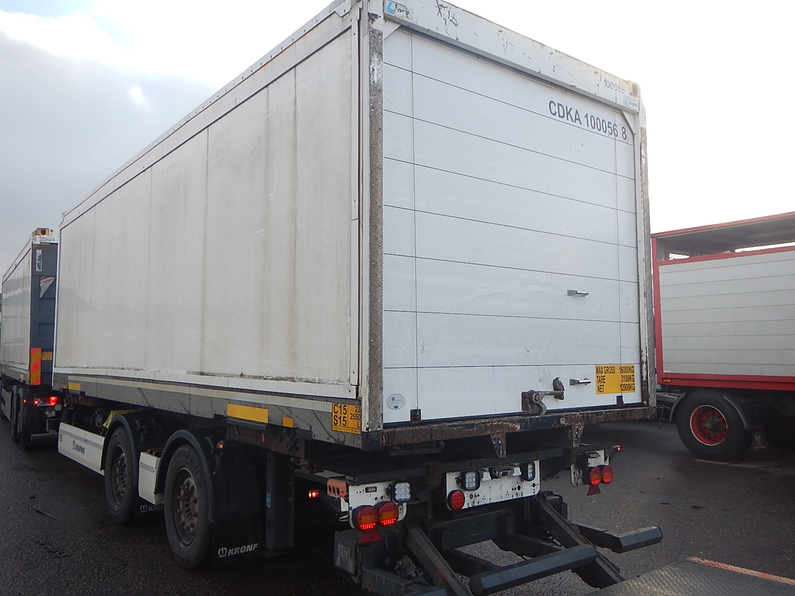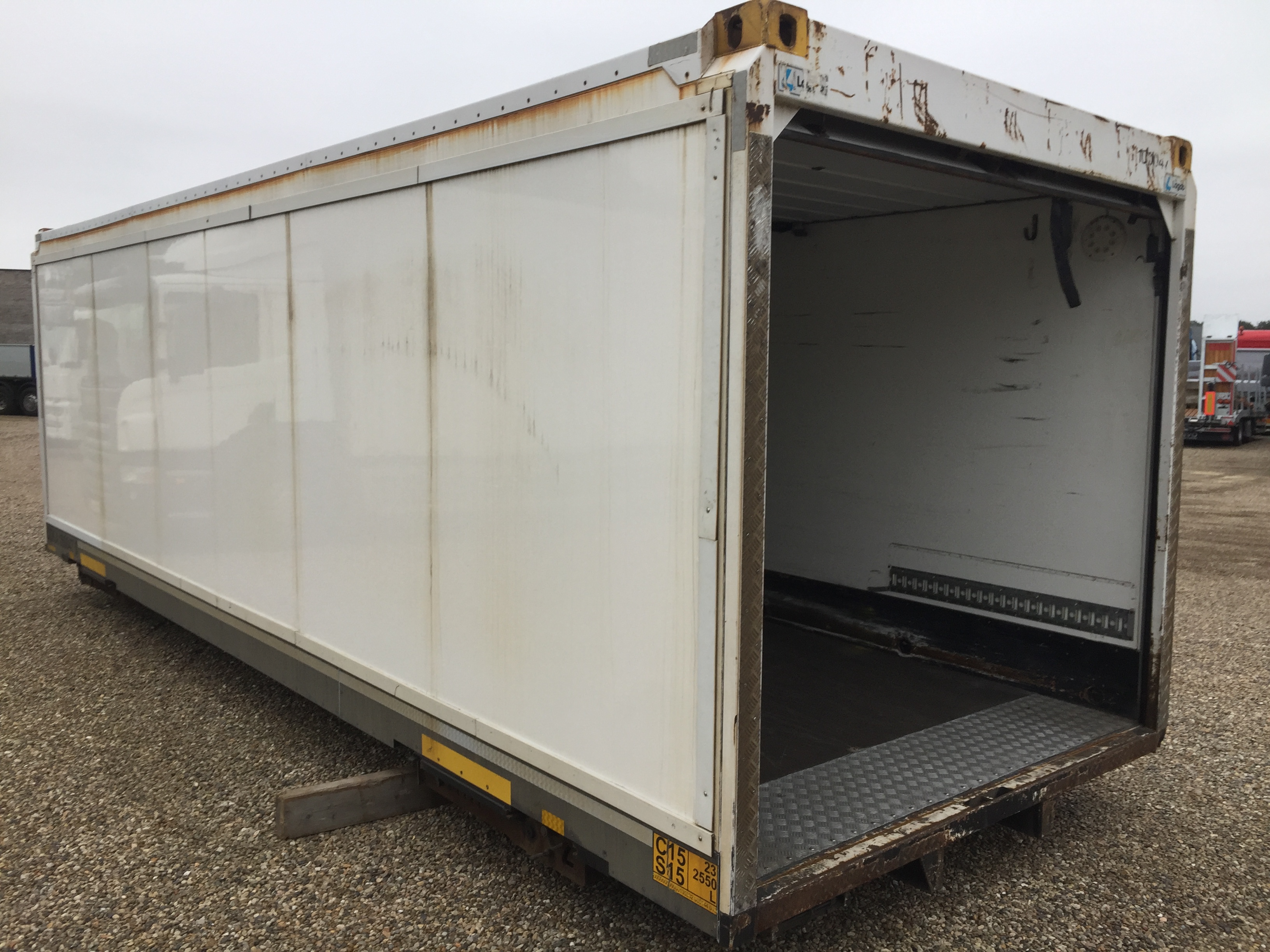 bygget med standard containerlåse 800 + 5850 + 800 mm - rulleport - lysmål under rulleport 2220 mm - indv. længde 7360 mm - 2500 mm bredde - hvid indfarvet kasse uden skader men med brugsspor - egenvægt 3100 kg - totalvægt 16.000 kg - evt tilhørende forvogn og kærre ARKIV FOTOS AF ref 6423 i samme udførsel