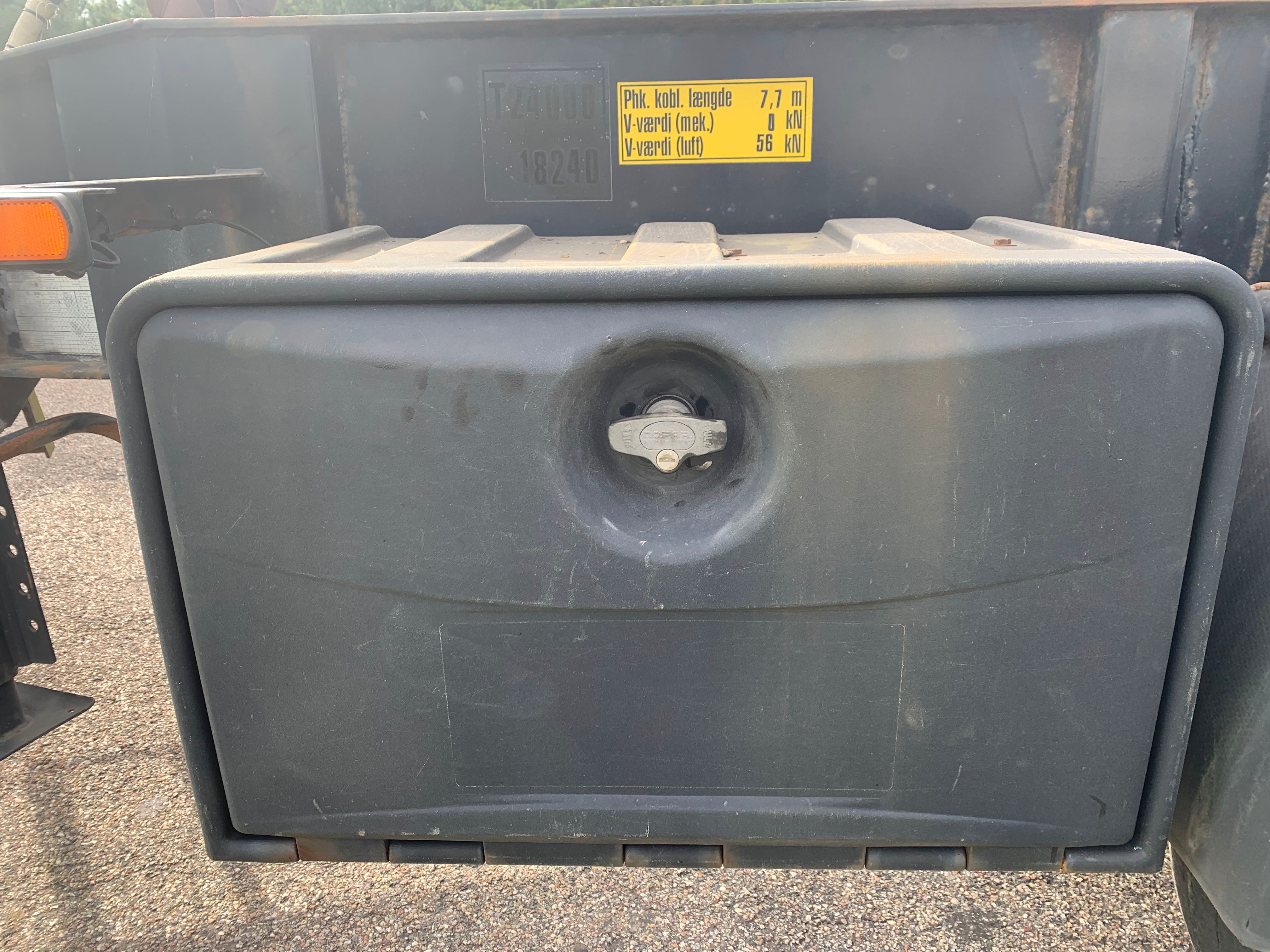 Isoleret container kasse indv. mål L 5500 x H 1100 x B 2300 mm - luftstyret aut bagsmæk - SAF aksler med skivebremser og luftaffjedring - koblings længde 7,7 mtr - bliz lamper + LES baklygter - værktøjskasse - der er skiftet bremsekloder på alle hjul 6/2021 fremstår med pænt chassis i koksgrå