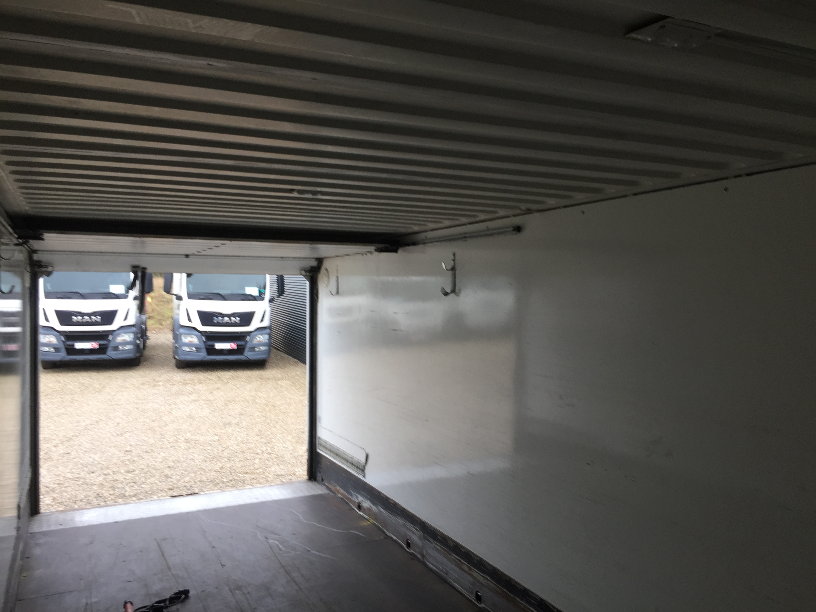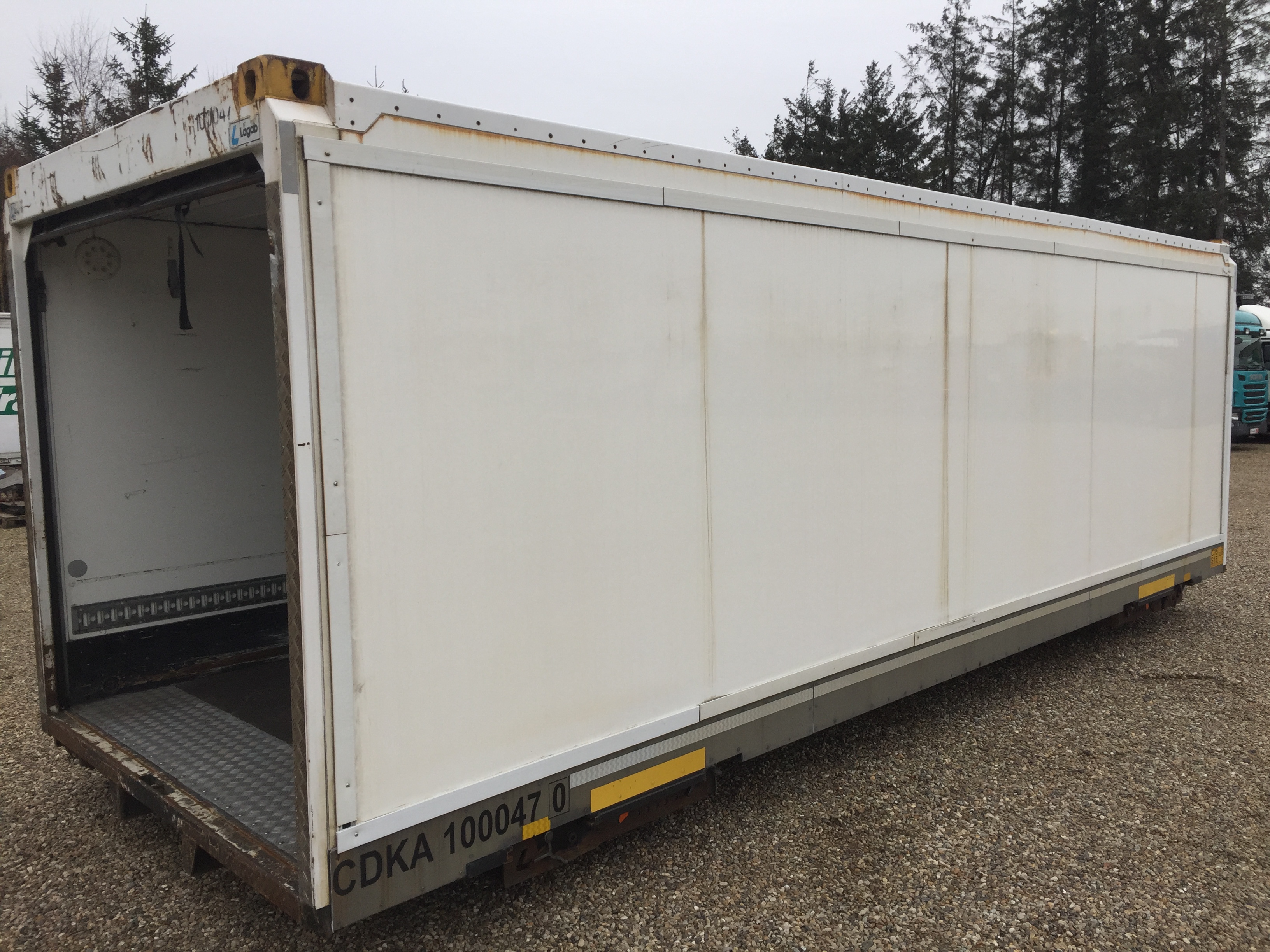 bygget med standard containerlåse 800 + 5850 + 800 mm - rulleport - lysmål under rulleport 2220 mm - indv. længde 7360 mm - 2500 mm bredde - hvid indfarvet kasse uden skader men med brugsspor - egenvægt 3100 kg - totalvægt 16.000 kg - evt tilhørende forvogn og kærre ARKIV FOTOS AF ref 6423 i samme udførsel