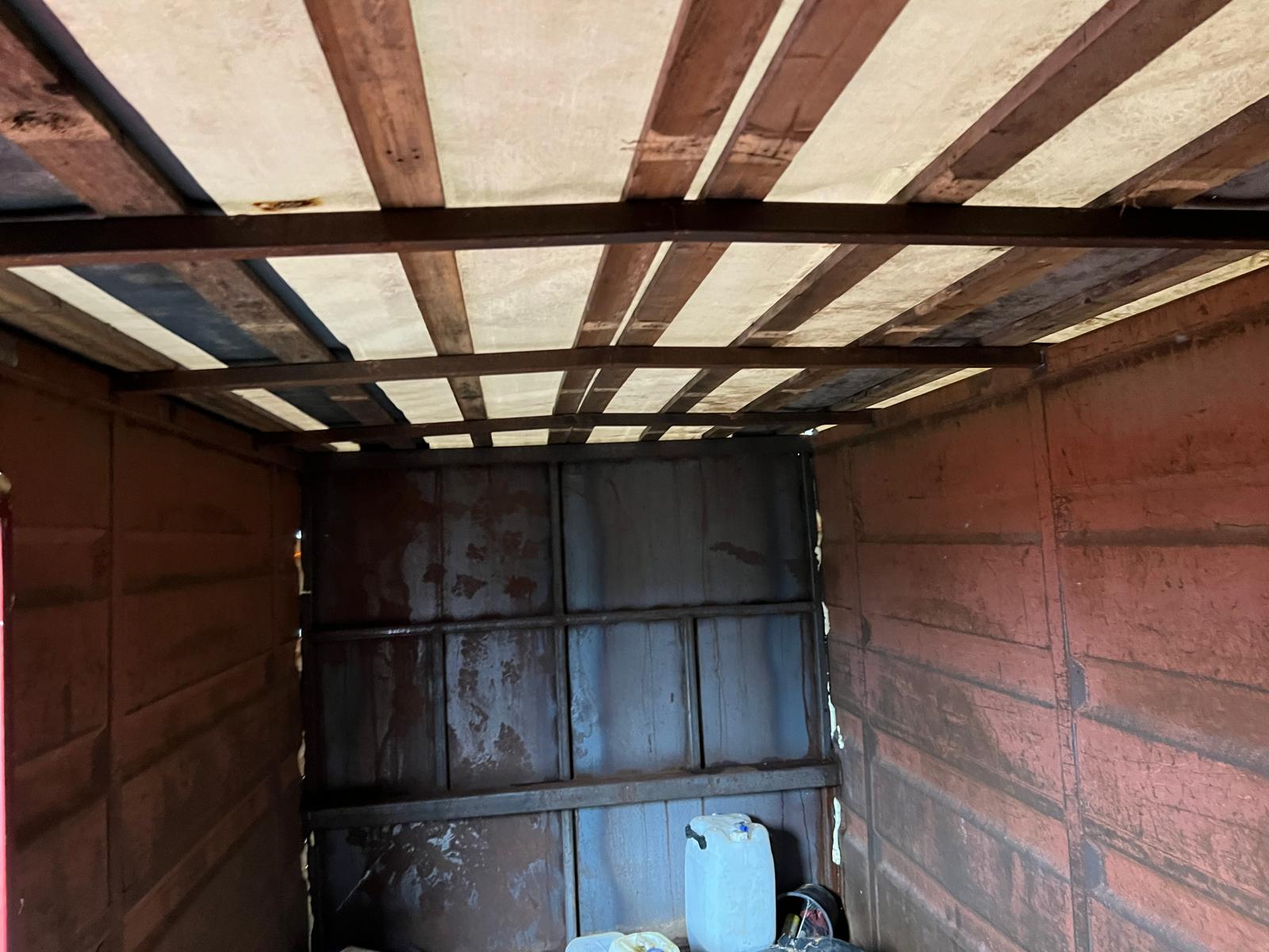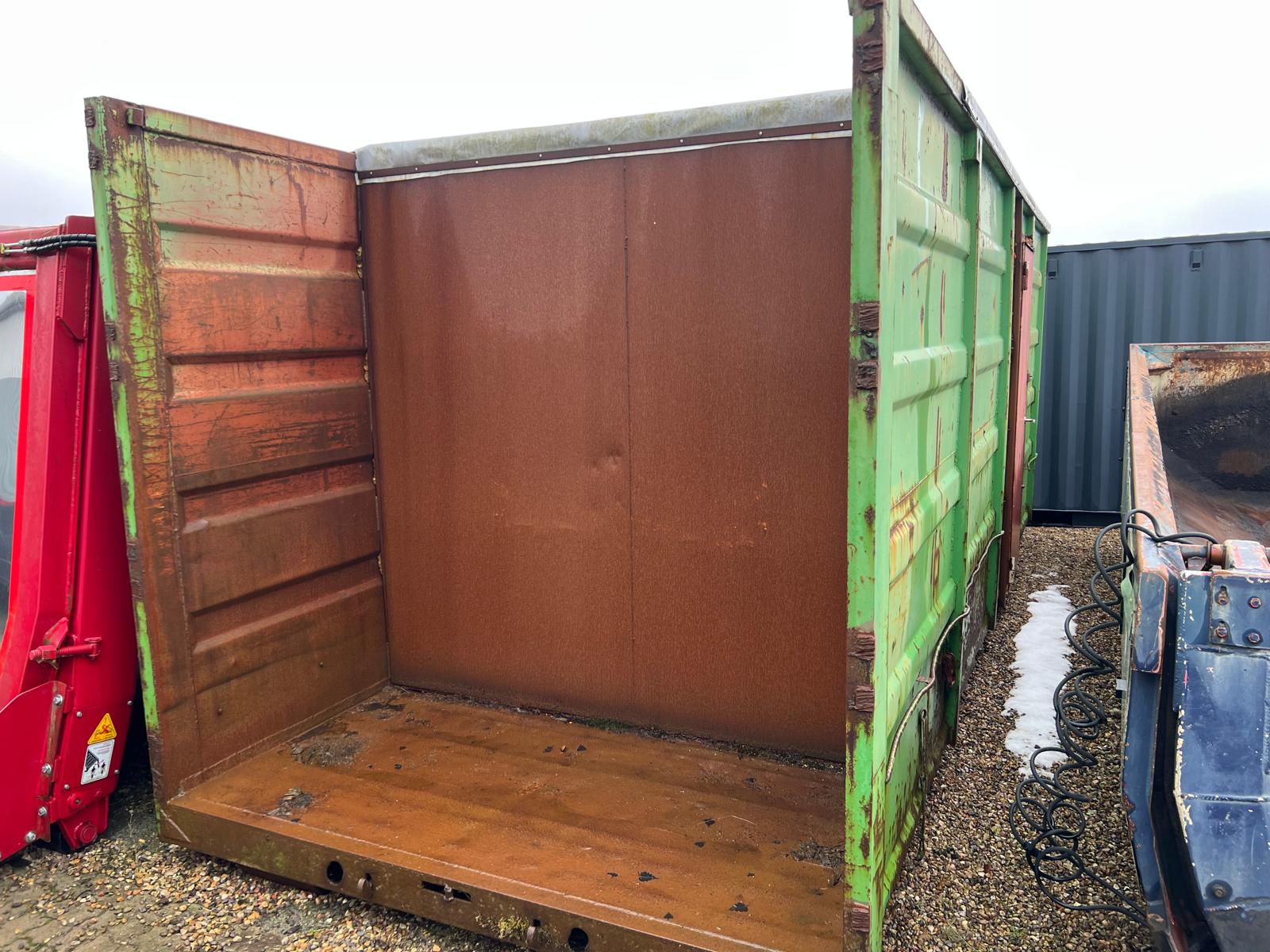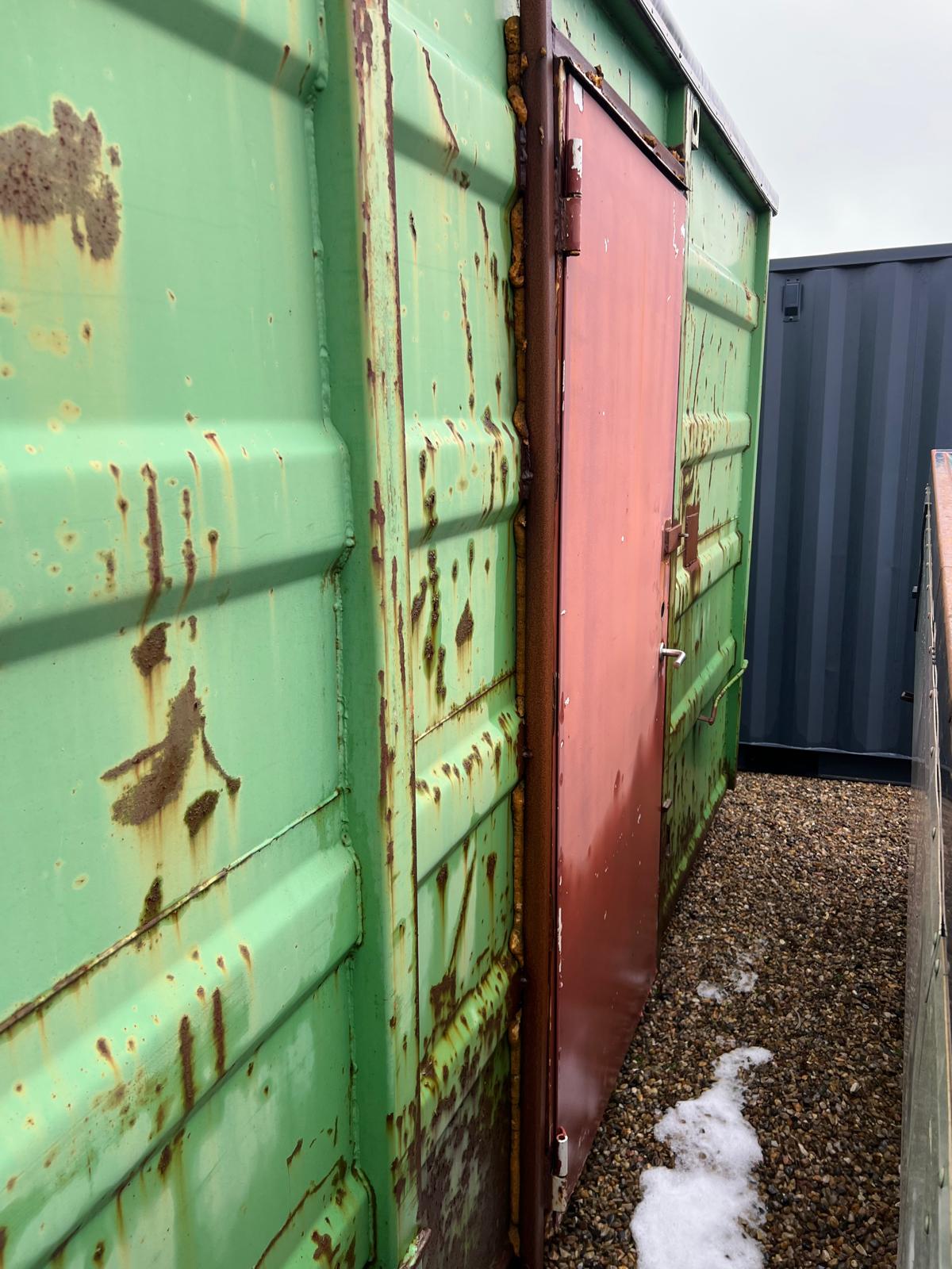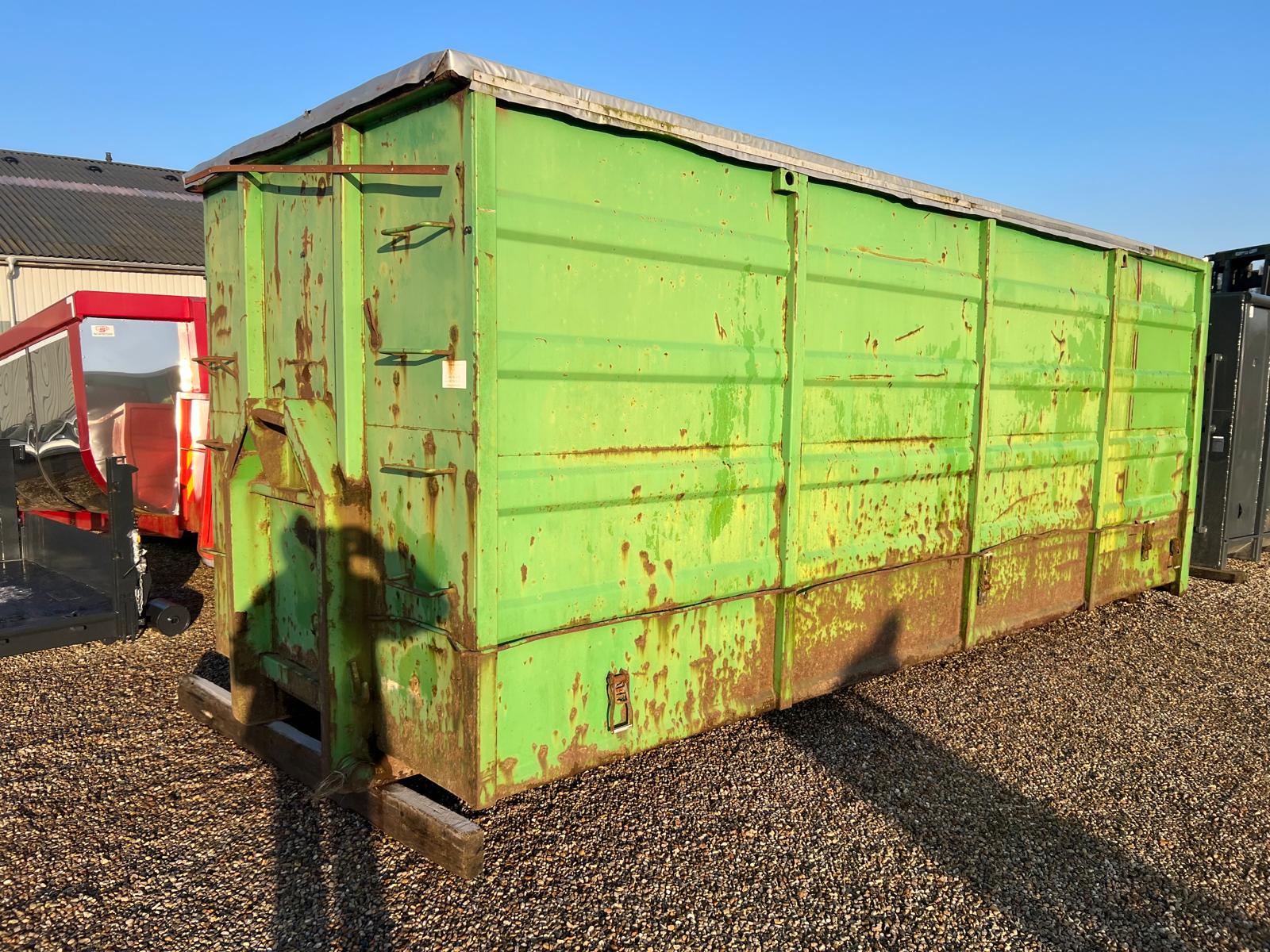 Containeren har stabil lad bunden dog ujævn og lidt tæret men skal ses af køber selv men brugbar til lager opbevaring - kan også bruges som grab kasse ved at fjerne presenningen