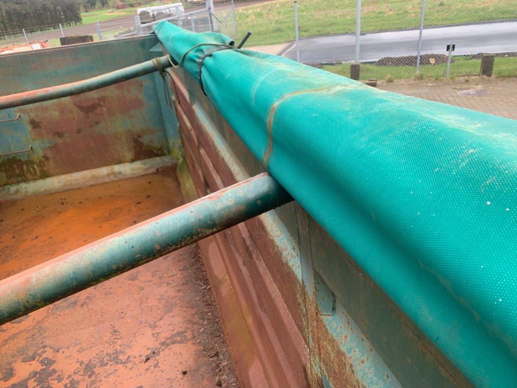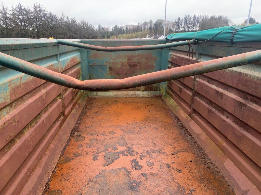 Optræk til wirehejs - Tophængt bagsmæk med lukkefunktion i bunden som kører via luftcylinder (ikke testet) - Sideruller - Bund er god og jævn - Rullepresenning - Stopmål: Ca. 6100mm