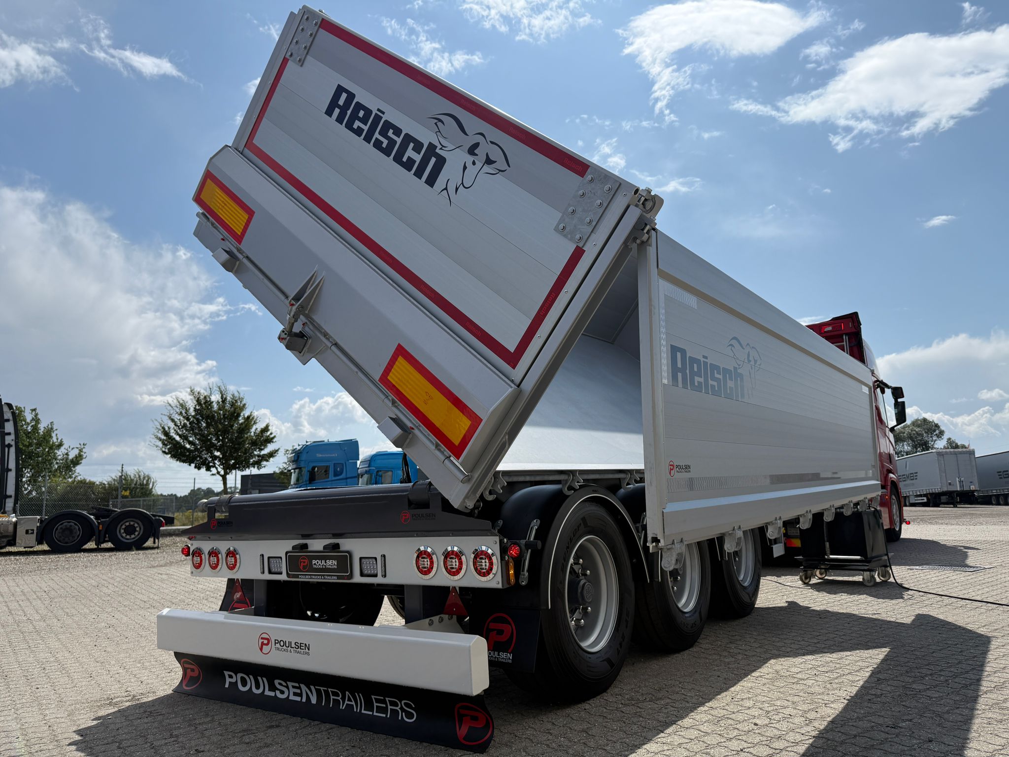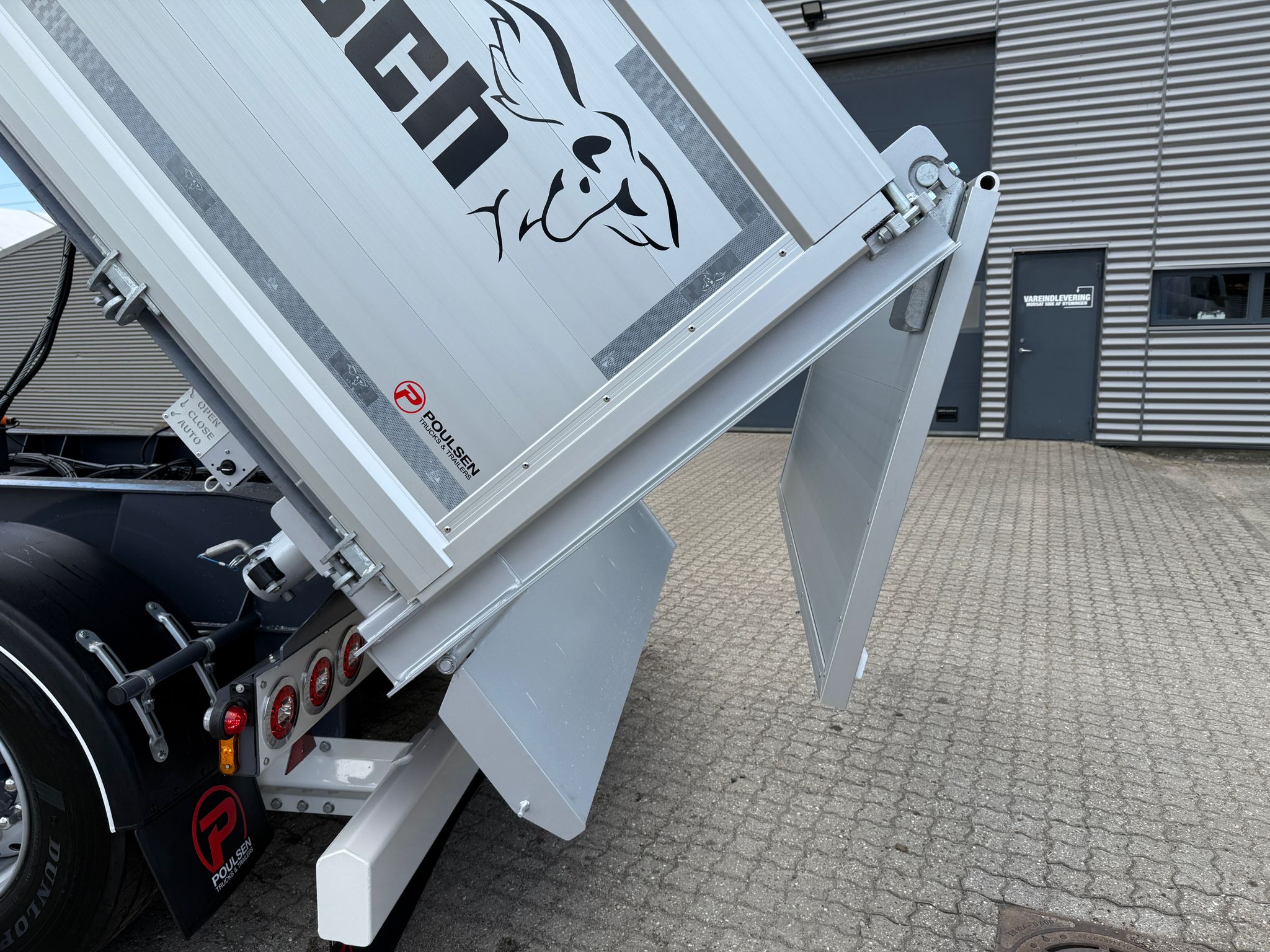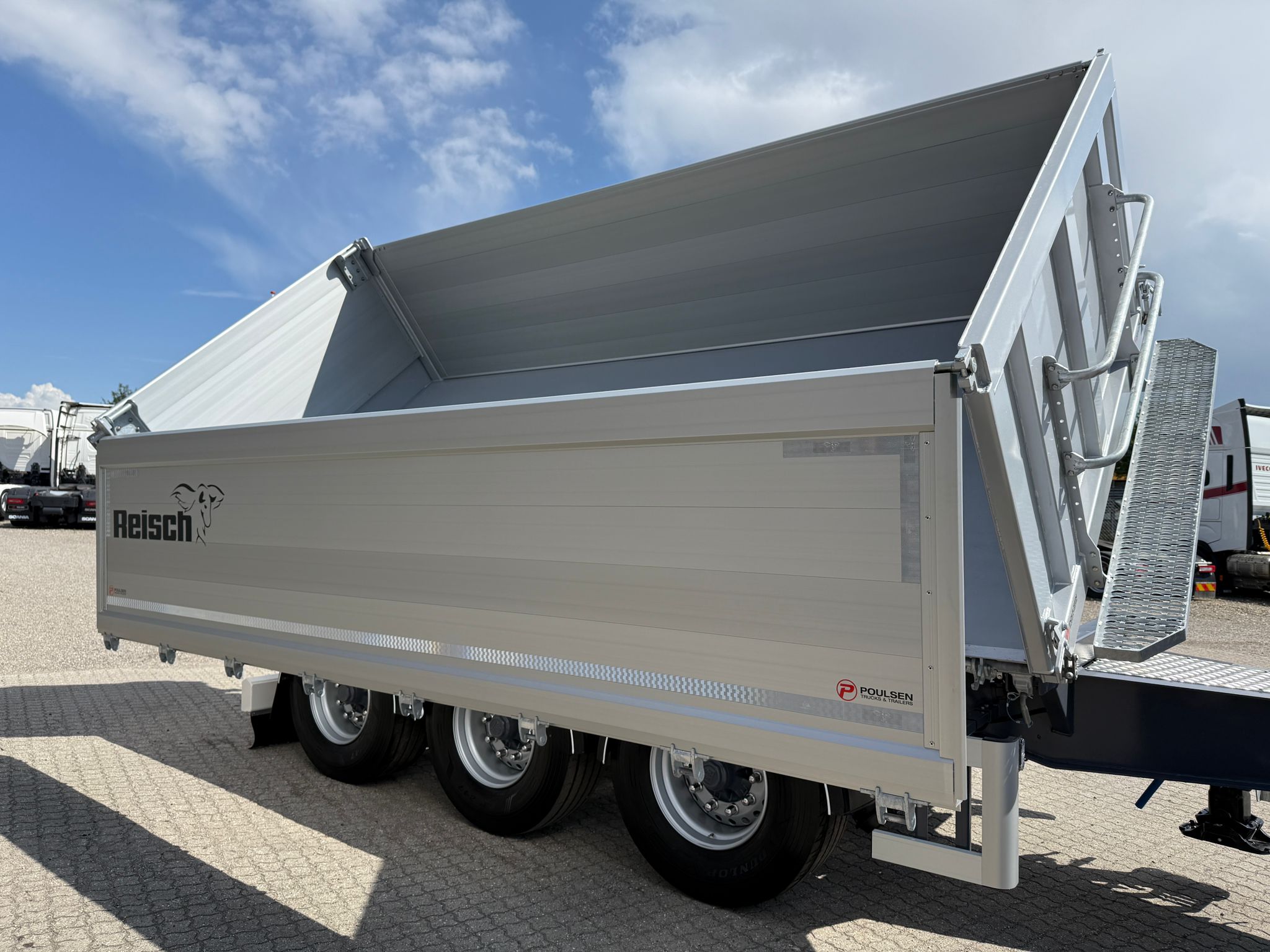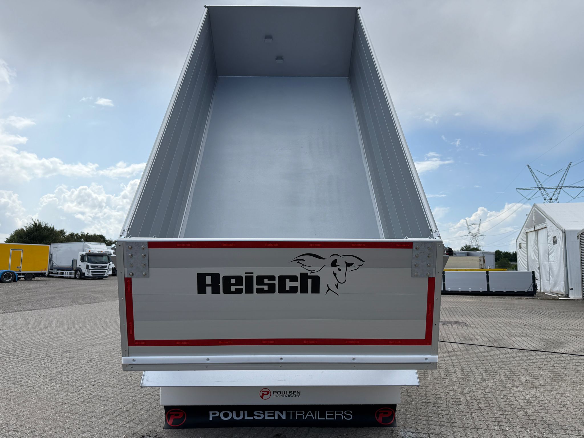 Denne REISCH 15m3 3-vejs metalliseret tipkærre, er udstyret med en kraftig 5 mm Hardox 500 TUF bund, som sikrer en robust og langtidsholdbar løsning.