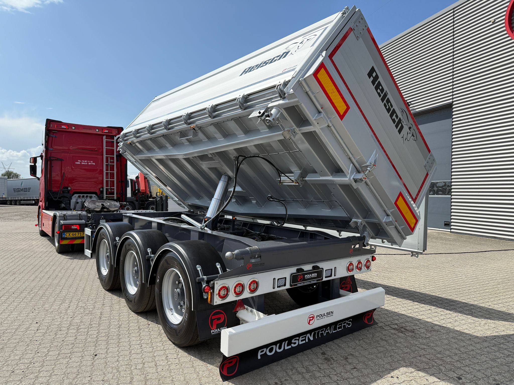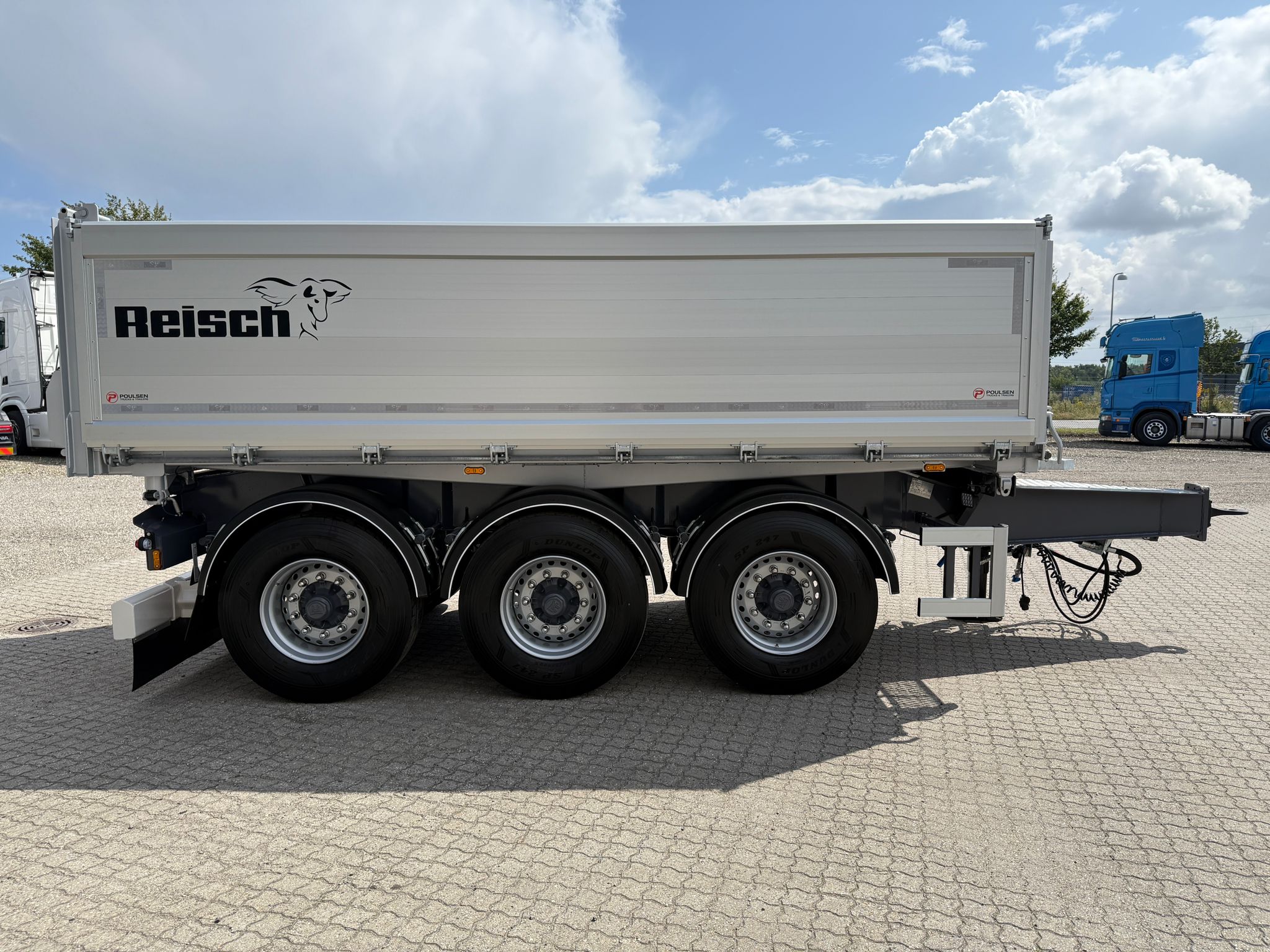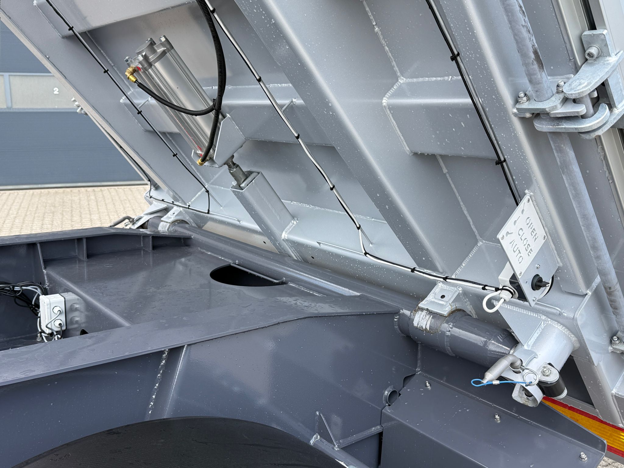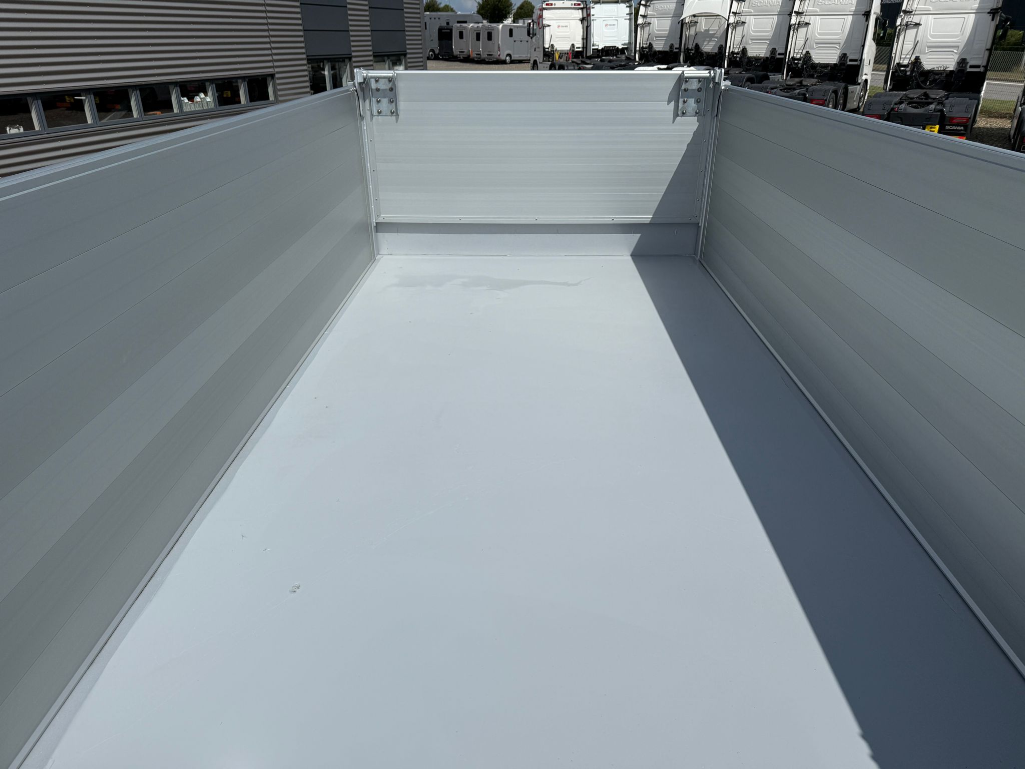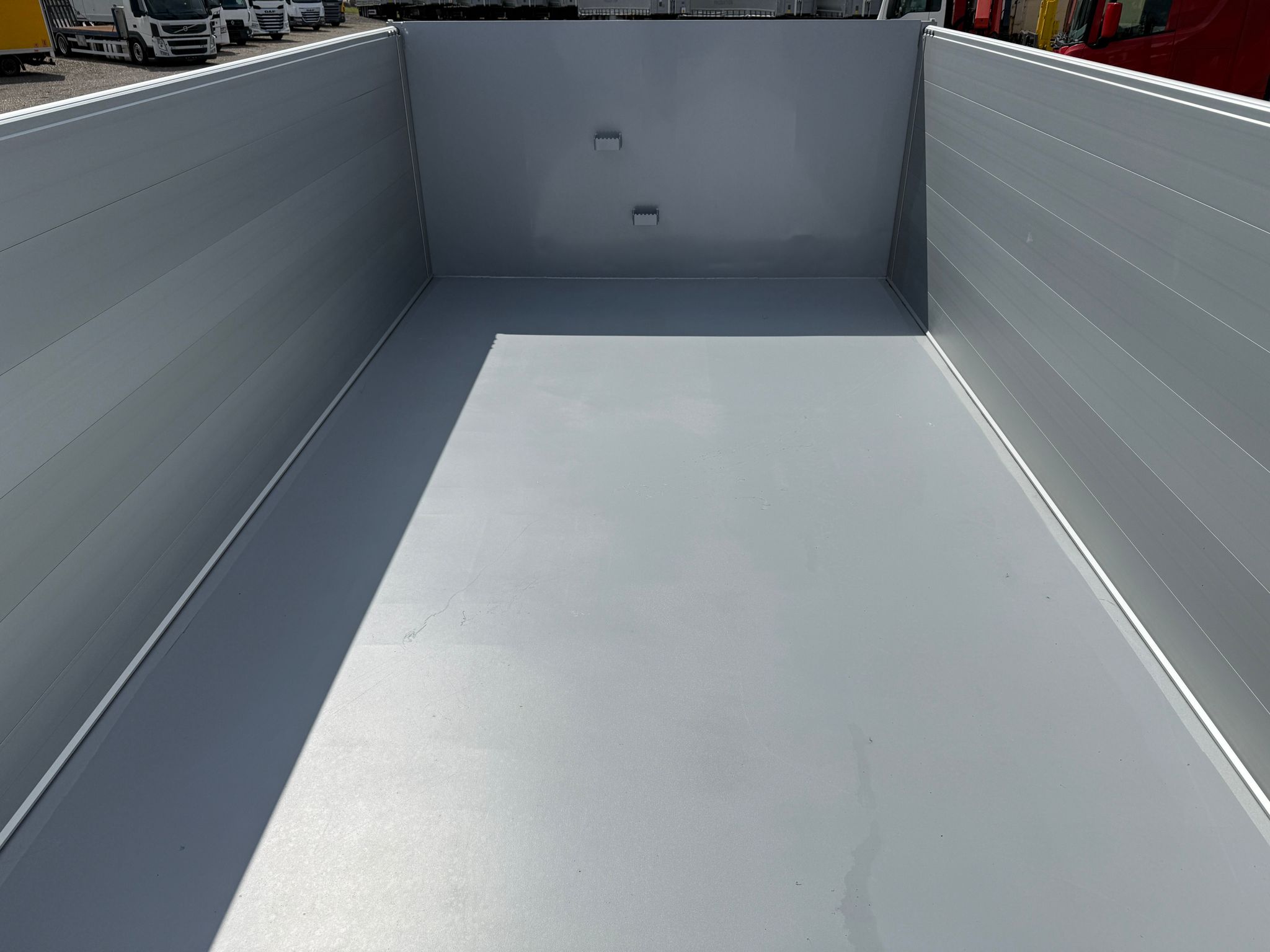 Denne REISCH 15m3 3-vejs metalliseret tipkærre, er udstyret med en kraftig 5 mm Hardox 500 TUF bund, som sikrer en robust og langtidsholdbar løsning.