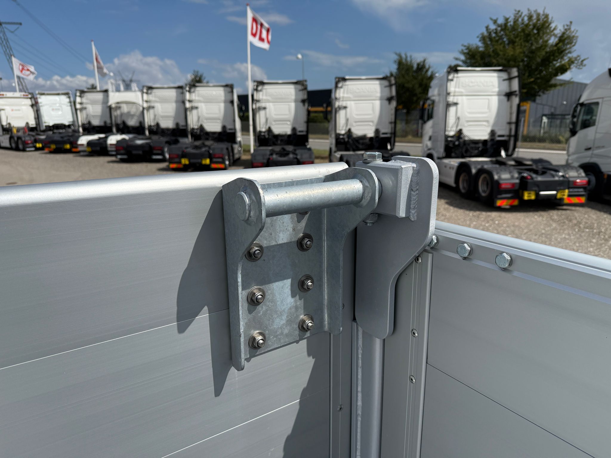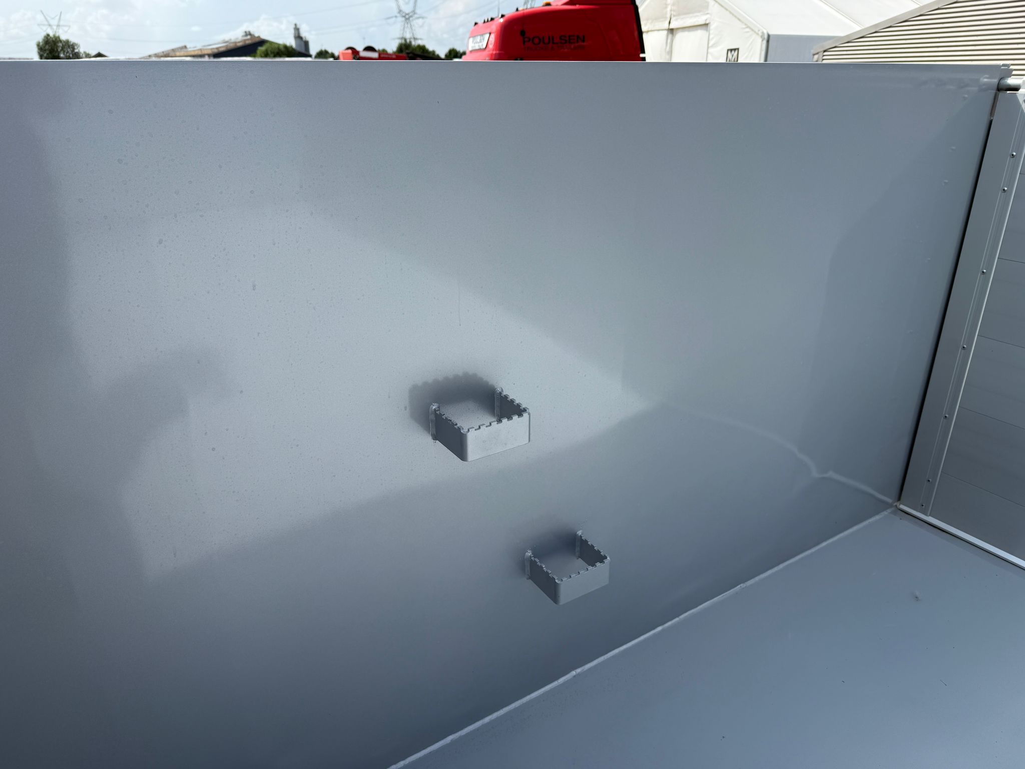 Under ladbunden ca. midtfor på hver side, er der monteret et par rundstål til at fastgøre surringsbånd, hvis sidefælde skal løftes op igen med kran eller lignende, efter at have været foldet ned.