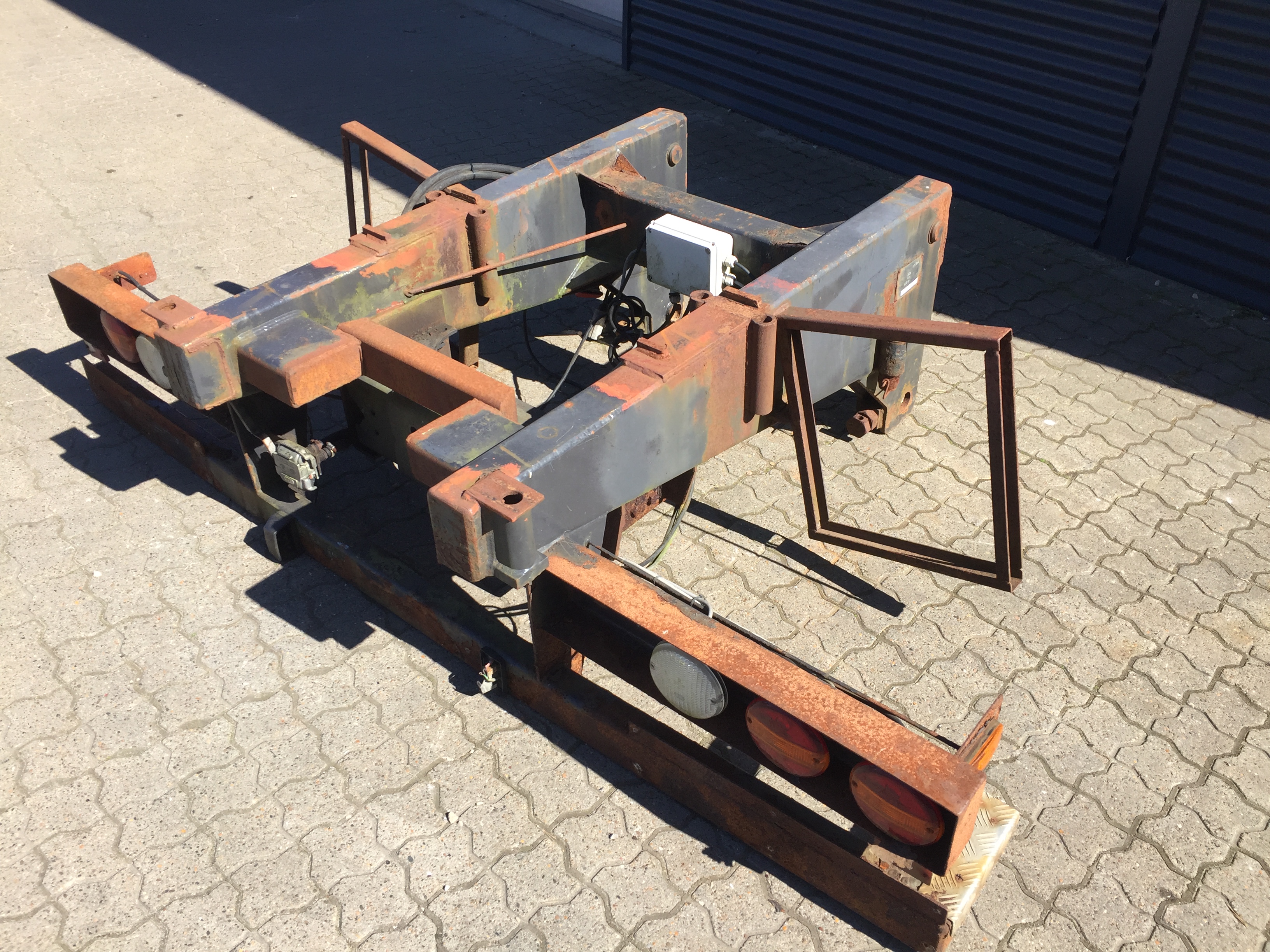 Aftagelig HMF 14 t/m krankonsol med Volvo træktravers med D værdi - 190kN - V -værdi 50kN - lys, luft og trukket med bagud - støttebens pladeophæng i begge sider - Mål: 770 mm fra center til center mellem vanger - gaffelbredde 600mm som går ind over kranophængs beslag - 50 mm ophængs bolte - 475mm fra nederste bolt til øverste - 1500 mm langt.