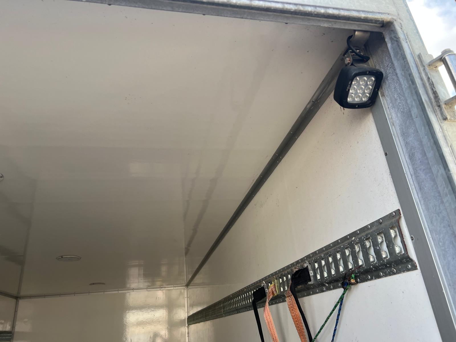 tilhørende 2 stk. glasfiber veksellads kasse 30m3 - Indvendige ladmål L 5350 x H 2300 (lysmål 2250 mm) x B 2440 mm - bagdøre - 3 binde rækker - finer ladbund - LED lys i taget - læsse højde 1020 mm - container låse højde 880 mm