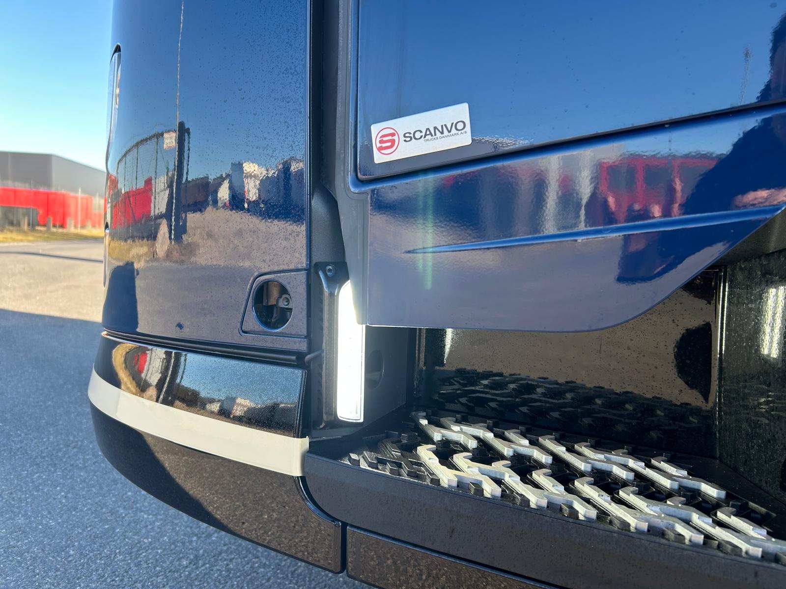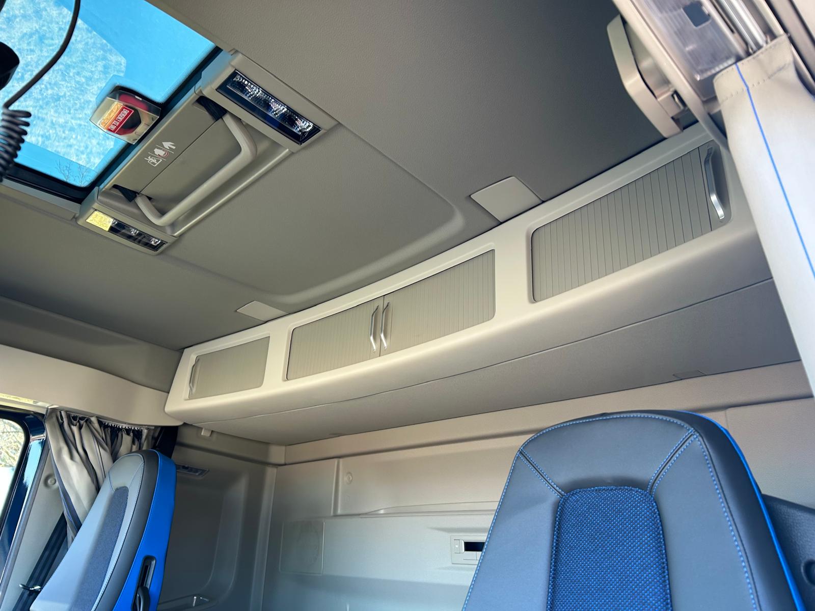 Areo førerhus - 1 køje - klimaanlæg - motor/kabinevarmer - radio - navigation - luftaffjedret førerhus - 33 ltr køleskab - lastindikator LED forlygter - læderrat - RAL 5011 blue førerhus lakering - staffering er påmalet - rød chassis