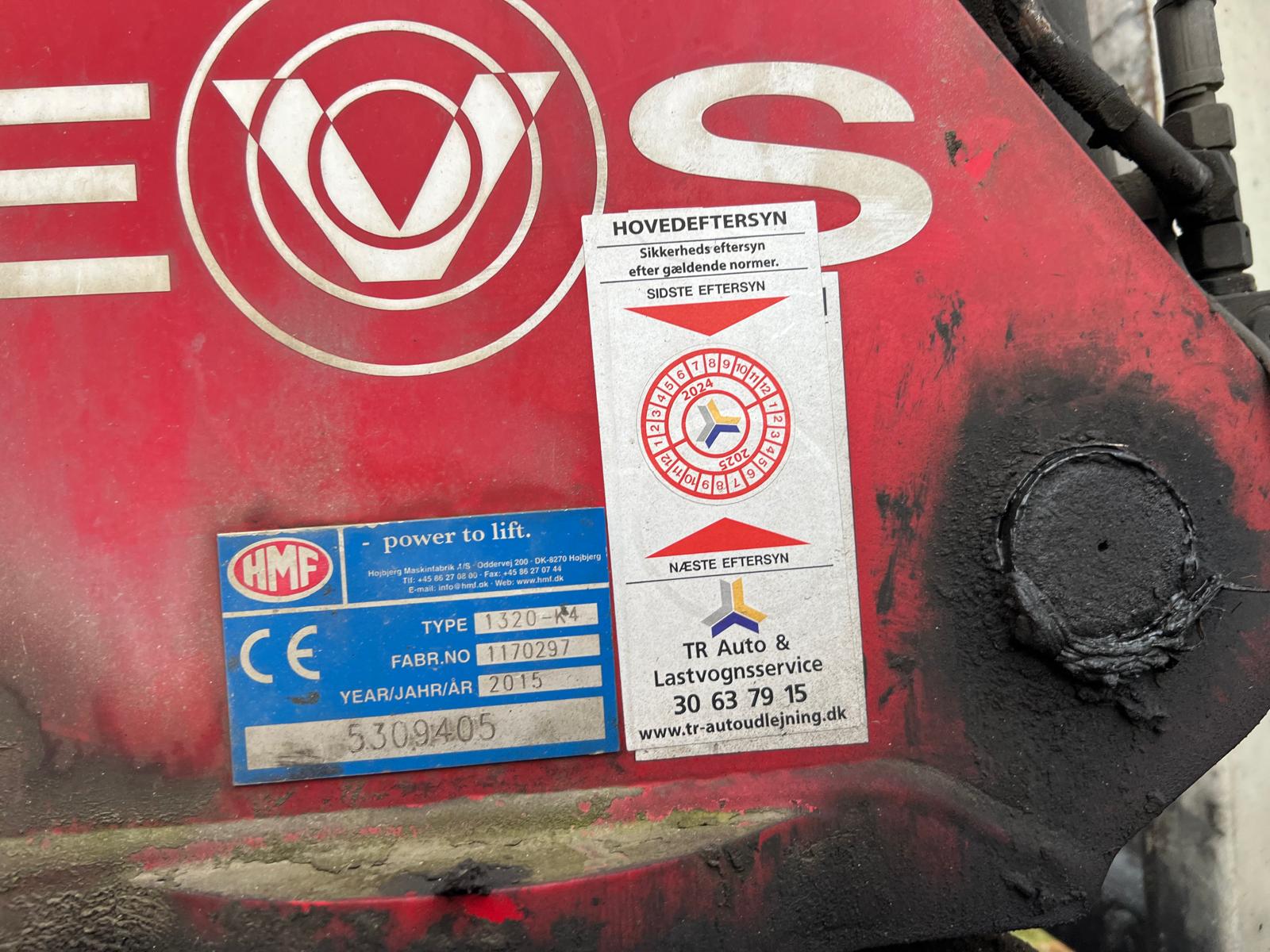 HMF 1320K kran med dobbelt rørføring til grab og drejemotor - slangeruller - radiostyring - lys på kranarm - rækkevidde 12,7 mtr. = 760 kg løfte kapacitet - 11,3 ton/meter løfte moment - kranen er år 2015