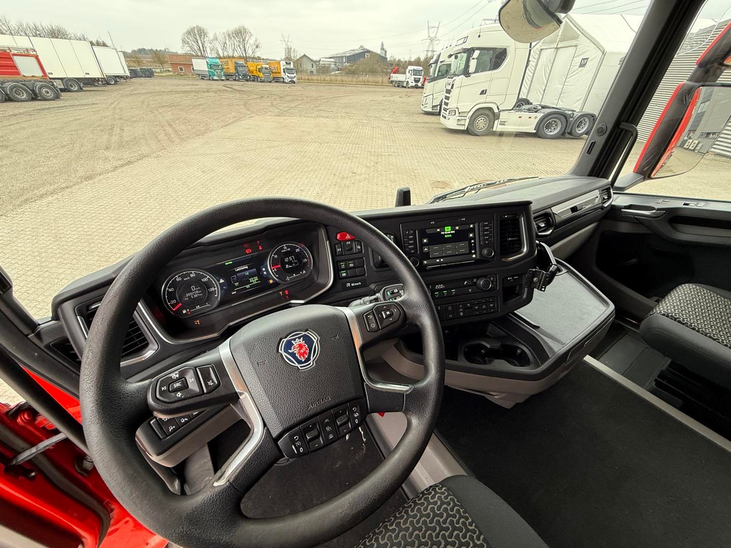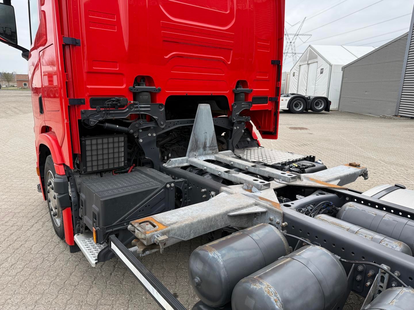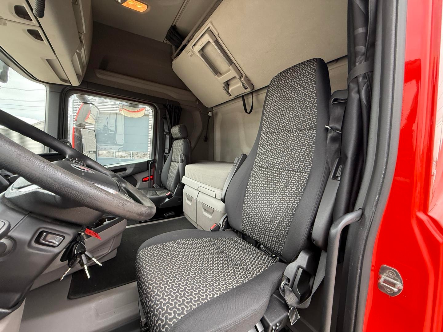 Kabinen CR20 H - 2 køjer - kabinevarmer - klimaanlæg - luftaffjedrede sæder - radio - walkie - køleskab - sporassistent, lastindikator, ACC og adaptiv fartpilot - Scania stand klima / air cooler - fabriks lakeret førerhus i Spicy Red (RAL3020 CM)