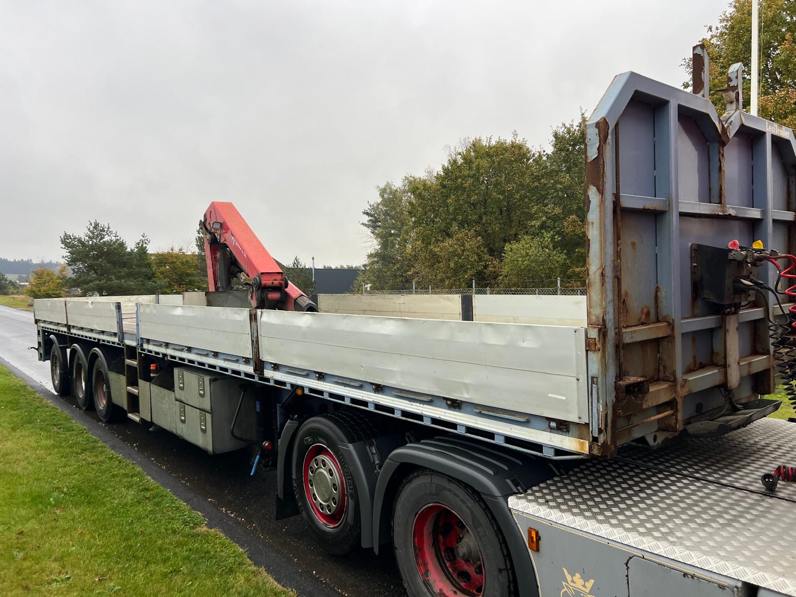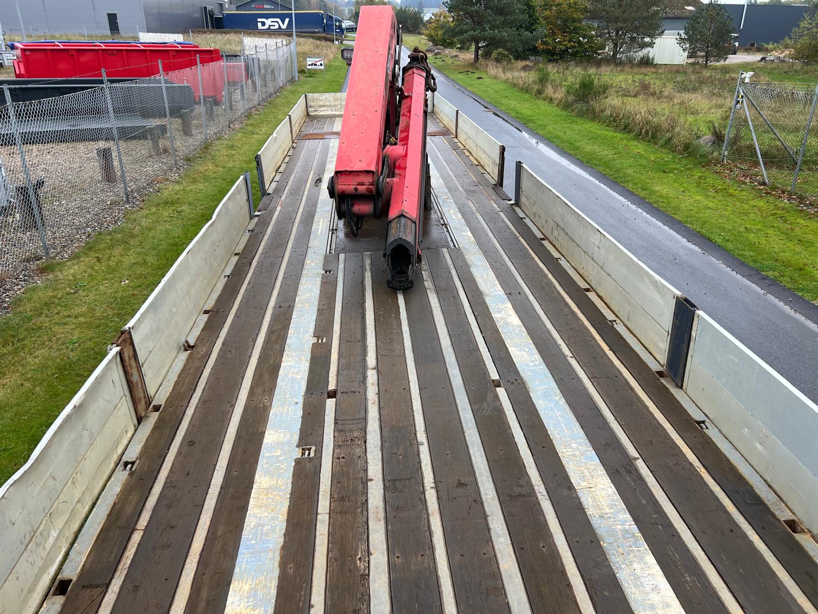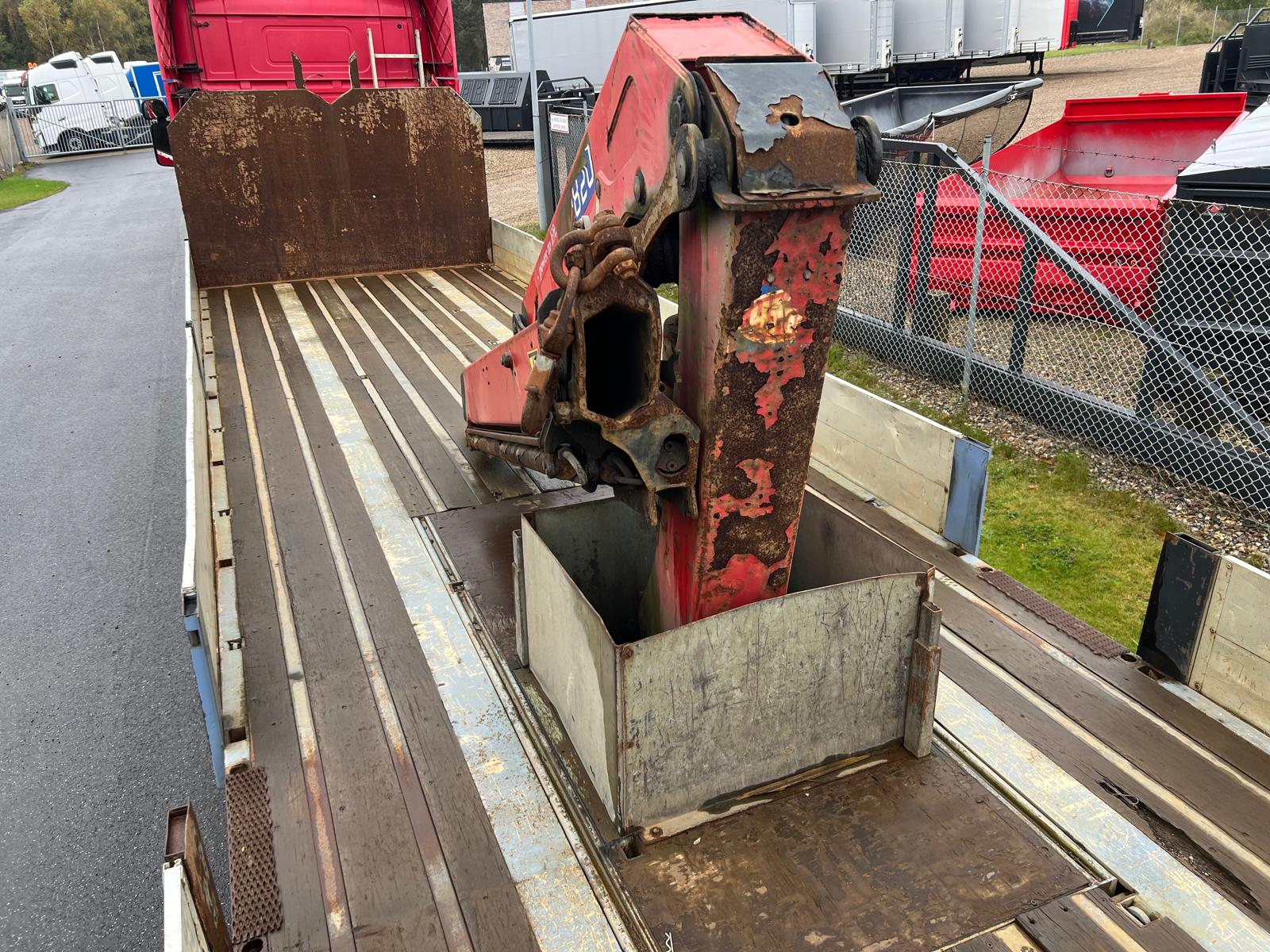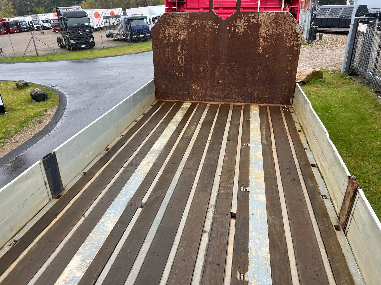 Indvendig længde 13600 mm - 6300 mm forrest stykke frem til kran - kranen fylder 850 mm - derefter 6300 mm åben lad - 400 mm alu. sider med kippegrebsstolper - hårdtræs land bund som er i god stand med stål profiler imellem - diverse nedfældet surrings ringe i ladkant samt 2 rækker længere inde på ladbunden - lad højde 1400 mm - værktøjskasser - diverse arbejdes lygter under lad samt bliz lygter
