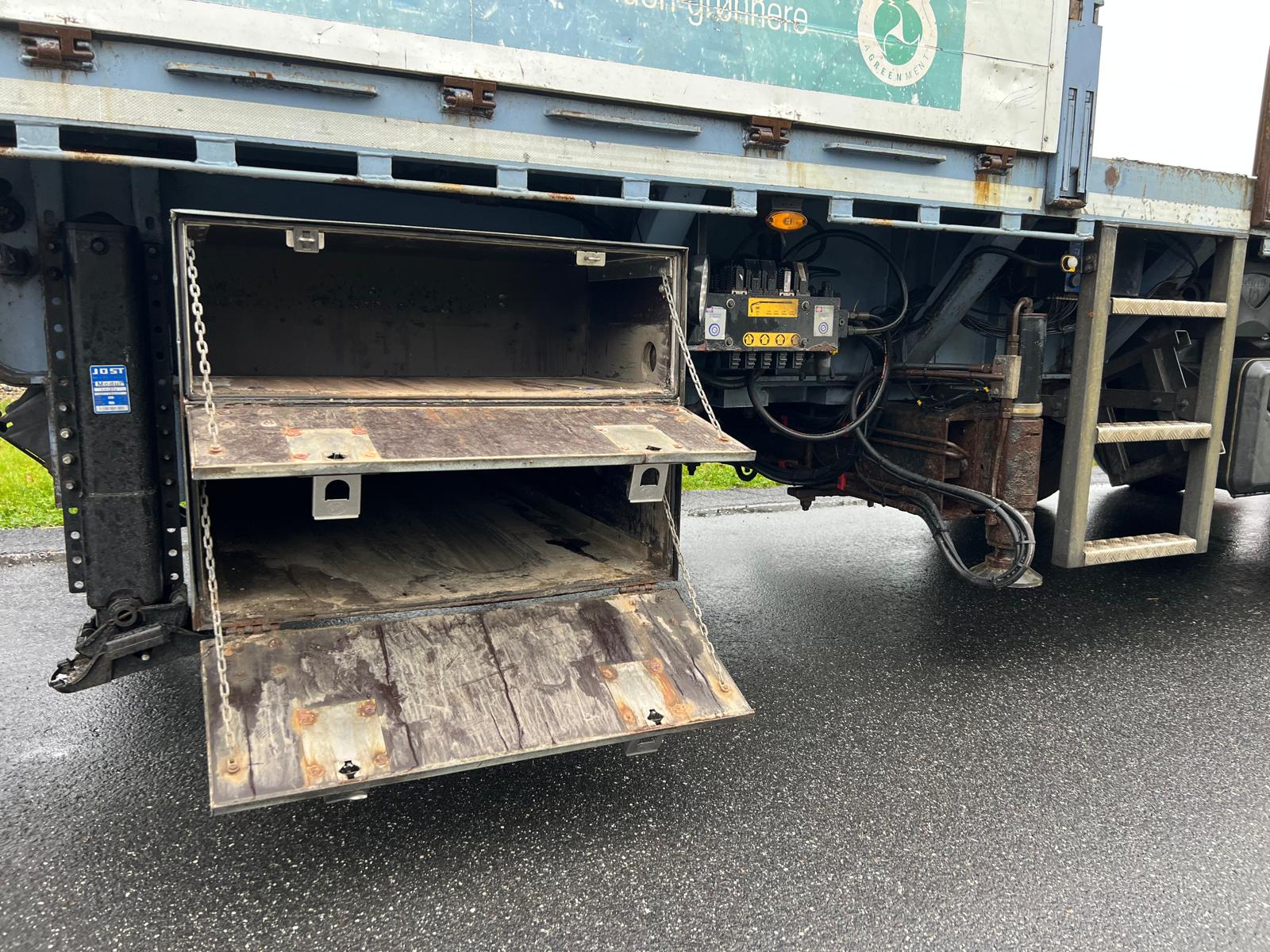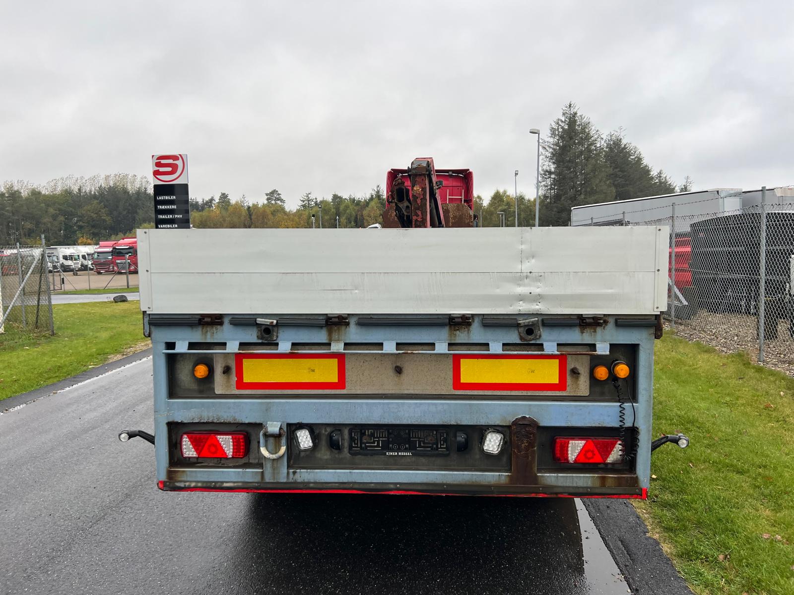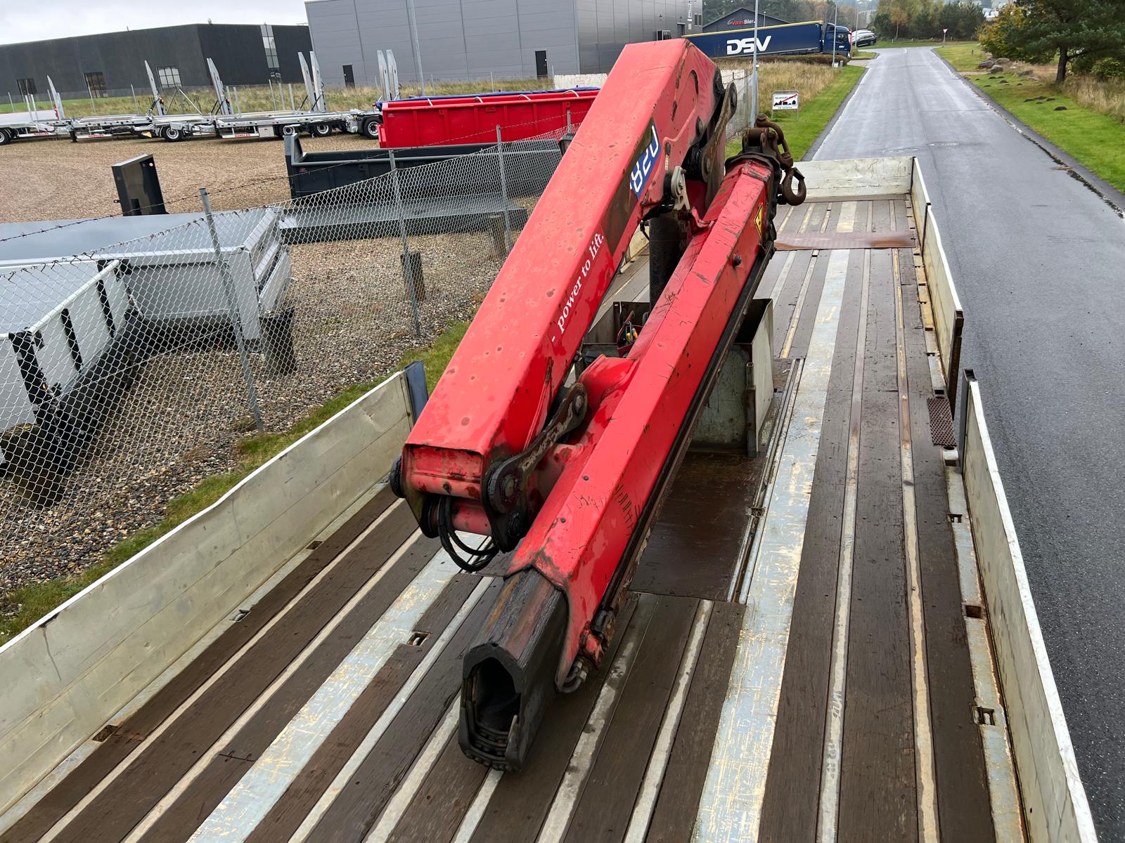 Indvendig længde 13600 mm - 6300 mm forrest stykke frem til kran - kranen fylder 850 mm - derefter 6300 mm åben lad - 400 mm alu. sider med kippegrebsstolper - hårdtræs land bund som er i god stand med stål profiler imellem - diverse nedfældet surrings ringe i ladkant samt 2 rækker længere inde på ladbunden - lad højde 1400 mm - værktøjskasser - diverse arbejdes lygter under lad samt bliz lygter