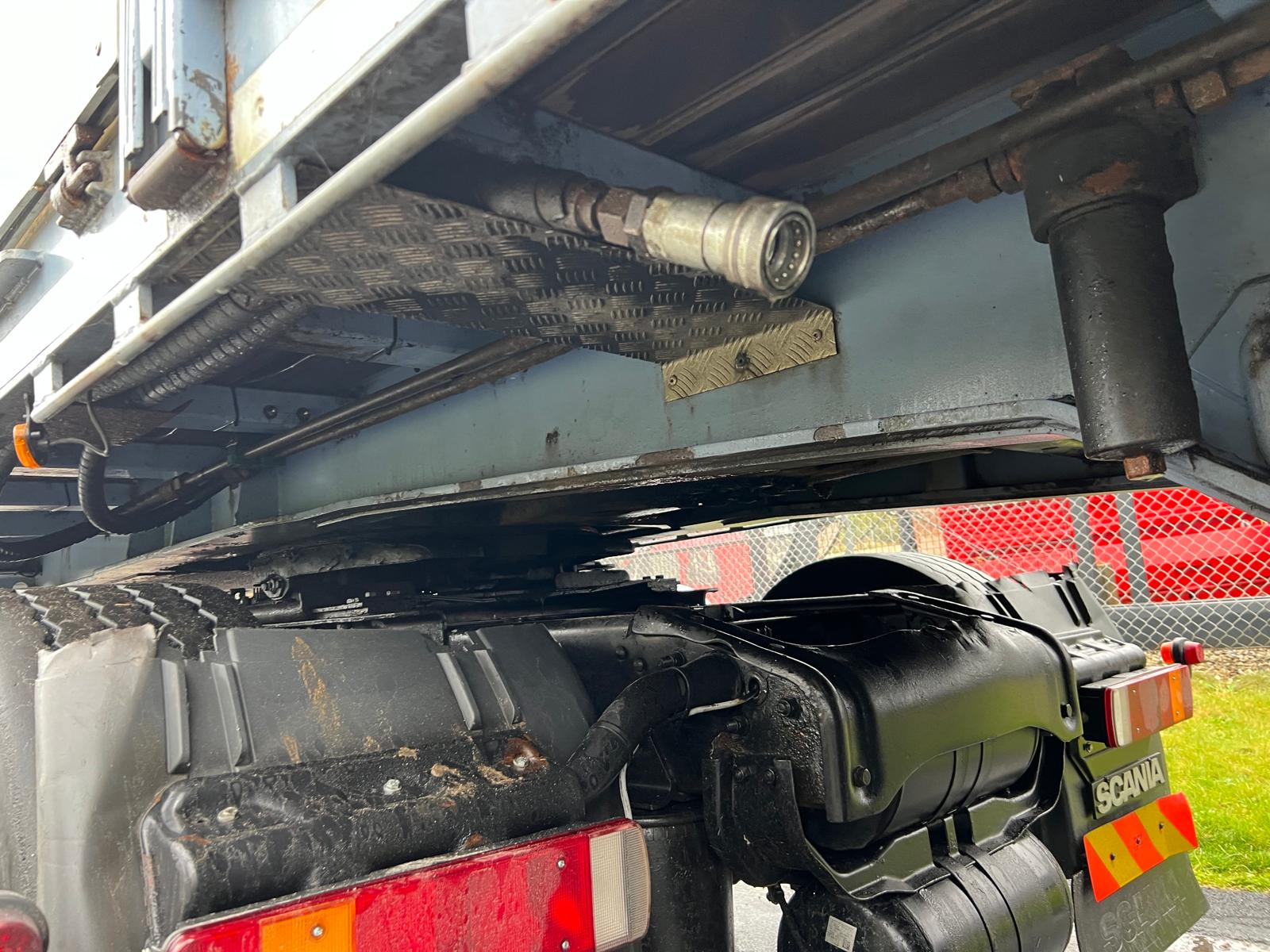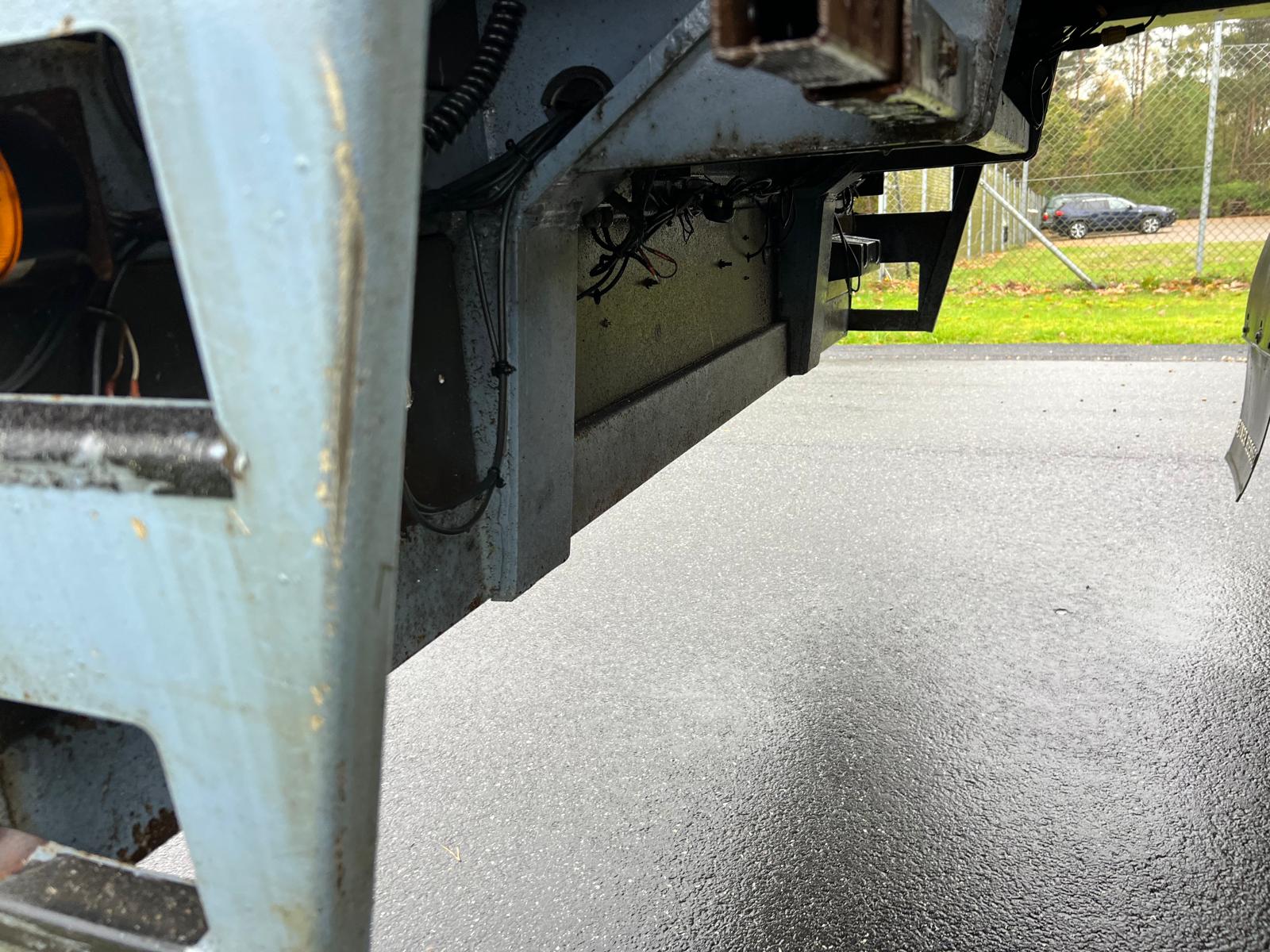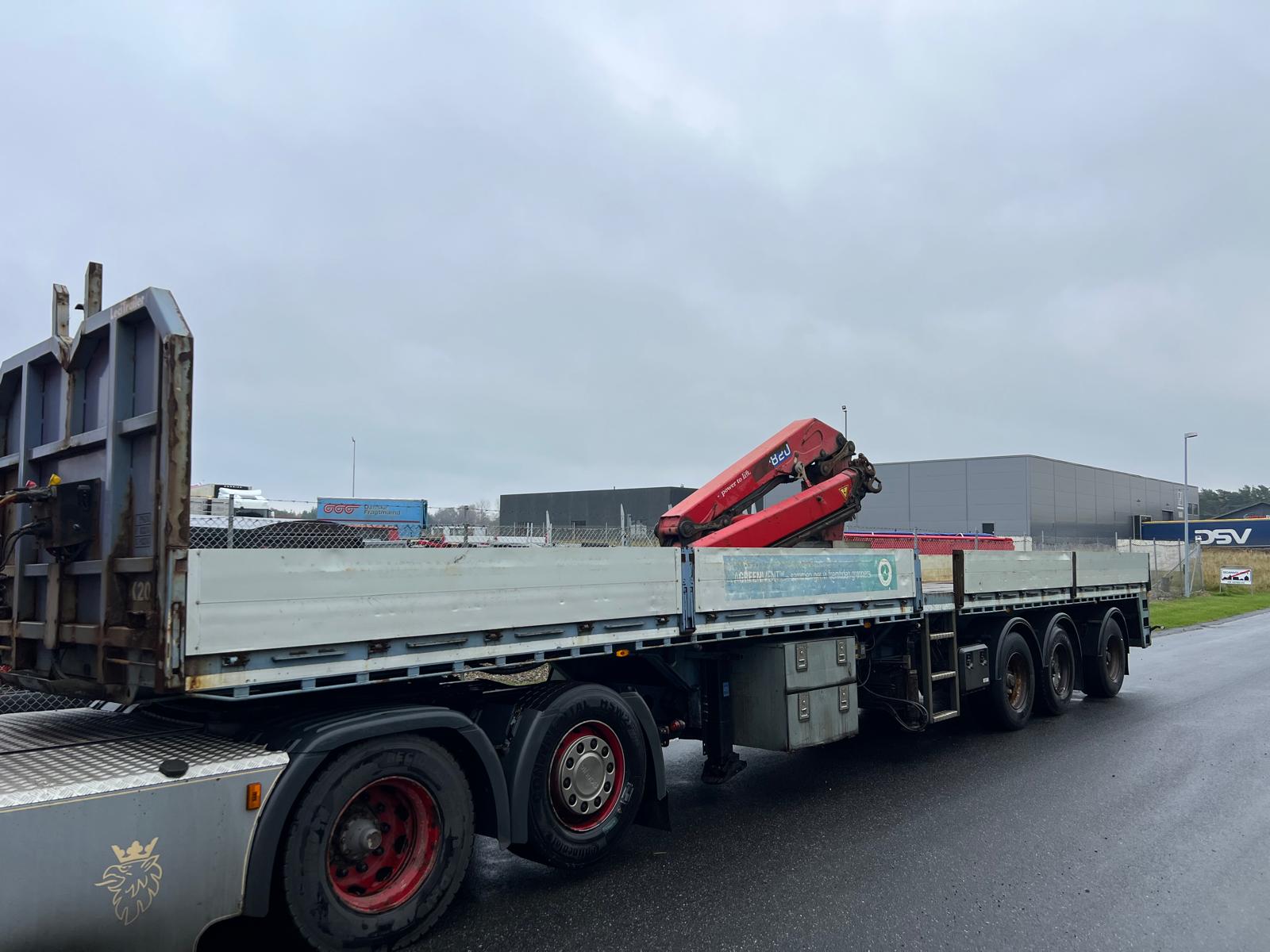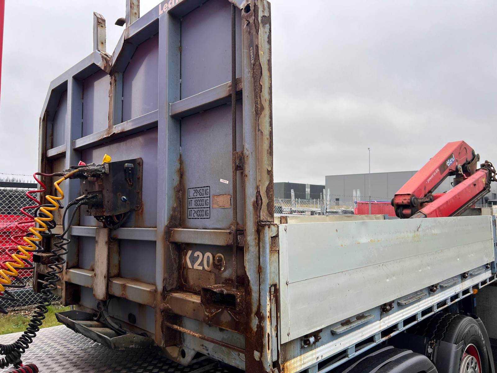 Indvendig længde 13600 mm - 6300 mm forrest stykke frem til kran - kranen fylder 850 mm - derefter 6300 mm åben lad - 400 mm alu. sider med kippegrebsstolper - hårdtræs land bund som er i god stand med stål profiler imellem - diverse nedfældet surrings ringe i ladkant samt 2 rækker længere inde på ladbunden - lad højde 1400 mm - værktøjskasser - diverse arbejdes lygter under lad samt bliz lygter