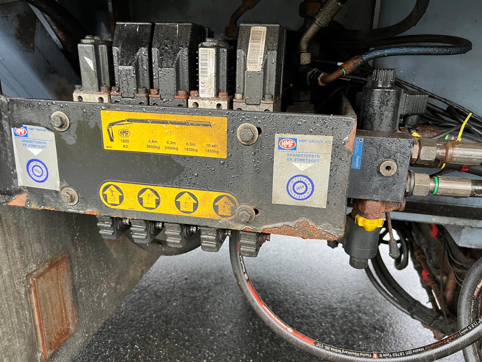 HMF 1820K3 kran 3 hydrauliske udskud - radiostyring - krogkran - år 2015 - rækkevidde 10,4 mtr. = løfter 1450 kg - løftemoment 16,1 ton - center monteret kran - sidste kraneftersyn 12/2024 - 2 strengs hydraulik til kranen trækkes via lastbilen