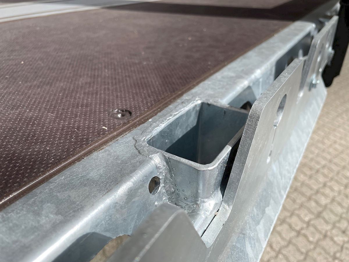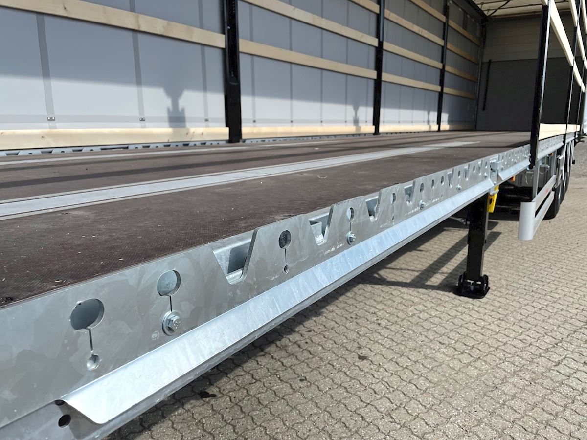 Udstyret med: Multi-kantskinne med mange surringsmuligheder - Truckværn/pallestop boltmonteret på begge kantskinner - Truckværn indvendigt nederst på frontvæggen - Kæpstokke Huller langs begge kantskinner samt langs midten - 1.200mm galvaniserede kæpstokke i magasin på hver side af chassiset (7+7 stk.) - Færgekroge - Luftaffjedring med hæve-/sænkeventil - 1x15-polet + 2 x 7-polet lysstik mm