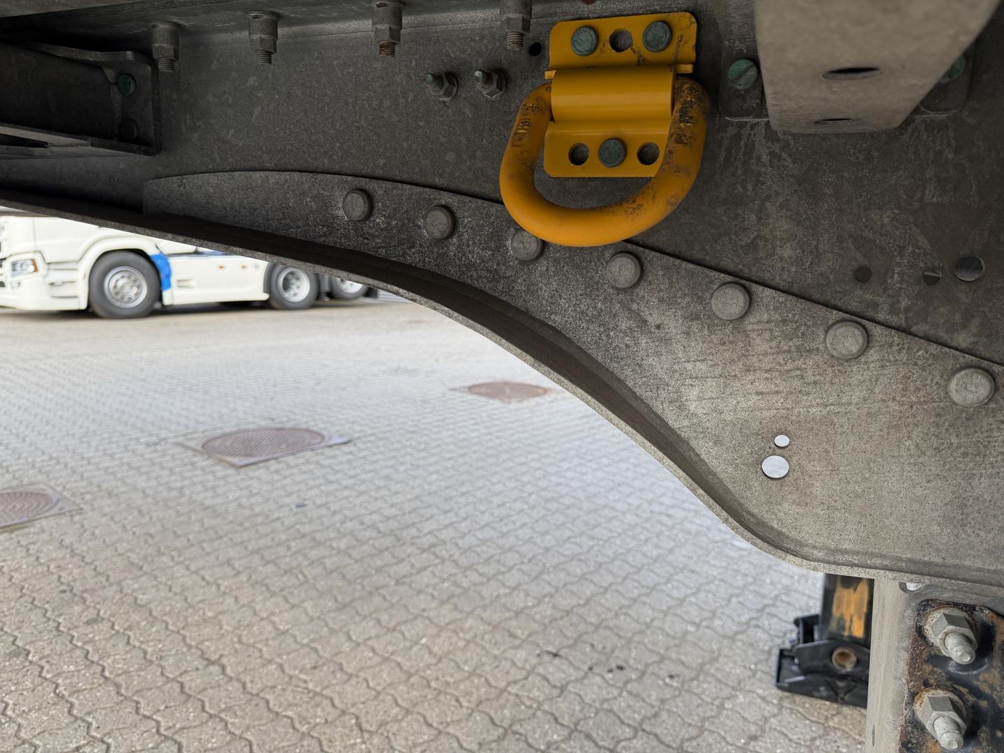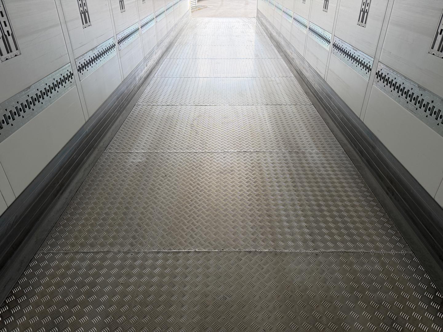 Jerndørkplade 400mm ind fra bagenden og derefter alu dørk plader som er svejset i samlingerne - 7100 kg tryk fra gaffeltruck - 1 binderække i 750mm højde