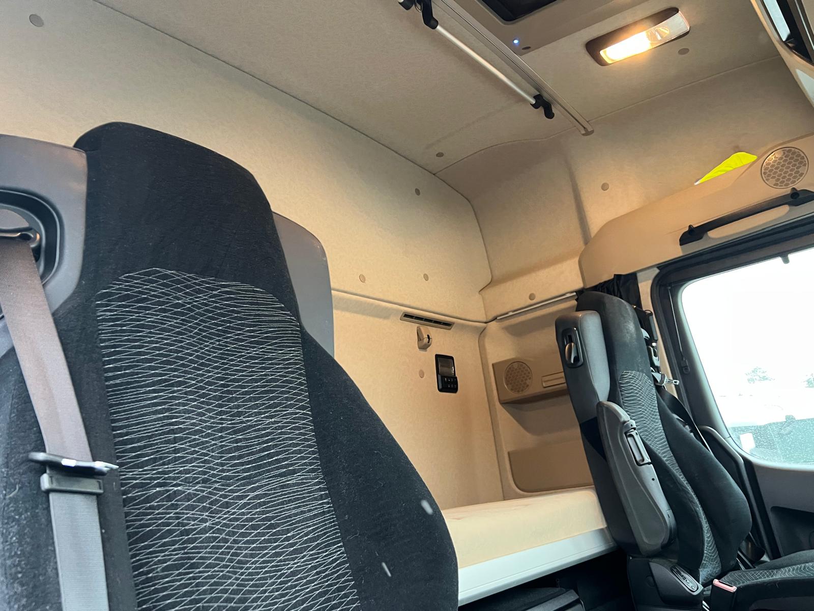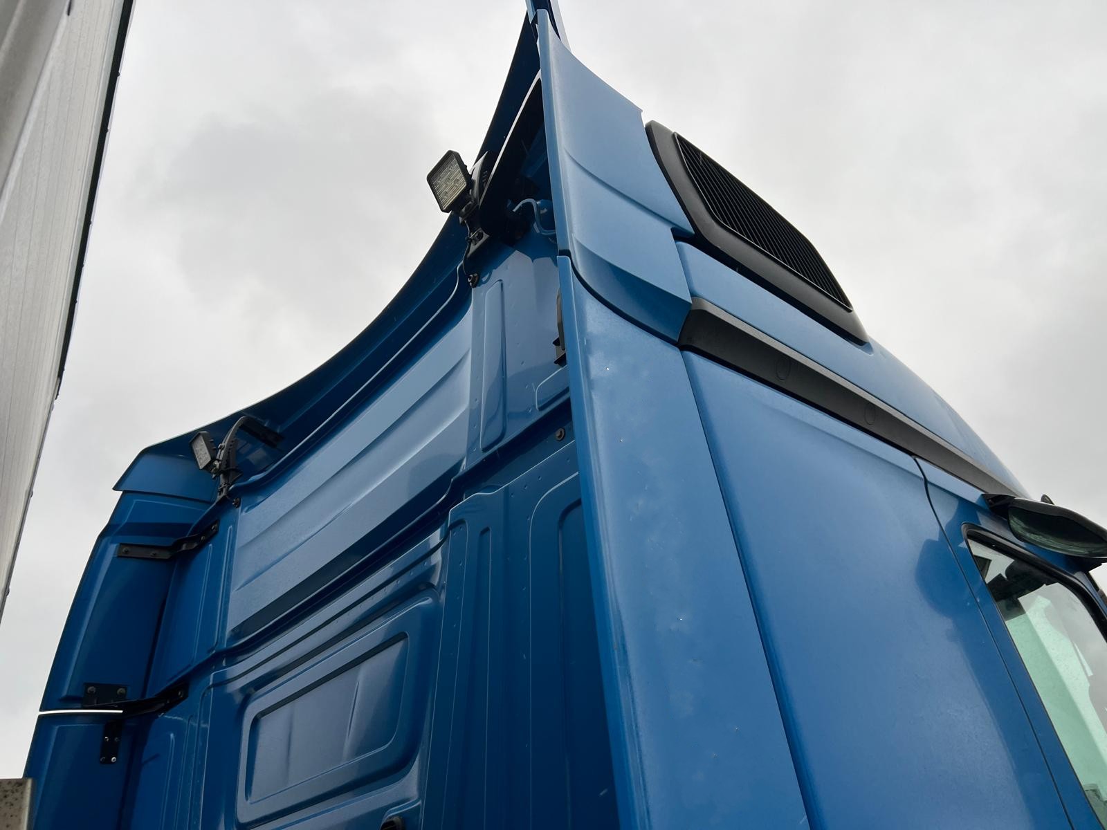Sovekabine førerhus - 1 køje - airkondition - Webasto Thermo Pro 50 3,8 kW motor/kabinevarmer - spoilersæt - køleskab LED arbejdes lygter bag på førerhus + LED lygter monteret trin kasser - luftpistol til rengøring af førerhus - mickrobølge ovn - inverter 24/220volt - fjernlygter på solskærm - RAL 5015 Himmelblau fabriks lakeret førerhus