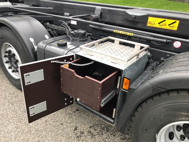 Udtag til pendelside samt aut.-bagsmæk. Olieudtag til saltspreder samt phv./kærre. VBG 795V kærretræk med luftservo. Værktøjskasse med kraftig hylde. Skovl og kost mont.