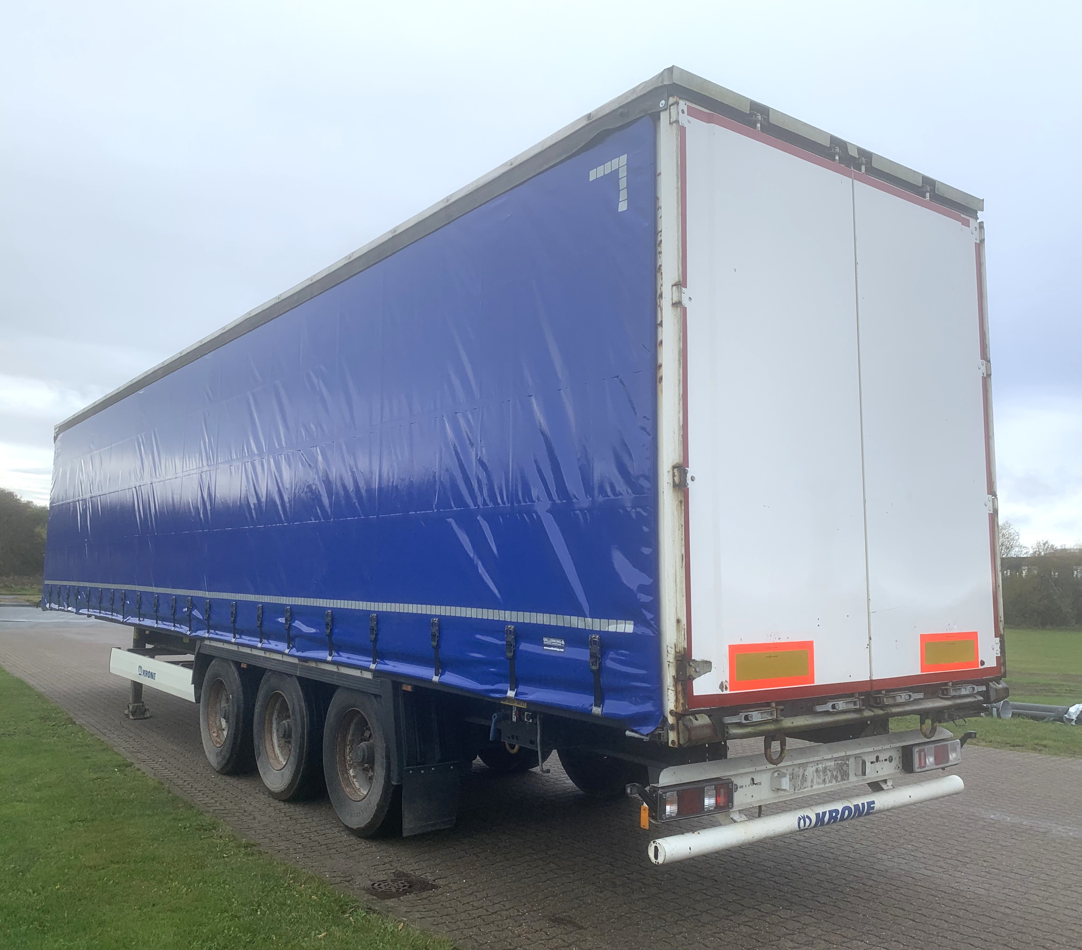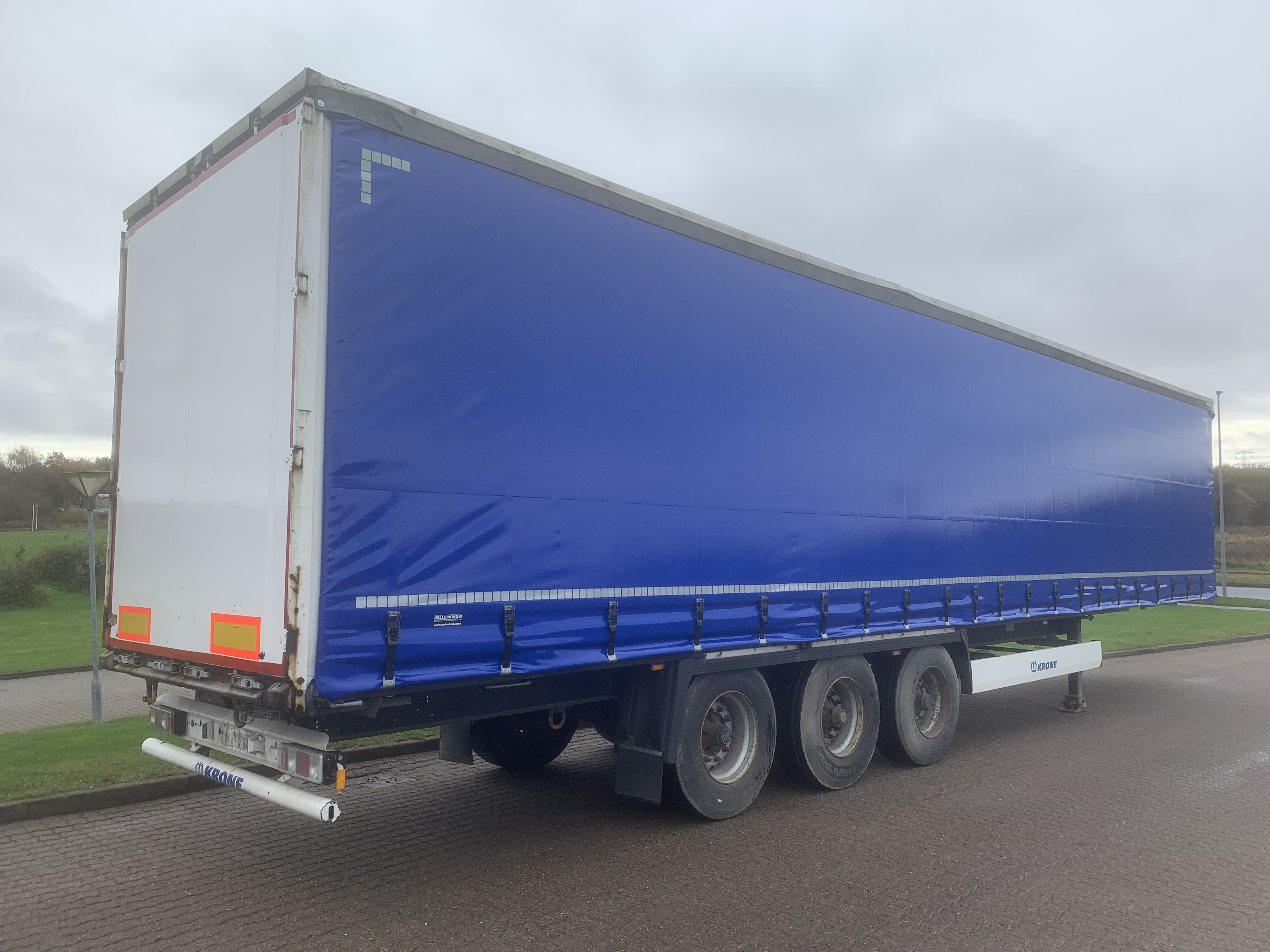 Pæn 3 akslet gardin trailer , med dobbeltdæk sidestolper , tværsgående dæk medfølger ikke, nye blå presenninger